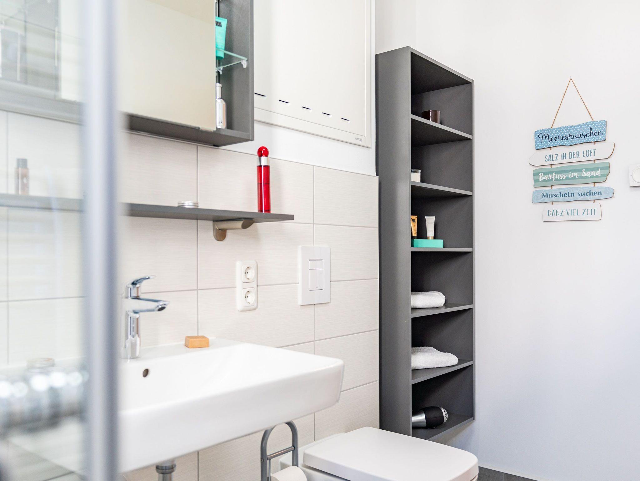 Das vollausgestattete Badezimmer verfügt über eine ebenerdige Dusche, WC, Waschtischanlage sowie Fön.