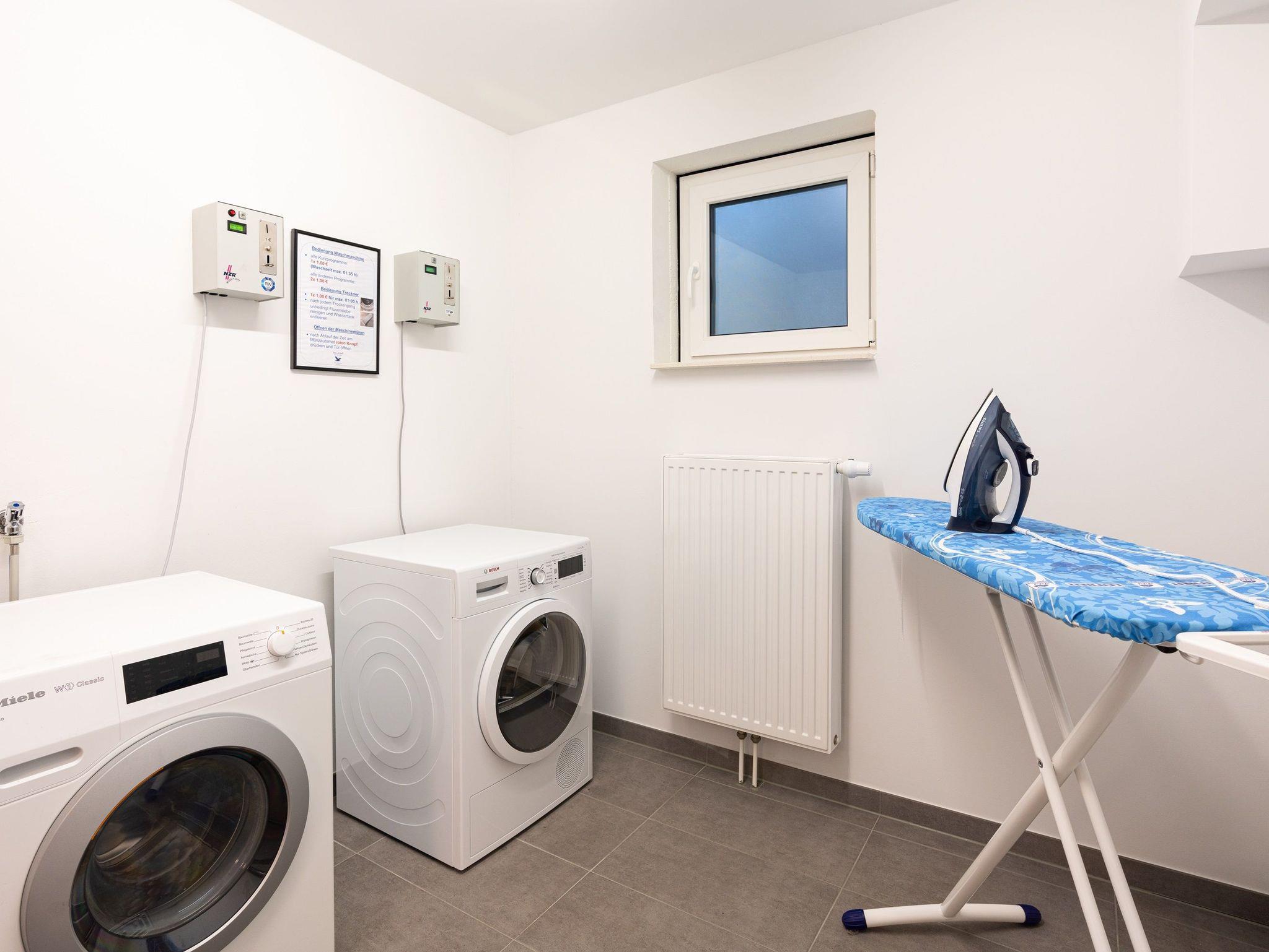 Die Wellness- und Freizeiteinrichtungen wie Sauna, Infrarotkabine, Ruheraum und ein Fitnessraum mit Tischtennisplatte sind im Souterrain des Hauses kostenfrei für alle Gäste des Hauses zugänglich. Zudem stehen Ihnen gegen Gebühr zwei Waschmaschinen und ein Trockner sowie eine Möglichkeit zum Bügeln zur Verfügung.