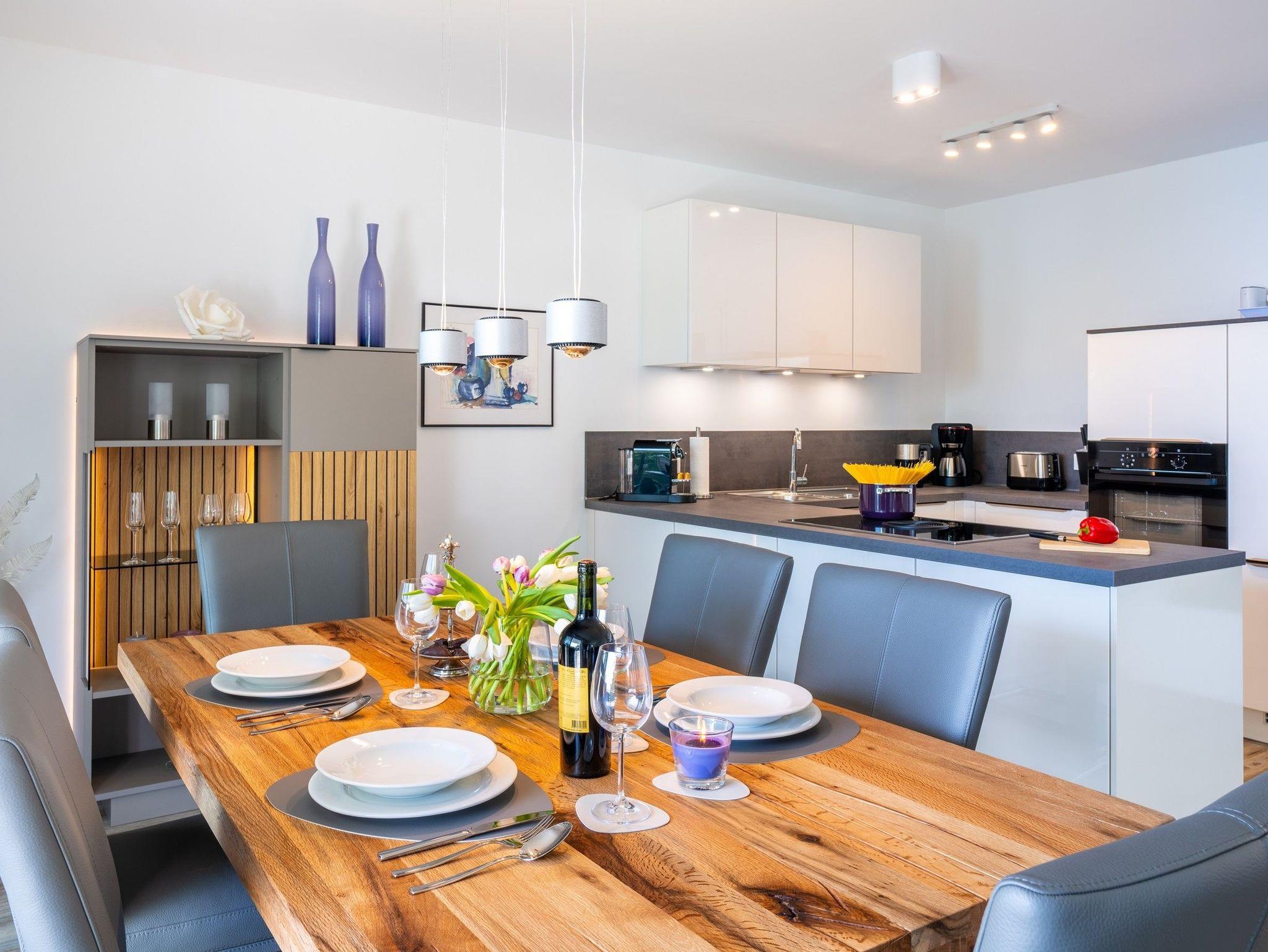 Die weiße Hochglanzküche von Nobilia ist umfassend ausgestattet mit schönem Porzellan, Kochgeschirr und allen notwendigen Küchenutensilien. Sie finden hier einen großen Kühlschrank mit separatem Gefrierfach, einen Backofen in Sichthöhe, eine Spülmaschine, eine Filterkaffeemaschine, einen Milchschäumer, eine Nespresso-Kapselmaschine, einen Toaster und einen Wasserkocher, sowie vieles mehr.