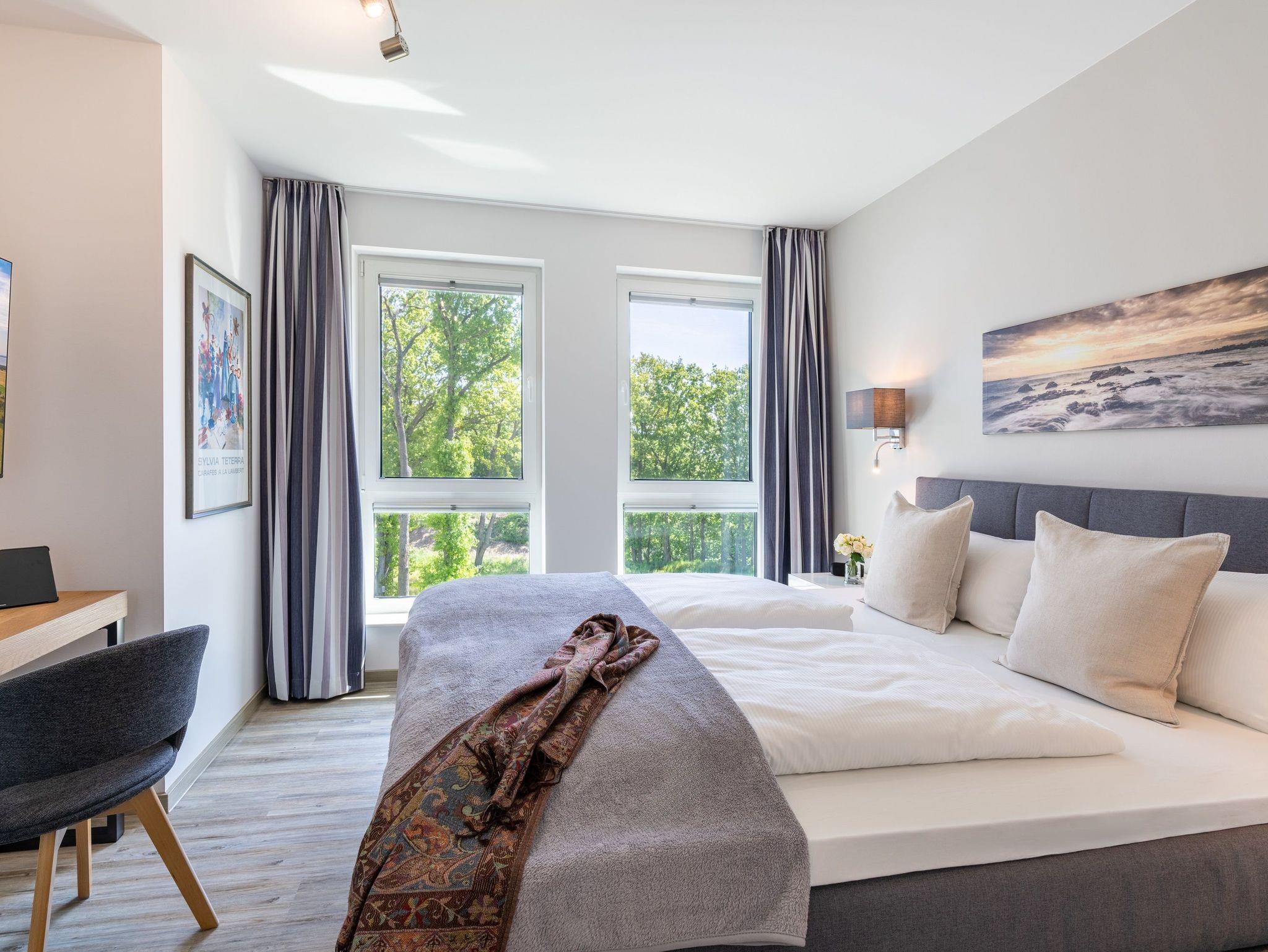 Im zweiten Schlafzimmer finden Sie ebenfalls ein komfortables Boxspringbett (180 x 200 cm), einen Kleiderschrank, einen Schreibtisch und einen Smart-TV vor.