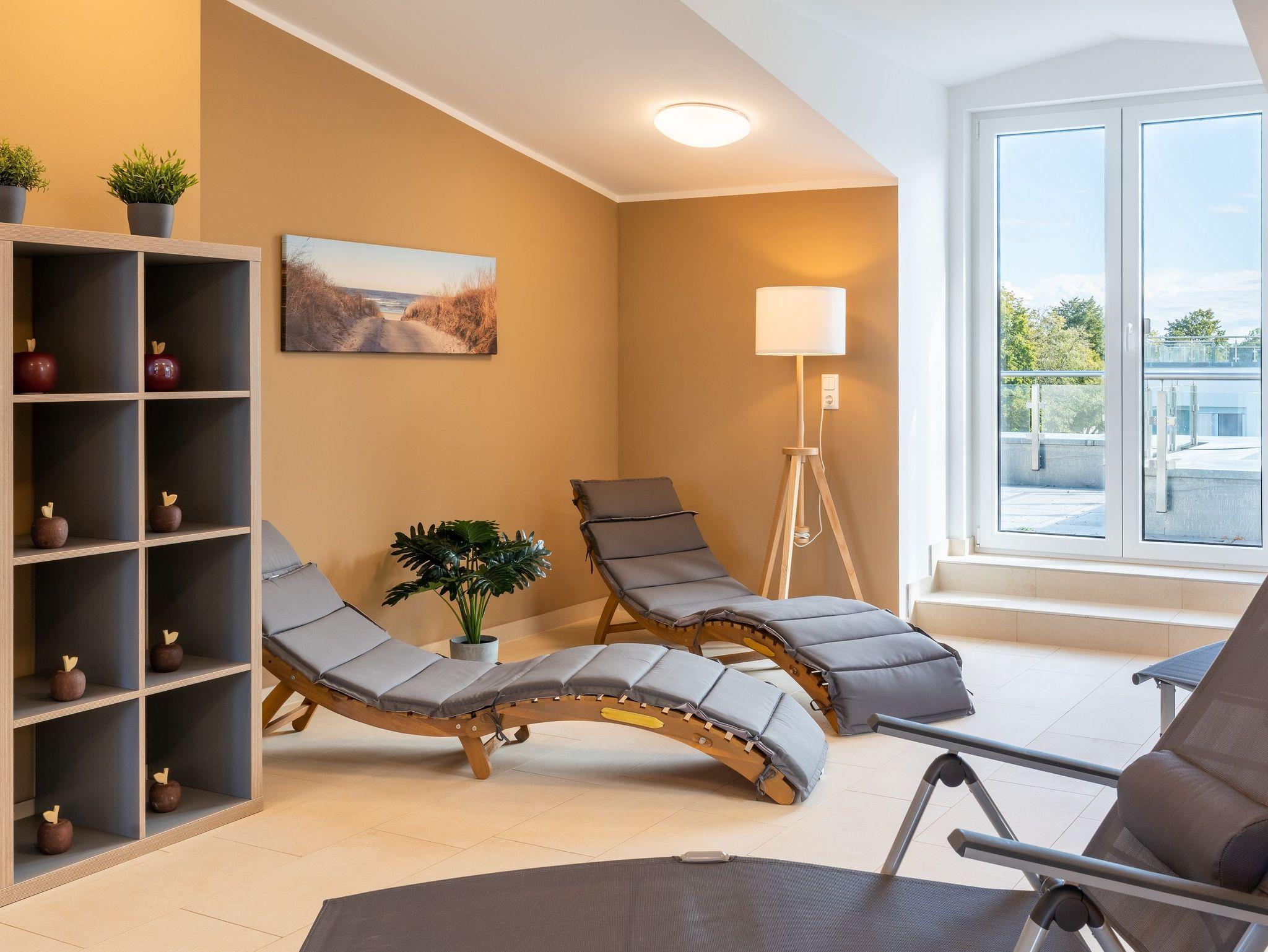 Weit ab von der Hektik und den Besuchermassen öffentlicher Wellnessangebote, finden Sie im Dachgeschoss des Hauses auf 190 m² die Ruhe, die Sie sich verdient haben. Entspannen Sie im hauseigenen, kostenfreien Wellnessbereich mit drei Saunen. Genießen Sie die klare Ostseeluft auf der großen angrenzenden Dachterrasse.