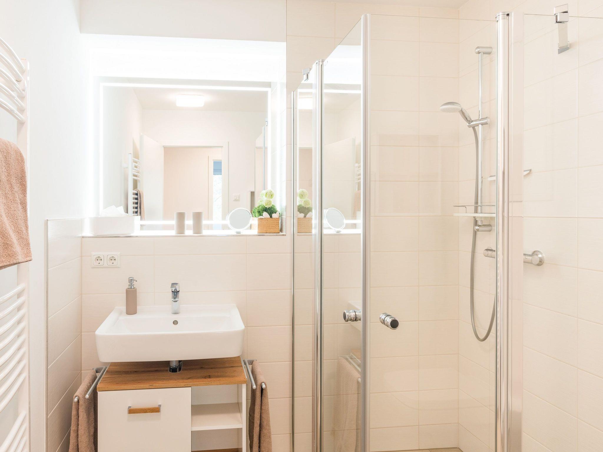 Das vollausgestattete Badezimmer verfügt über einen beheizbaren Handtuchhalter, ebenerdige Regendusche, WC, Waschtischanlage sowie Haartrockner. Ein Marken-Waschtrockner zur kostenfreien Nutzung komplettiert die Ferienunterkunft.