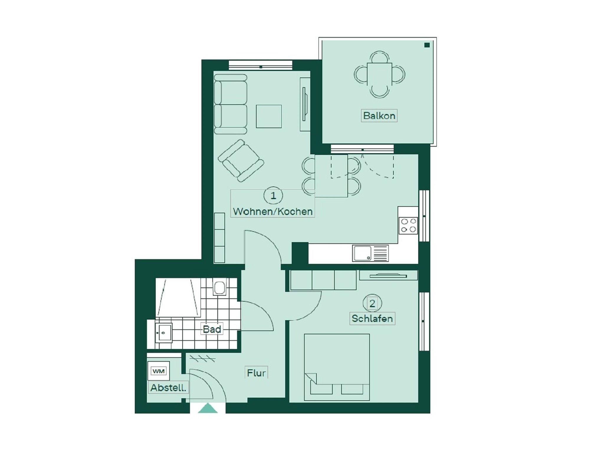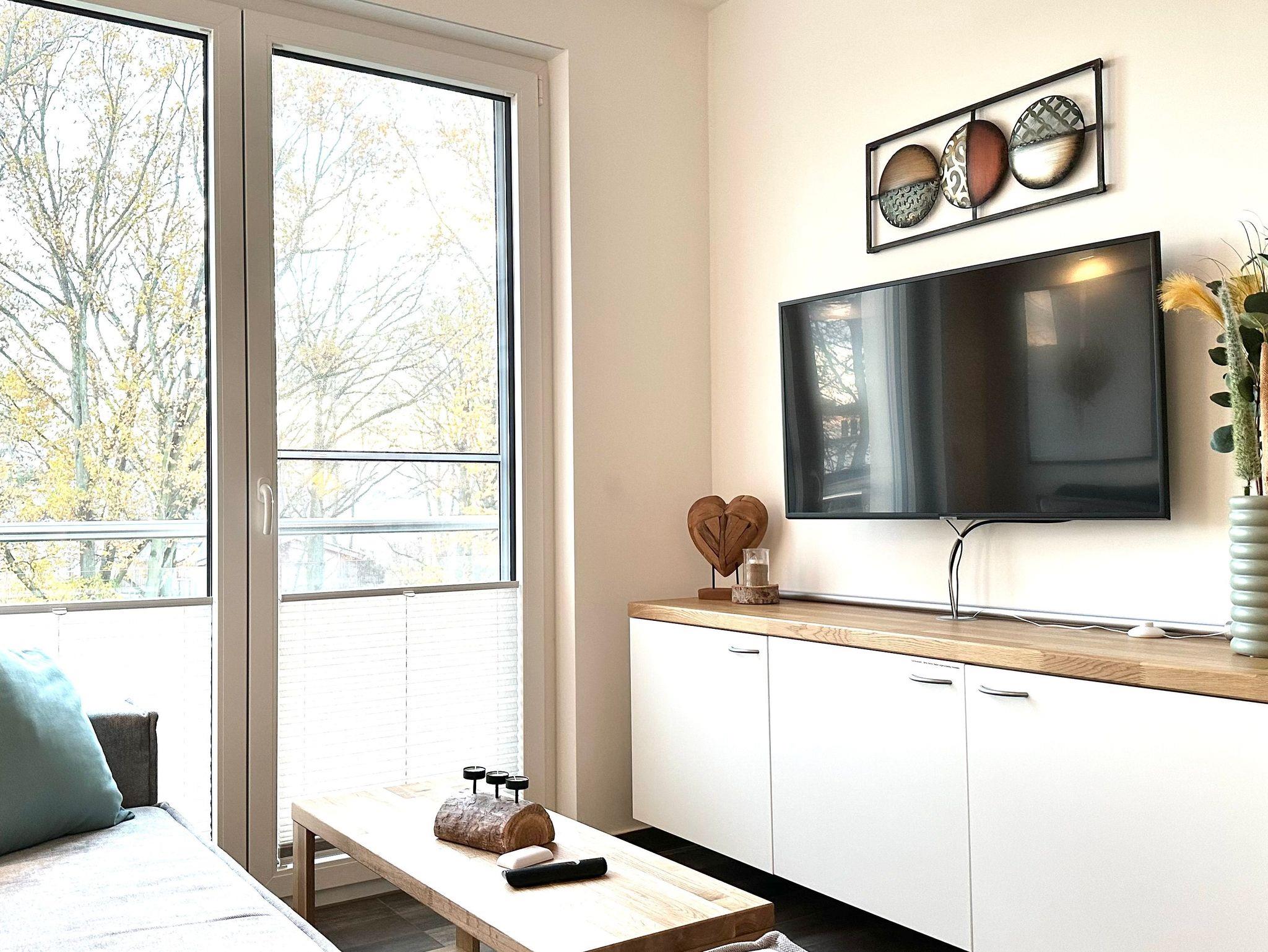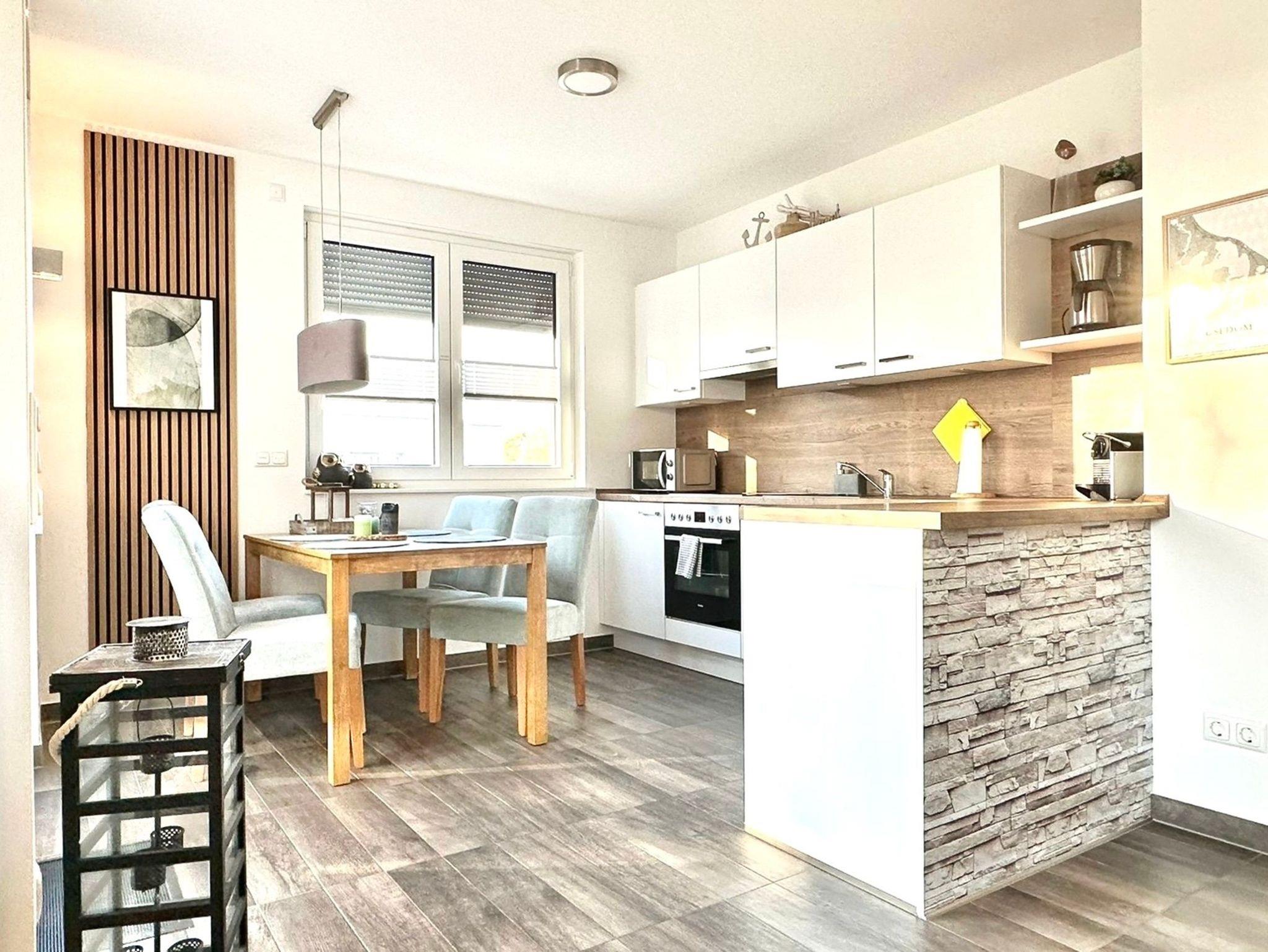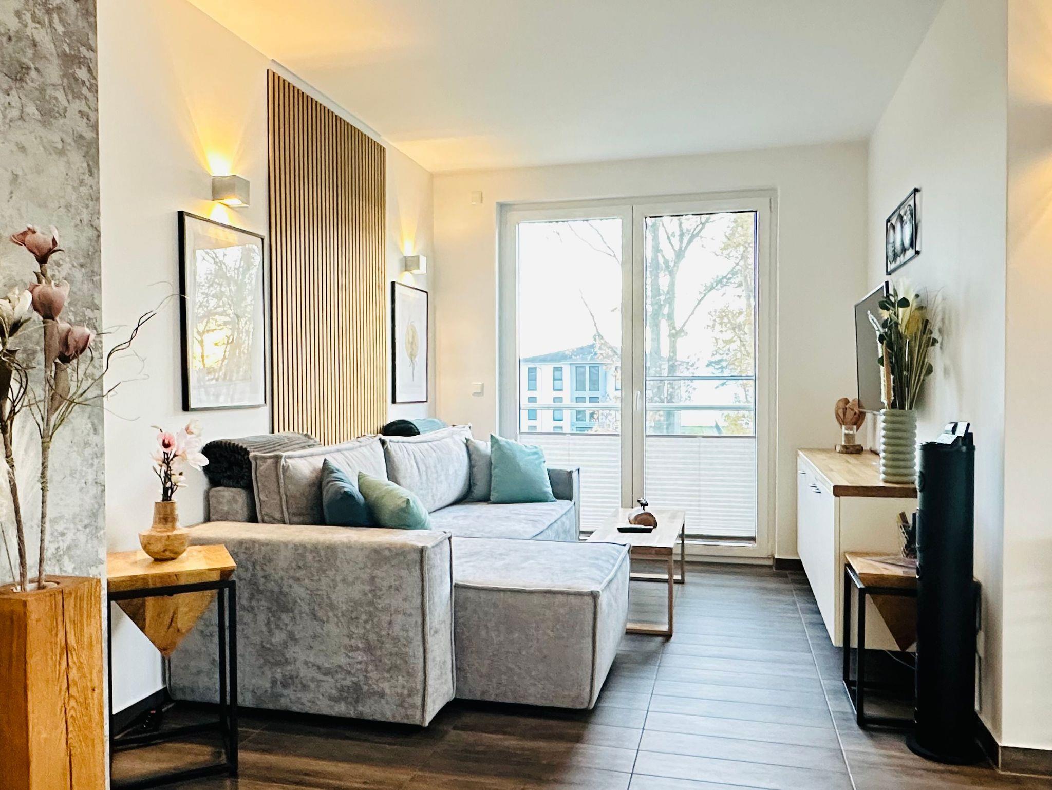Auf einer Wohnfläche von 63 m² finden drei Erwachsene und ein Kleinkind bis zwei Jahre (im Babybett) in dieser modern eingerichteten Ferienwohnung ausreichend Platz für einen entspannten Urlaub am Stettiner Haff auf Usedom.