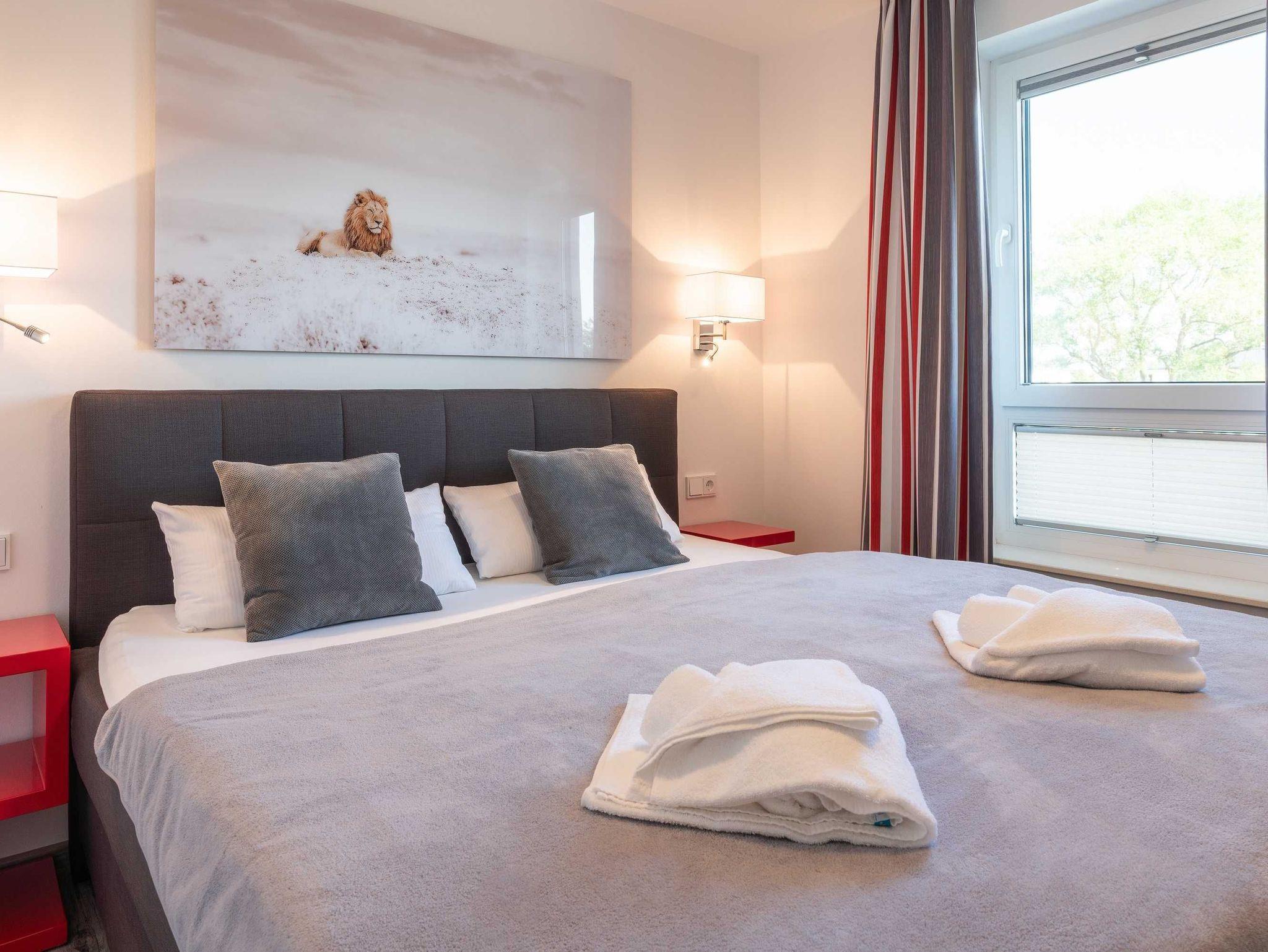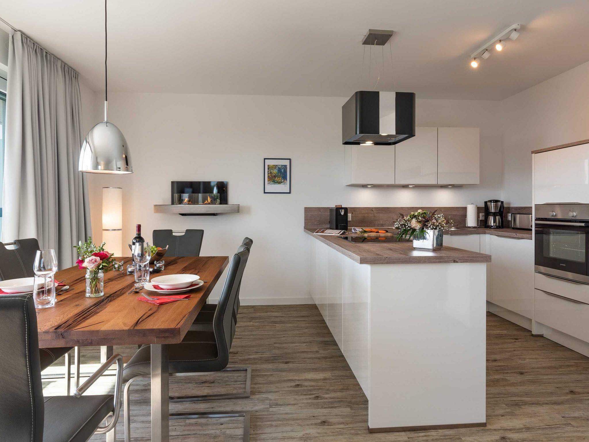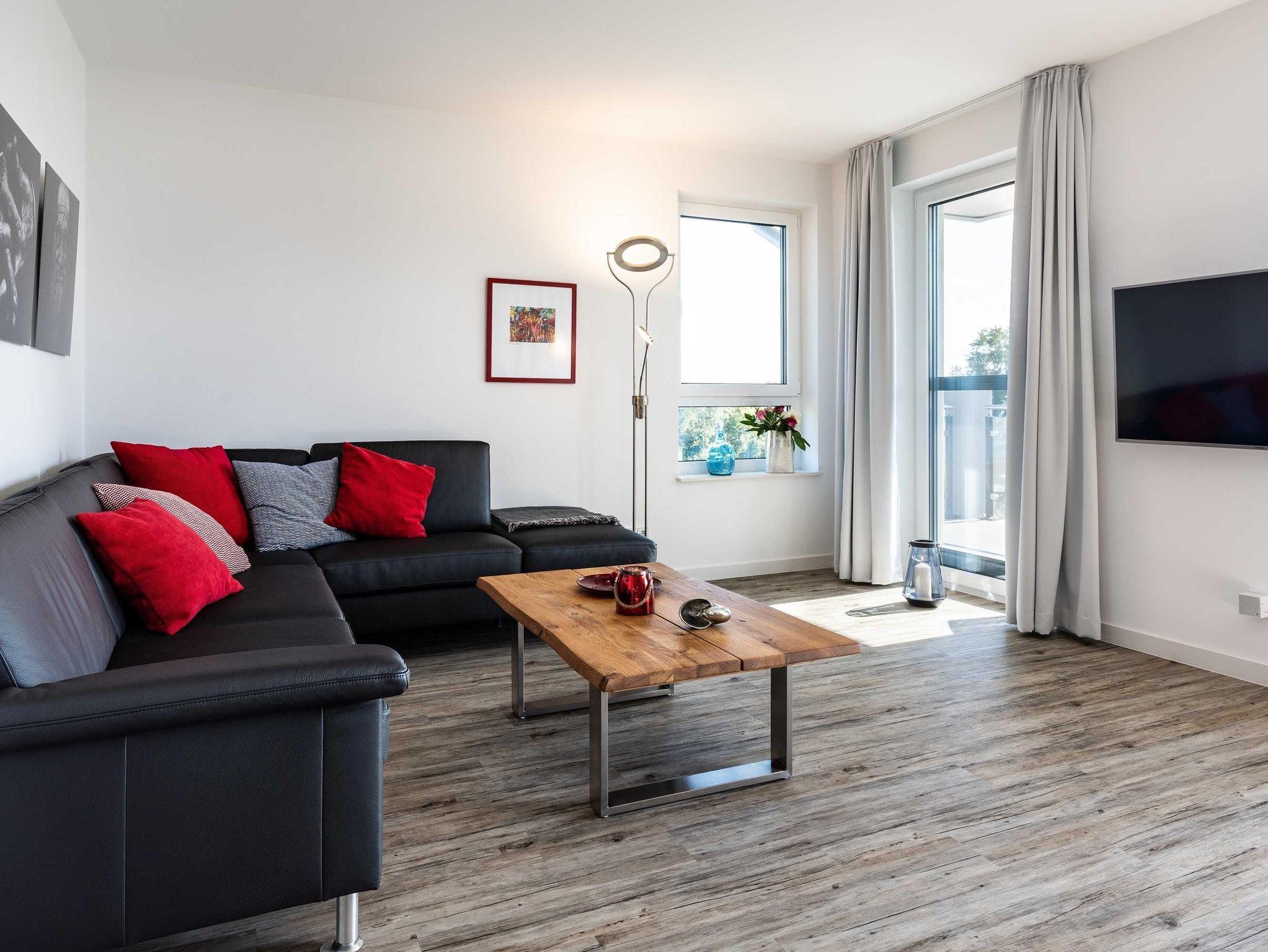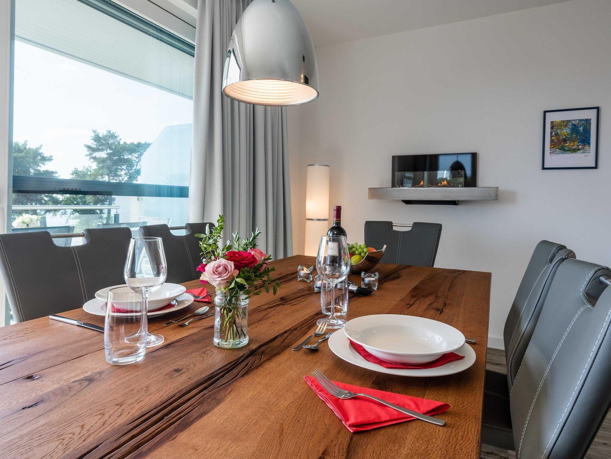 Diese lichtdurchflutete, helle 4-Zimmer-Wohnung im obersten Geschoss von Haus 3 (Aufzug vorhanden) mit Platz für maximal 6 Personen verfügt über eine Wohnfläche von 94 m² und hat 3 Schlafzimmer sowie 2 voll ausgestattete Duschbäder. Die große Sonnenterrasse mit 17 m² liegt in idealer Süd-Ausrichtung. Die Wohnung ist modern eingerichtet mit offenem Wohn-Essbereich, großem Esstisch, Ledersofa sowie Smart-TV (inkl. Sky-Abo). Die hochwertig ausgestattete Küche, offen zum Wohnbereich, lässt keine Wünsche offen. Erholsamer Schlaf in den beiden Schlafzimmern mit Boxspringbetten und Smart-TV ist garantiert. Im dritten Schlafzimmer befindet sich ein bequemes Schlafsofa (Liegefläche: 1,60 x 2,00 m), Schreibtisch und ein Smart-TV. Auf dem großen, überdachten Sonnenbalkon mit Essgruppe und zwei Relax-Sesseln, Fußhockern sowie einem Sonnenschirm können Sie die Seele baumeln lassen.