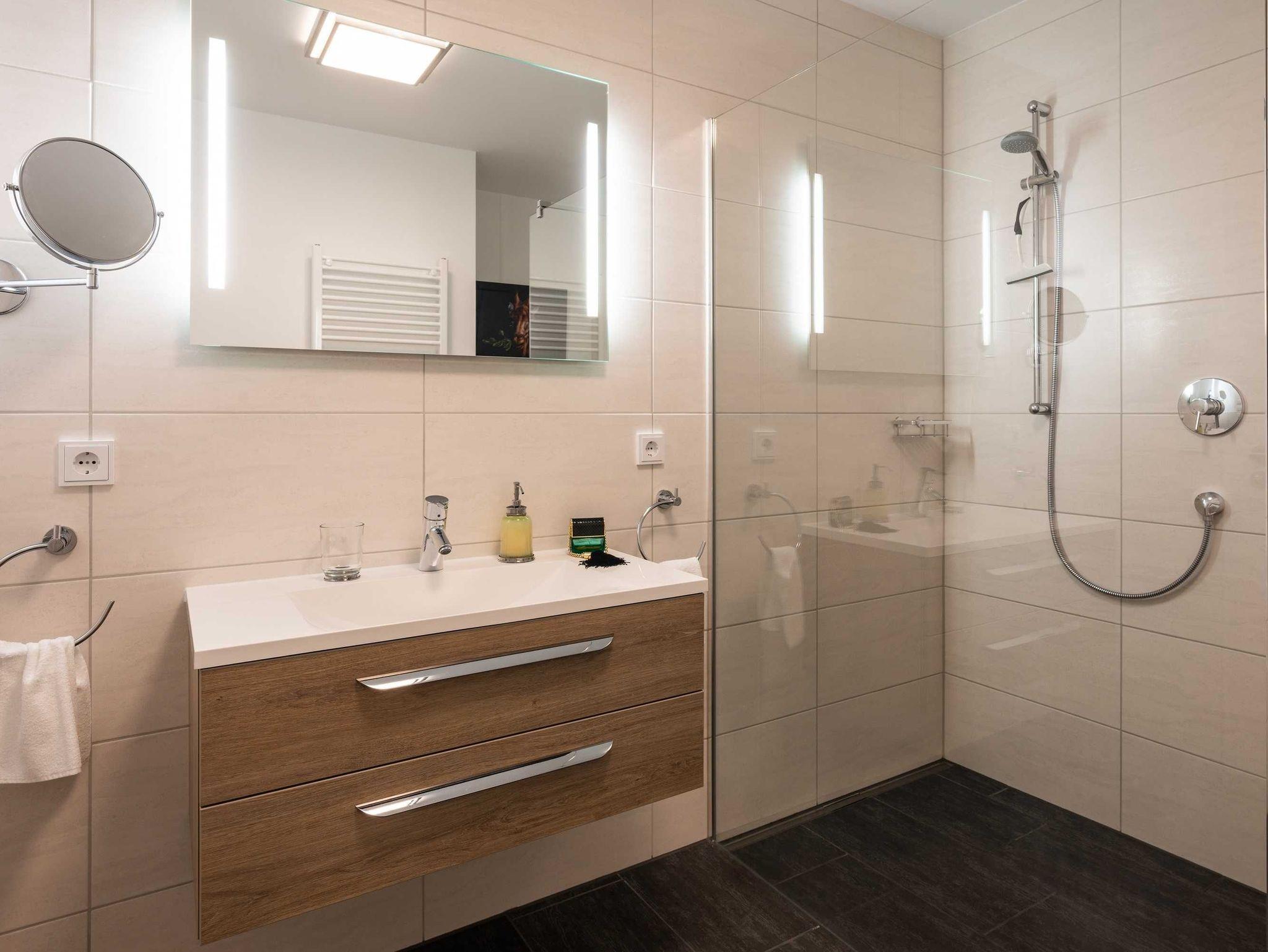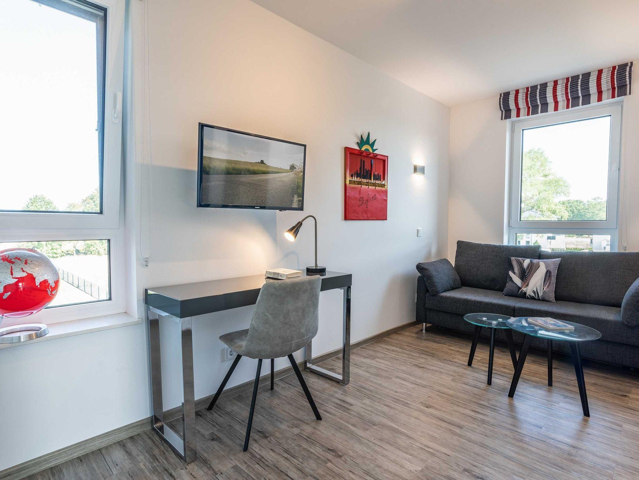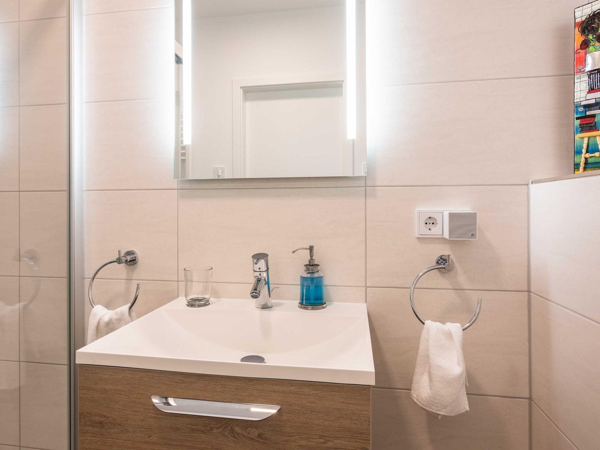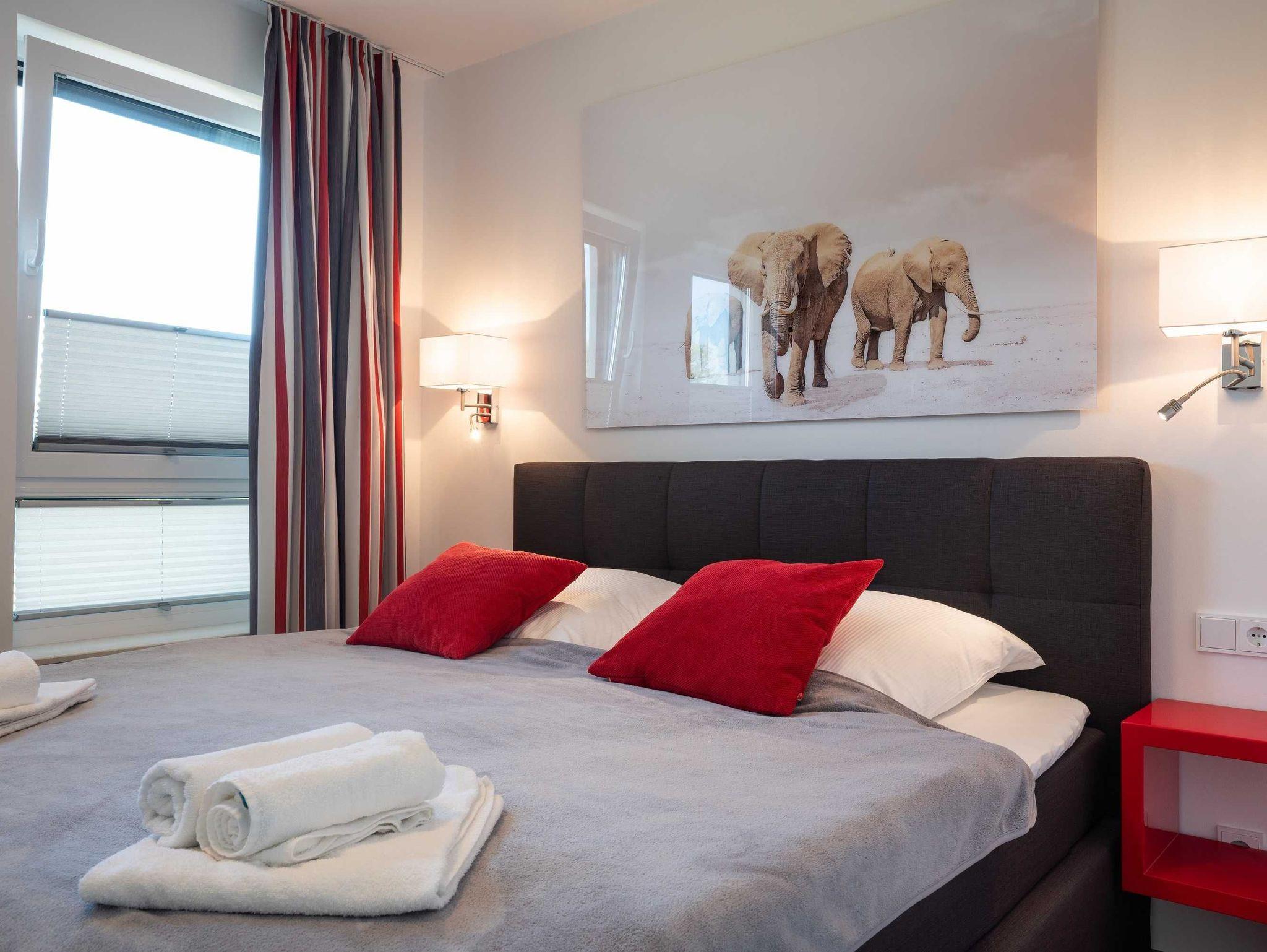 Diese lichtdurchflutete, helle 4-Zimmer-Wohnung im obersten Geschoss von Haus 3 (Aufzug vorhanden) mit Platz für maximal 6 Personen verfügt über eine Wohnfläche von 94 m² und hat 3 Schlafzimmer sowie 2 voll ausgestattete Duschbäder. Die große Sonnenterrasse mit 17 m² liegt in idealer Süd-Ausrichtung. Die Wohnung ist modern eingerichtet mit offenem Wohn-Essbereich, großem Esstisch, Ledersofa sowie Smart-TV (inkl. Sky-Abo). Die hochwertig ausgestattete Küche, offen zum Wohnbereich, lässt keine Wünsche offen. Erholsamer Schlaf in den beiden Schlafzimmern mit Boxspringbetten und Smart-TV ist garantiert. Im dritten Schlafzimmer befindet sich ein bequemes Schlafsofa (Liegefläche: 1,60 x 2,00 m), Schreibtisch und ein Smart-TV. Auf dem großen, überdachten Sonnenbalkon mit Essgruppe und zwei Relax-Sesseln, Fußhockern sowie einem Sonnenschirm können Sie die Seele baumeln lassen.