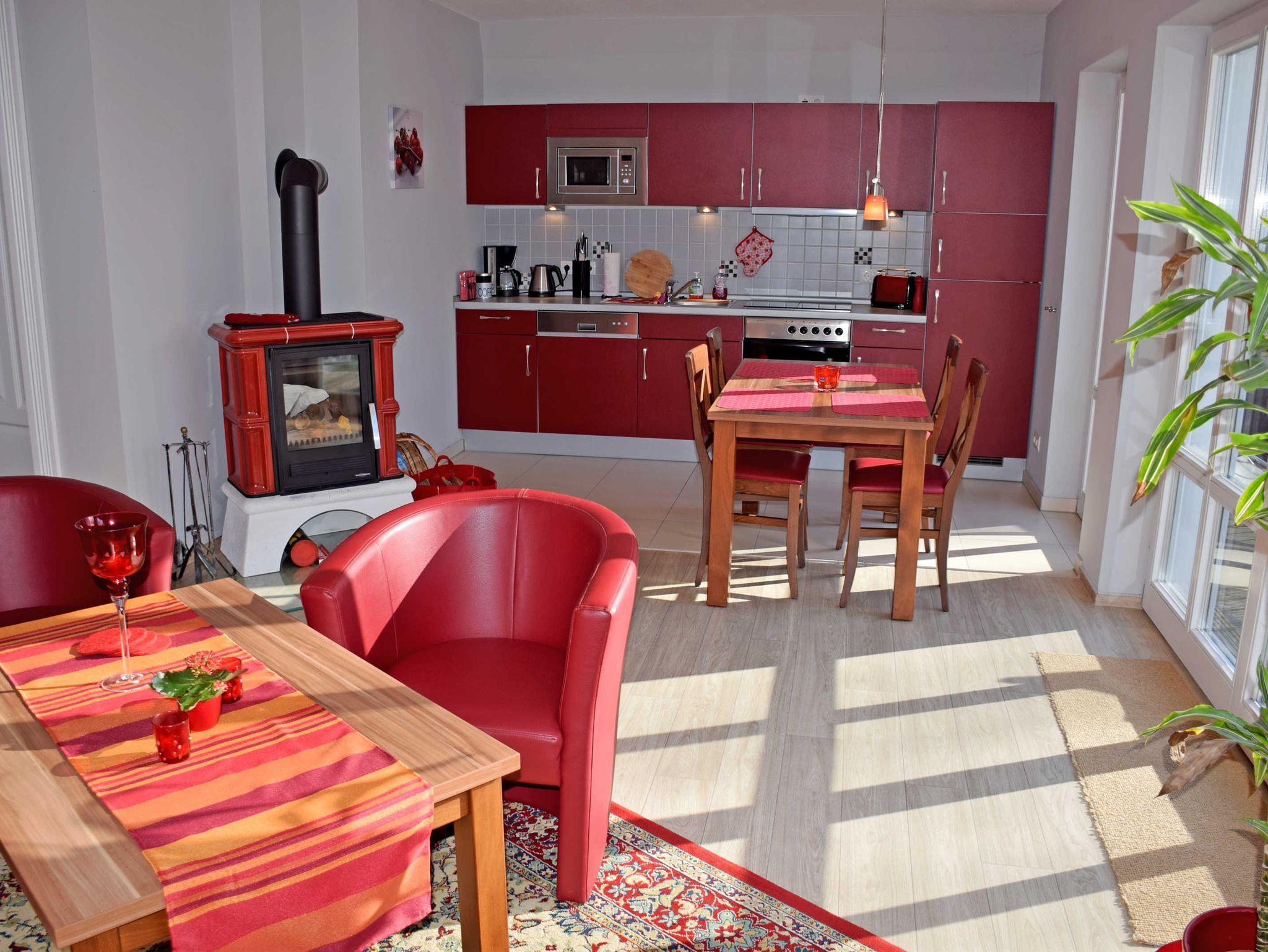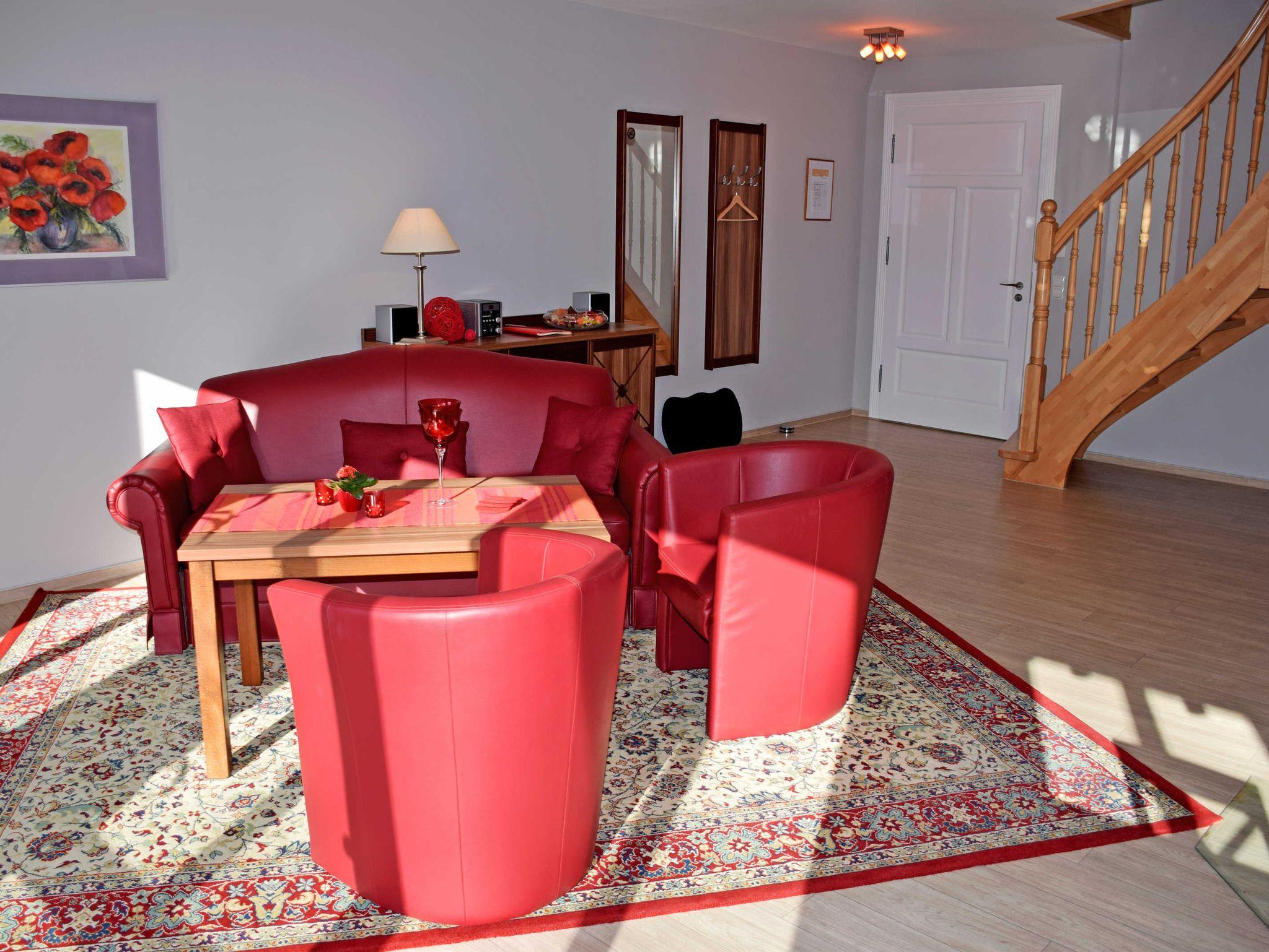 Unsere ruhig gelegenen Ferienappartements I (100 qm, 4 Erwachsene und ein Kind bis max. 14 J.) befinden sich direkt im Gutshaus in der ersten Etage und führen über eine Treppe innerhalb der Wohnung ins Dachgeschoss (Maisonette). Sie verfügen über eine angenehme Fußbodenheizung. Die gemütliche und zugleich komfortable Einrichtung in diesem Appartement machen auch einen längeren Aufenthalt zu einem angenehmen Erlebnis. Der Internetzugang über W-Lan ist im Appartement verfügbar.