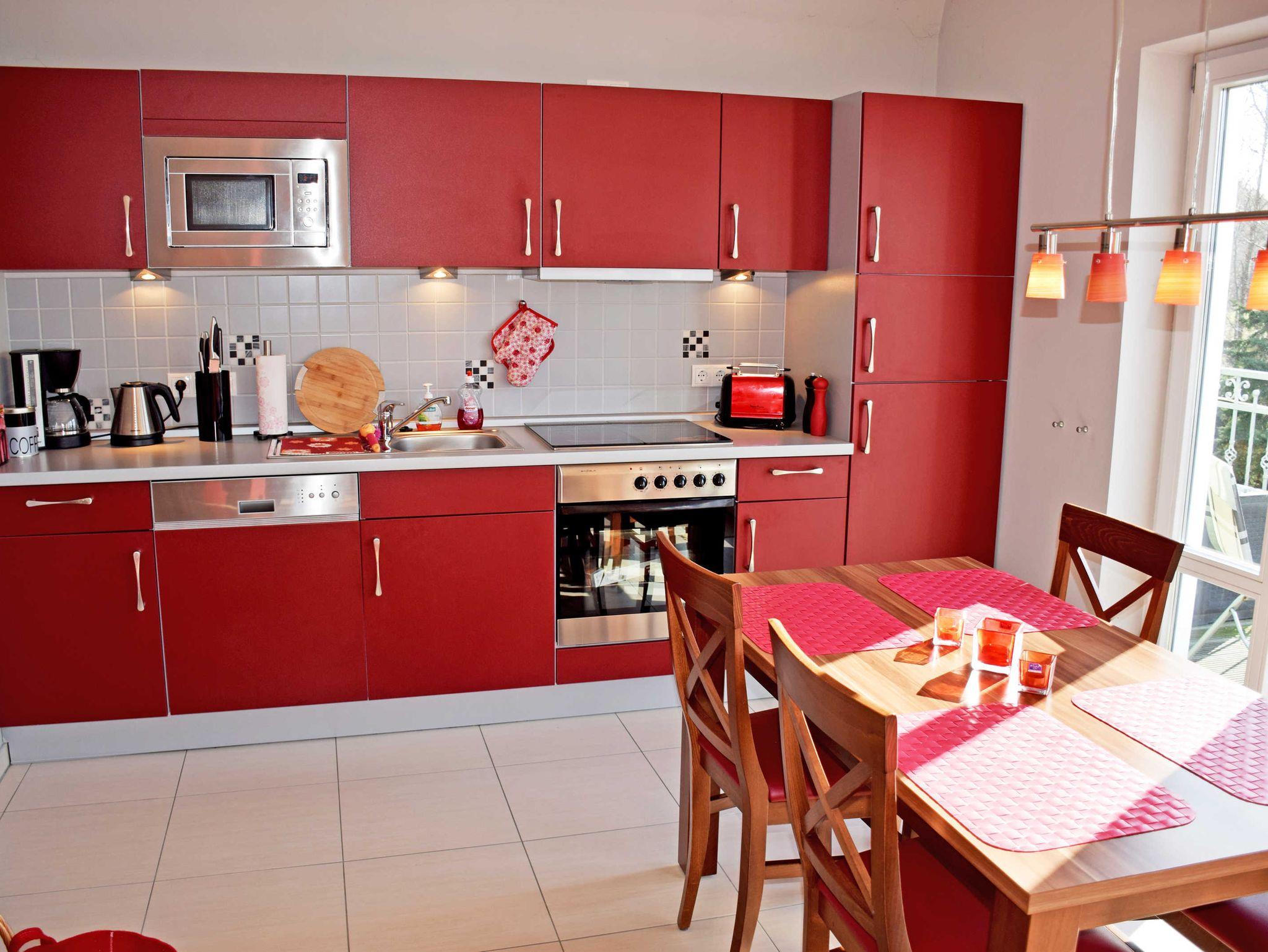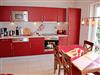 Die offene Küche ist mit Ceran-Herd, Backofen, Geschirrspüler, Kühlschrank, Mikrowelle, Kaffeemaschine, Wasserkocher und weiterem umfangreichem Zubehör komplett eingerichtet.