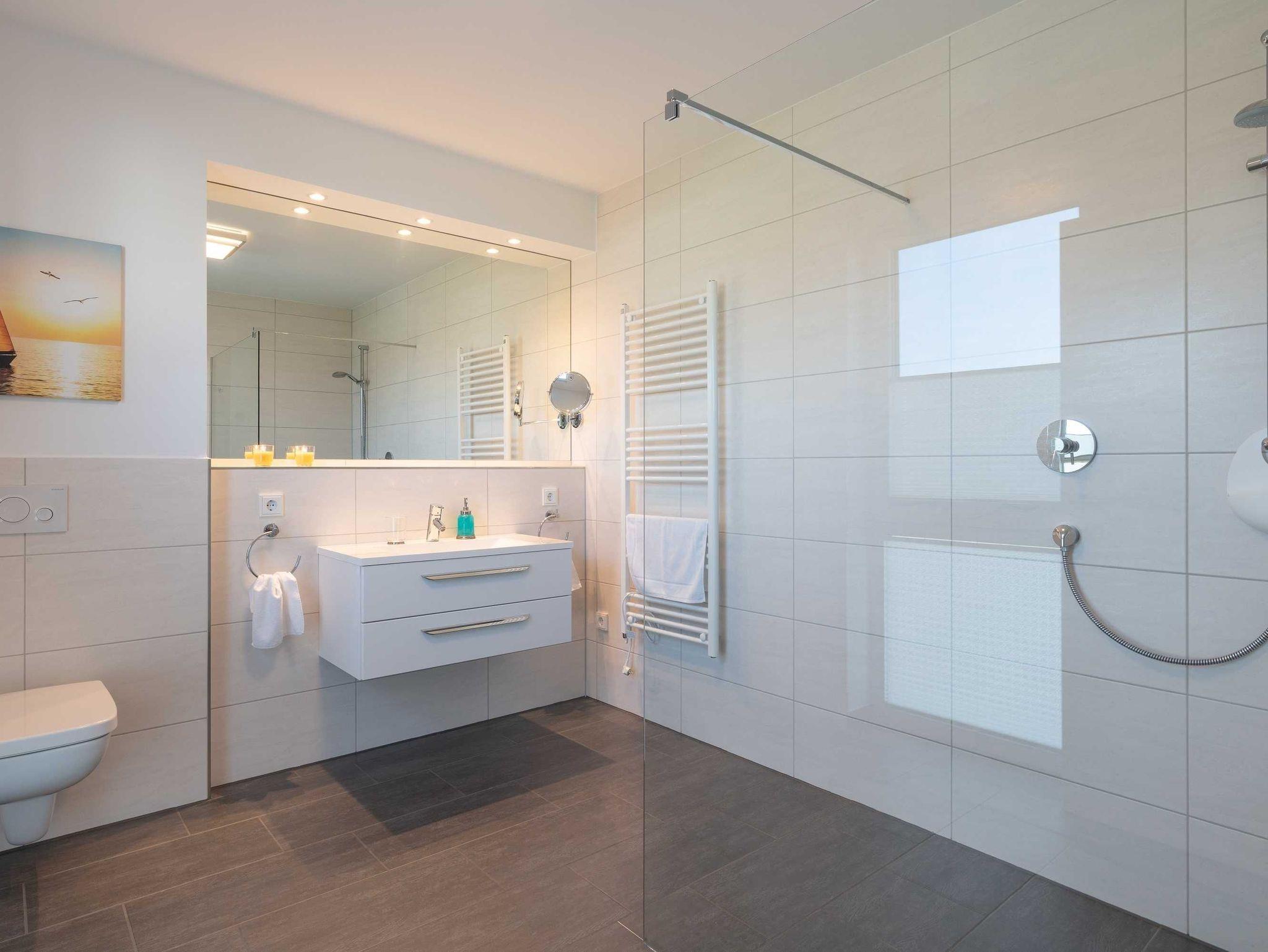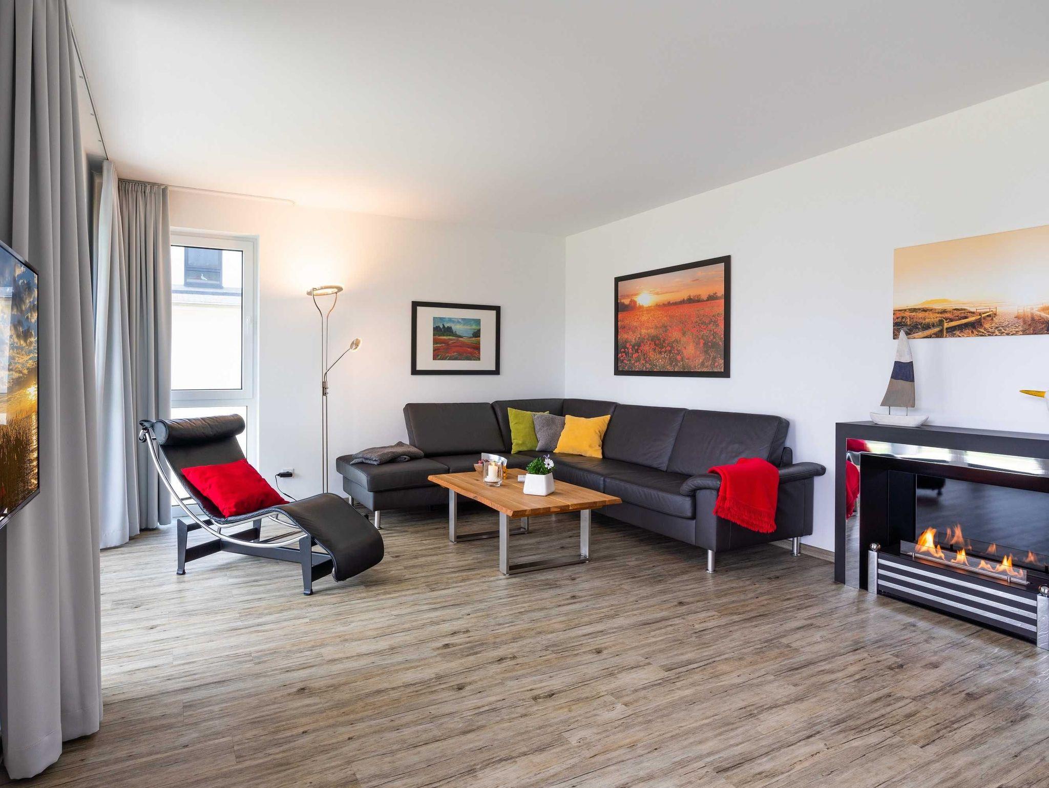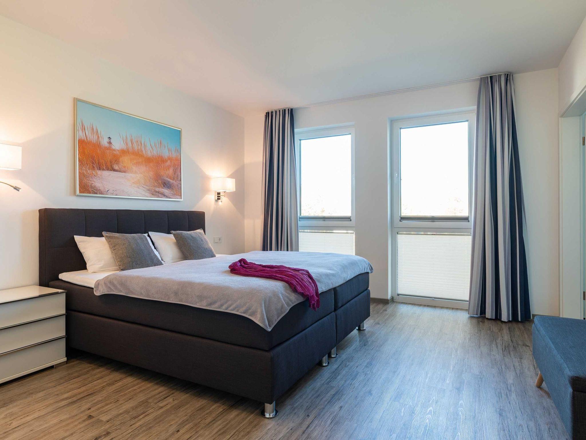 Diese luxuriöse 4-Zimmer-Wohnung im ersten Obergeschoss von Haus 3 (Aufzug vorhanden) mit Platz für maximal 6 Personen sowie einem Kleinkind bis 2 Jahre im Babybett verfügt über eine Wohnfläche von 119 m² und hat 3 Schlafzimmer sowie 2 voll ausgestattete Duschbäder. Die große Sonnenterrasse mit 17 m² liegt in idealer Süd-Ausrichtung. Die Wohnung ist modern eingerichtet mit offenem Wohn-Essbereich, großem Esstisch, Ledersofa sowie Smart-TV (inkl. Sky-Abo). Die hochwertig ausgestattete Küche, offen zum Wohnbereich, lässt keine Wünsche offen. Erholsamer Schlaf in den beiden Schlafzimmern mit Boxspringbetten und Smart-TV ist garantiert. Im dritten Schlafzimmer befindet sich ein bequemes Schlafsofa (Liegefläche: 1,80 x 2,00 m) und ein Smart-TV. Das Badezimmer en Suite ist mit einer begehbaren Dusche ausgestattet. Auf dem großen, überdachten Sonnenbalkon mit Essgruppe und zwei Relax-Sesseln, Fußhockern sowie einem Sonnenschirm können Sie die Seele baumeln lassen.