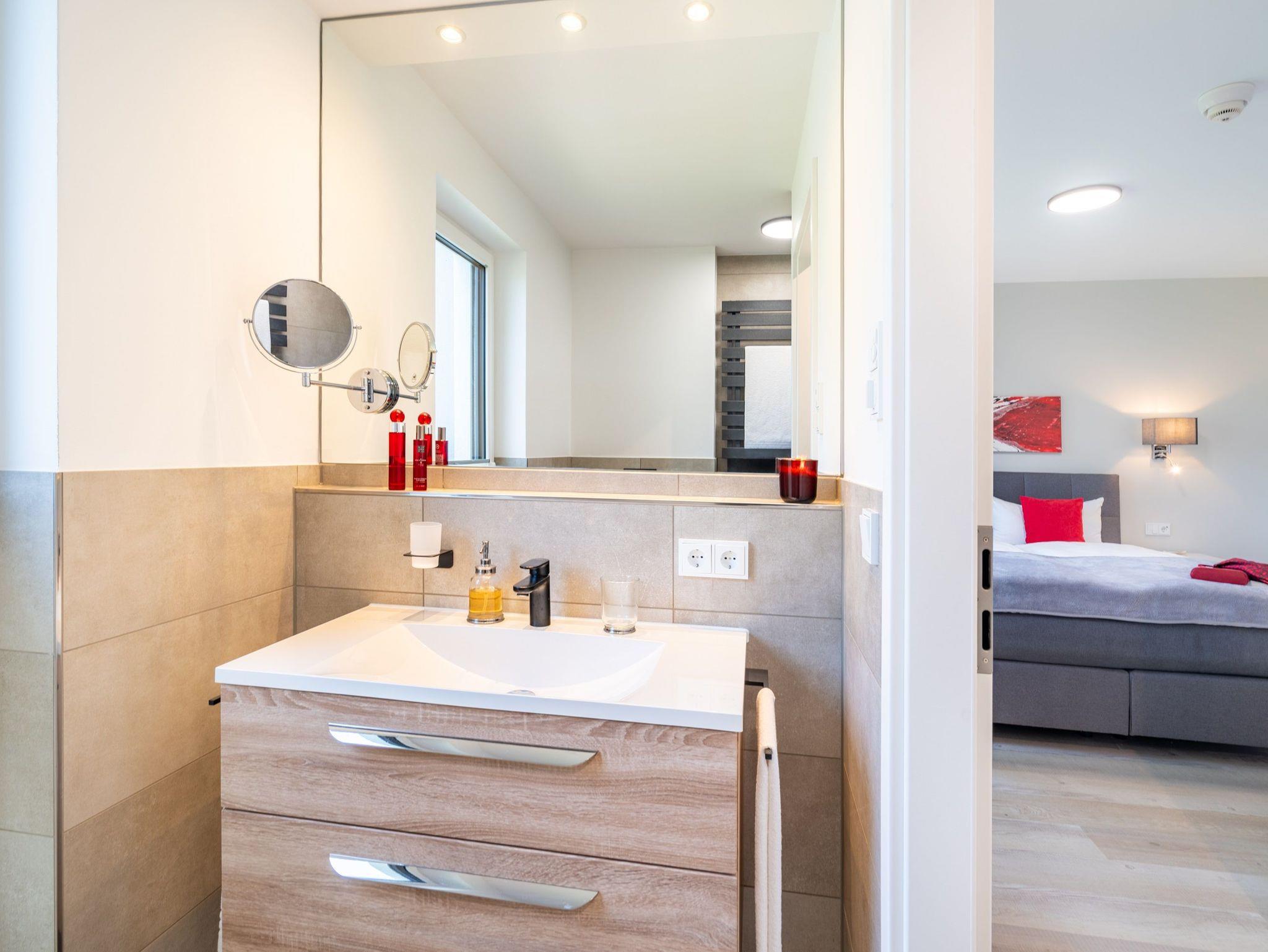 Informationen für Gäste mit Mobilitätseinschränkung: Der Zugang vom Carportstellplatz bis zum Hauseingang ist barrierefrei gestaltet. Direkt vor dem Haus befindet sich eine Kurzzeitparkfläche, die für Be- und Entladevorgänge genutzt werden kann. Die Distanz von der Carportanlage bis zur Hauseingangstür beträgt etwa 30 Meter. Die Breite der Haustür beträgt 100 cm und weist eine Schwelle von etwa 1,5 cm Höhe auf. Der Aufzug im Treppenhaus bedient alle Etagen des Hauses, einschließlich des Freizeit- und Saunabereichs im Untergeschoss. Die Türbreite des Aufzugs beträgt 90 cm, die Tiefe liegt bei 130 cm. Die schwellenlose Wohnungstür weist eine Breite von 90 cm auf. Die Breiten der schwellenlosen Zimmertüren liegen bei 80 cm (Ausnahme: Türbreite von der Abstellkammer beträgt 70 cm). Der schwellenlose Duscheingang im en suite Badezimmer weist eine Breite von 90 cm auf, die Tiefe liegt bei 200 cm. Auf Wunsch kann ein Duschhocker kostenfrei zur Verfügung gestellt werden. Die Waschtische sind nicht unterfahrbar und Haltegriffe sind nicht in den Badezimmern vorhanden. Der Duscheingang im zweiten Badezimmer weist eine Breite von 90 cm auf. Die Höhe der Duschtasse beträgt 1 cm. Die Betten weisen eine Höhe von 65 cm auf und sind unterfahrbar (max. 10 cm). Die Terrassenschiebetür lässt sich auf eine Breite von 130 cm öffnen, die Höhe der Schwelle beträgt 1,5 cm. Die Sauna im Untergeschoss ist schwellenlos erreichbar. Die Schwelle am Saunaeingang beträgt 10 cm, die Breite der Saunatür beträgt 60 cm. Die Breite der Tür zum Ruheraum beträgt 90 cm und weist eine Schwelle von etwa 2 cm auf.