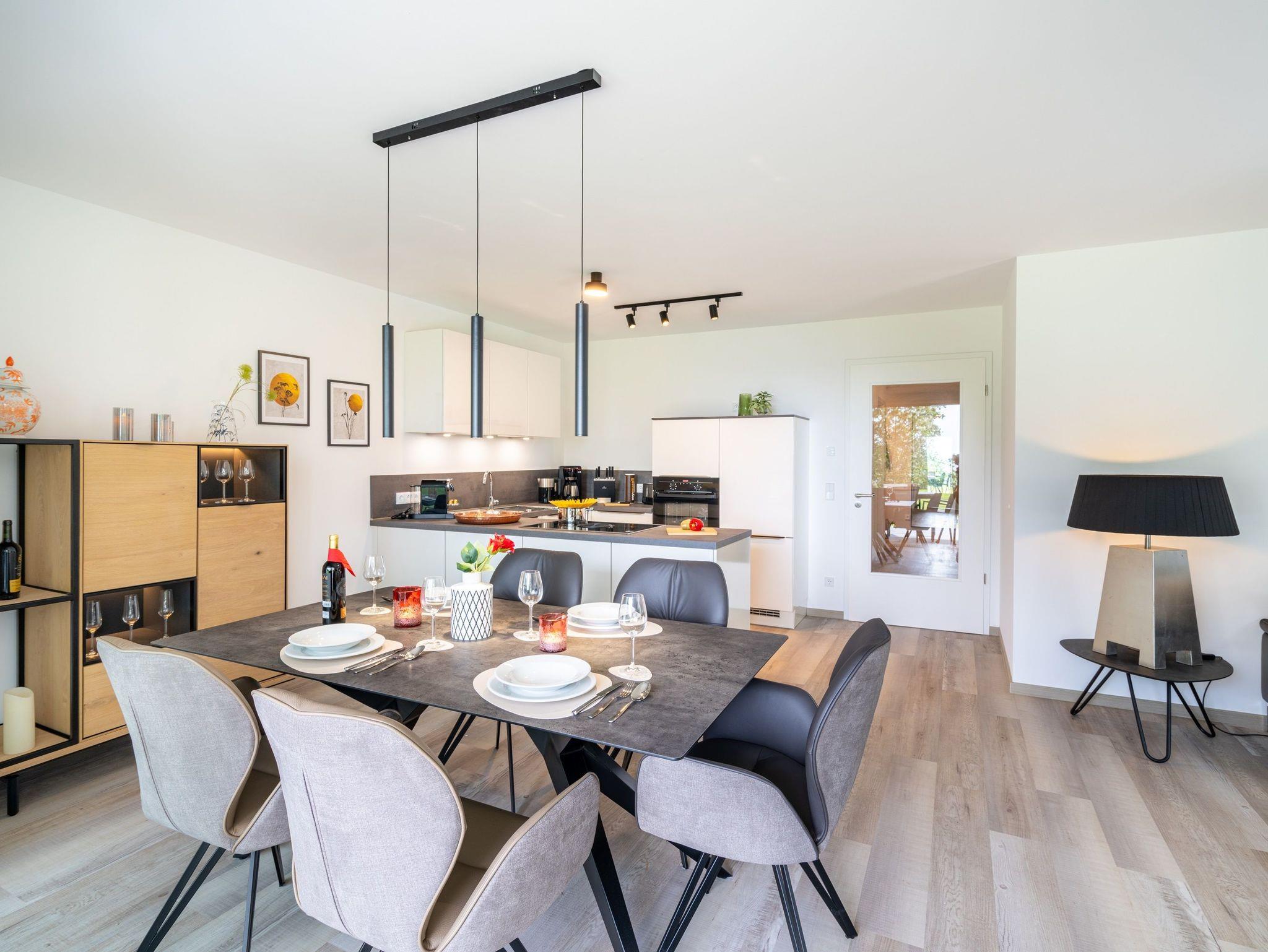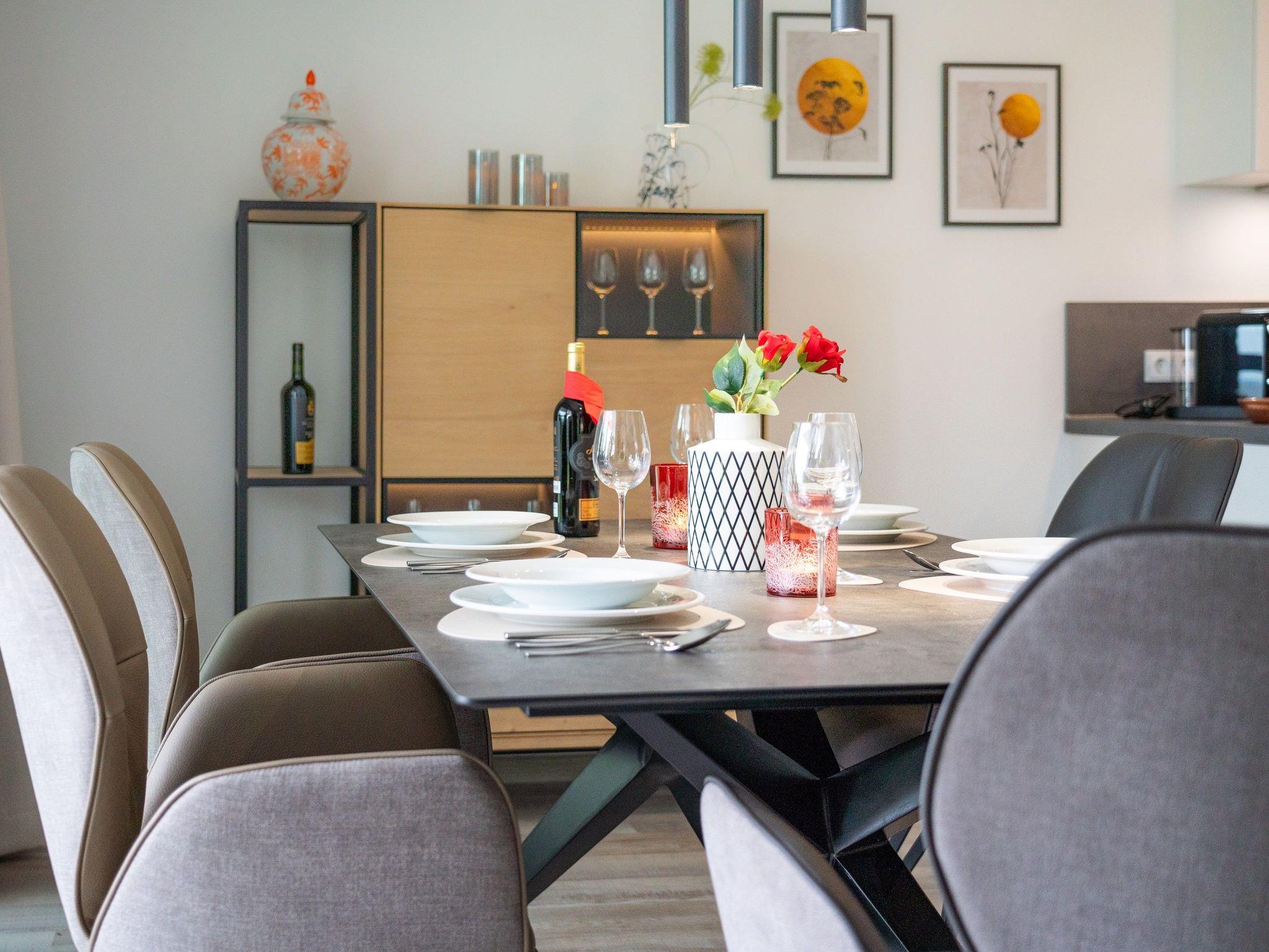 Eine Essgruppe mit Lederstühlen, ein bequemes Eckledersofa und ein Ledersessel vervollständigen die hochwertige und geschmackvolle Einrichtung.