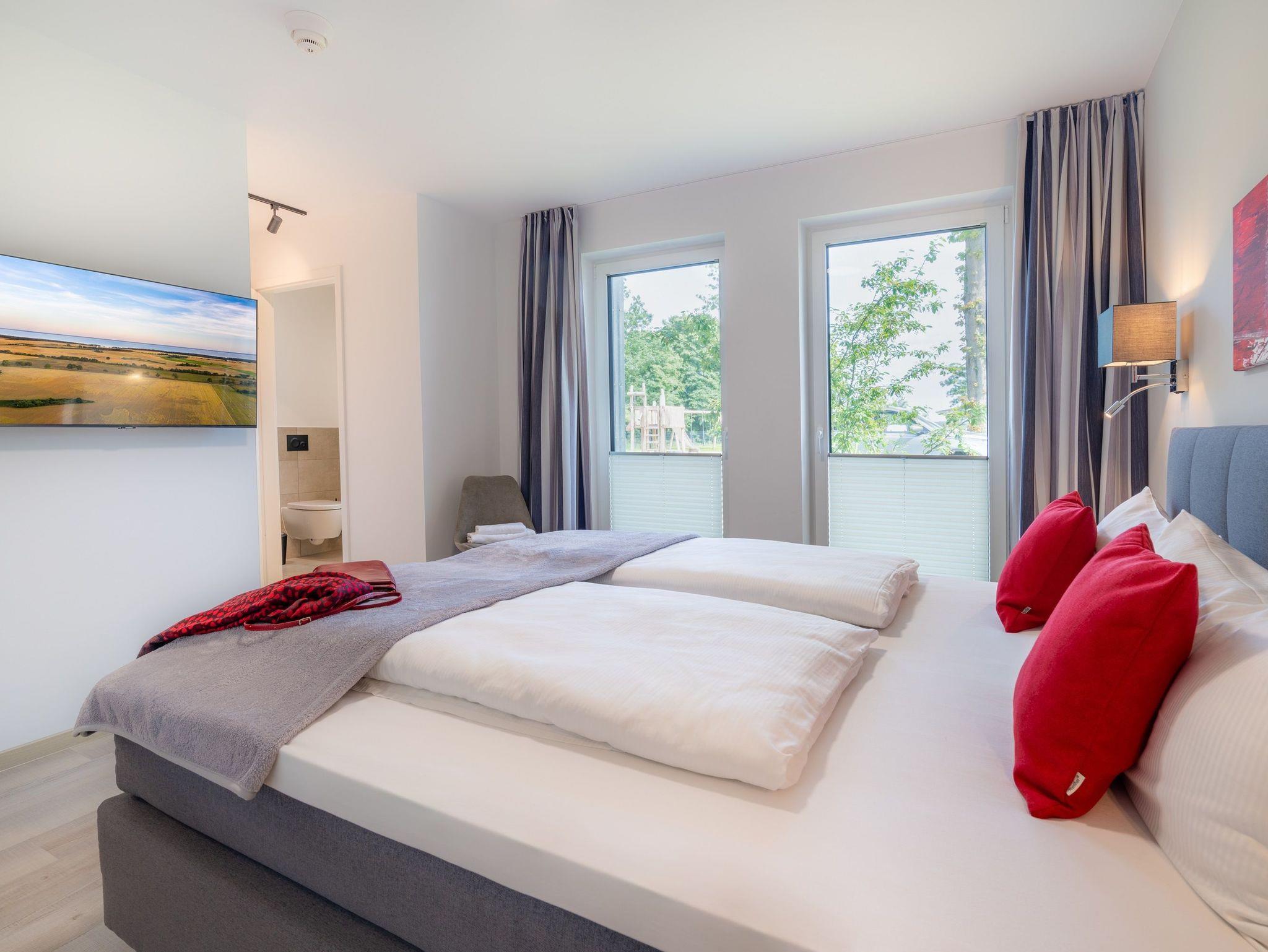 Im zweiten Schlafzimmer finden Sie ebenfalls ein komfortables Boxspringbett (180 x 200 cm), einen Kleiderschrank, einen Schreibtisch und einen Smart-TV vor.