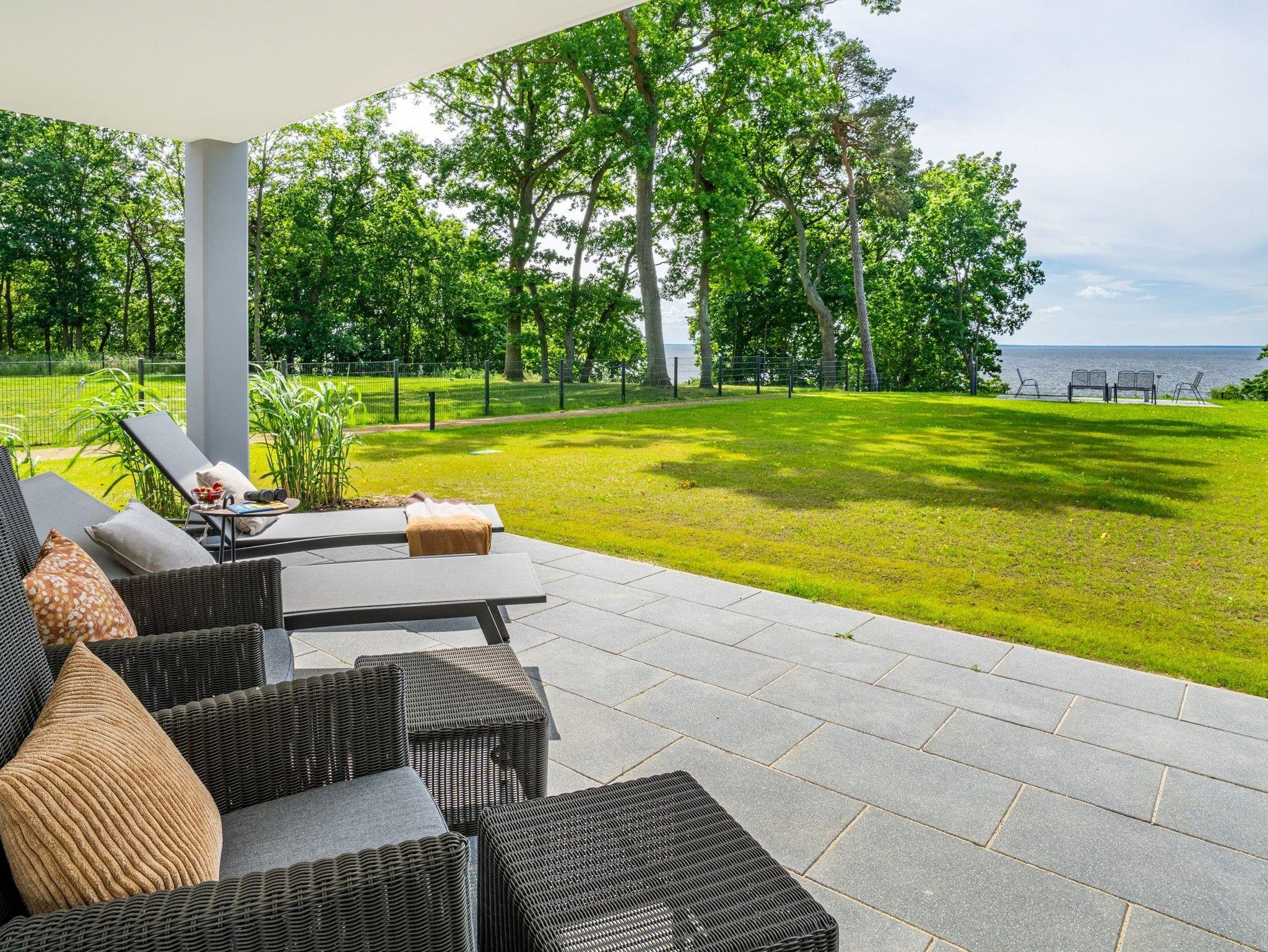 Der Gartenbereich zur Südseite wurde als Ruhezone mit Verweilmöglichkeiten auf der gemütlichen Terrasse gestaltet. Hier haben Sie einen fantastischen Blick auf das Haff und können entspannte Momente genießen.