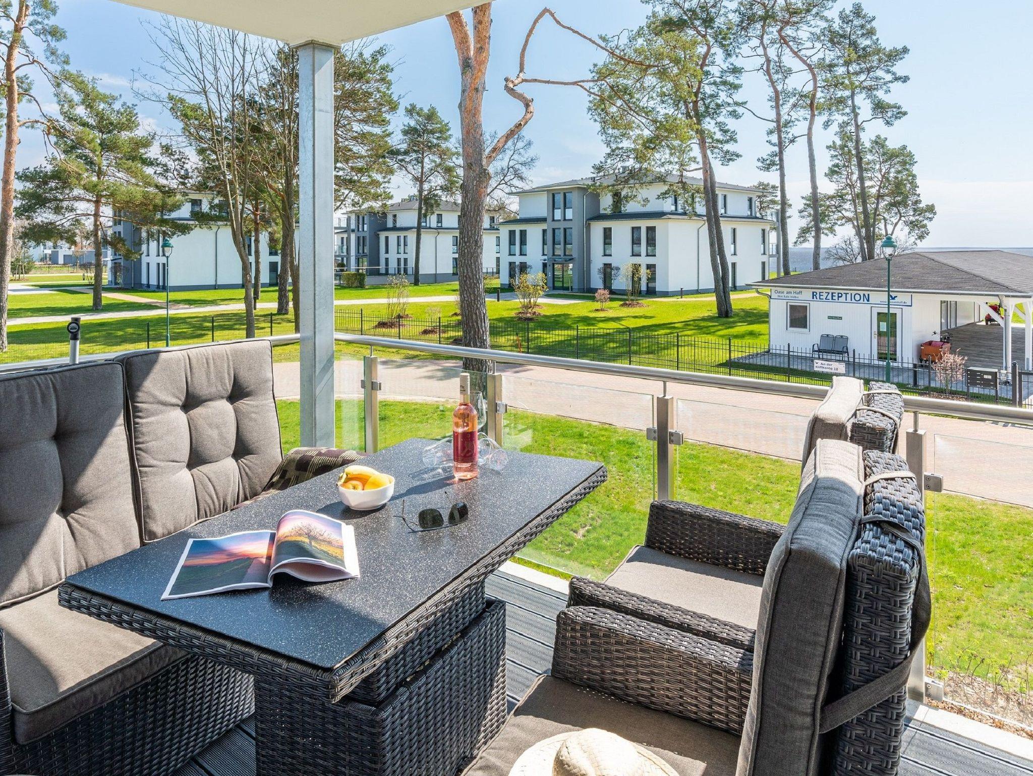 Der offen gestaltete Wohnbereich ist mit einem komfortablen Sofa und zwei Sesseln sowie Smart-TV ausgestattet. Sie haben vom Wohnzimmer aus Zugang zum Südost-Balkon. Der möblierte Balkon mit traumhaften Ausblicken auf das Stettiner Haff bietet auch aus der zweiten Reihe einen wunderschönen Ort, um Ihre Mahlzeiten zu genießen und die Aussicht zu bewundern.
