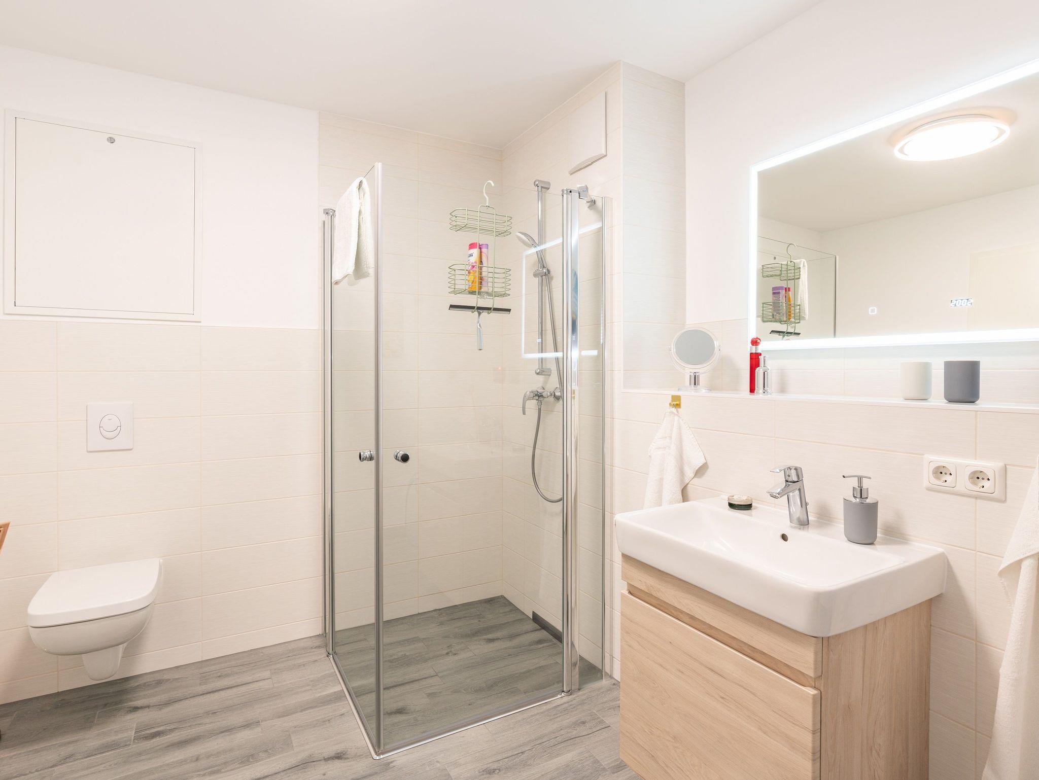 Die beiden vollausgestatteten Badezimmer verfügen jeweils über eine ebenerdige Dusche, WC, Waschtischanlage sowie Fön.