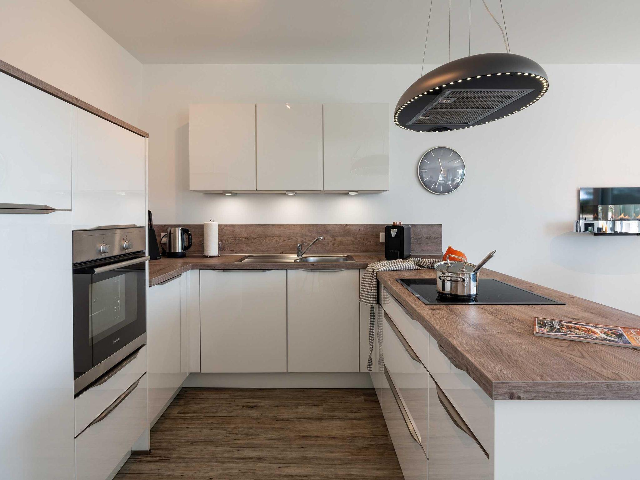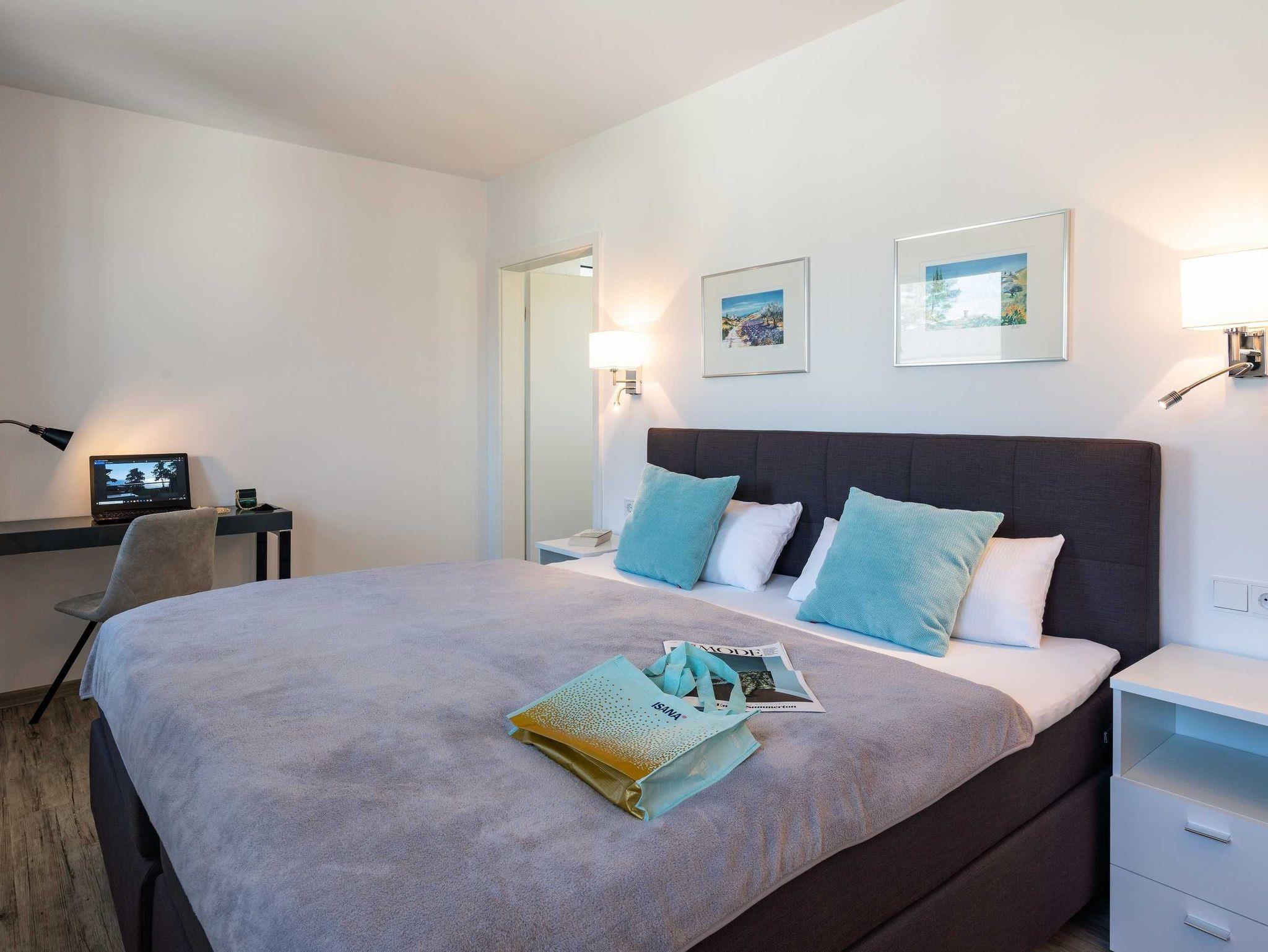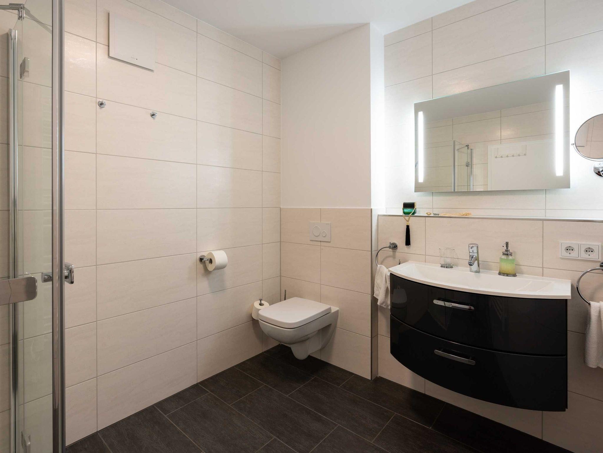 Diese lichtdurchflutete, helle 3-Zimmer-Wohnung im obersten Geschoss von Haus 3 (Aufzug vorhanden) mit Platz für maximal 4 Personen sowie einem Kleinkind bis 2 Jahre im Babybett verfügt über eine Wohnfläche von 94 m² und hat 2 Schlafzimmer sowie 2 voll ausgestattete Duschbäder. Die große Sonnenterrasse mit 17 m² liegt in idealer Süd-Ausrichtung. Die Wohnung ist modern eingerichtet mit offenem Wohn-Essbereich, großem Esstisch, Ledersofa sowie Smart-TV (inkl. Sky-Abo). Die hochwertig ausgestattete Küche, offen zum Wohnbereich, lässt keine Wünsche offen. Erholsamer Schlaf in den beiden Schlafzimmern mit Boxspringbetten und Smart-TV ist garantiert. Das Badezimmer en Suite ist mit einer Duschkabine ausgestattet. Auf dem großen, überdachten Sonnenbalkon mit Essgruppe und zwei Relax-Sesseln, Fußhockern sowie einem Sonnenschirm können Sie die Seele baumeln lassen.
