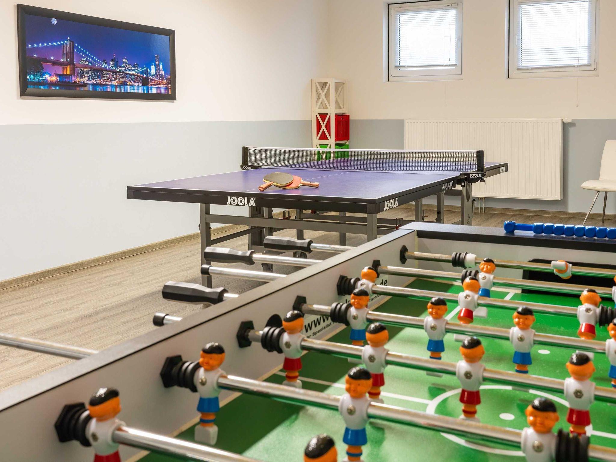 Im Souterrain des Nachbarhauses befindet sich auf 365 m² ein großer Freizeit-, Fitness- und Wellnessbereich (Biosauna, Finnische Sauna, Infrarotkabine, Fitnessraum, Massageraum, Ruheraum, Aufenthaltsraum, Spielzimmer für Kleinkinder, Billard, Tischtennis, Kicker), der Ihnen kostenlos zur Verfügung steht und die Interessen jeden Alters berücksichtigt.