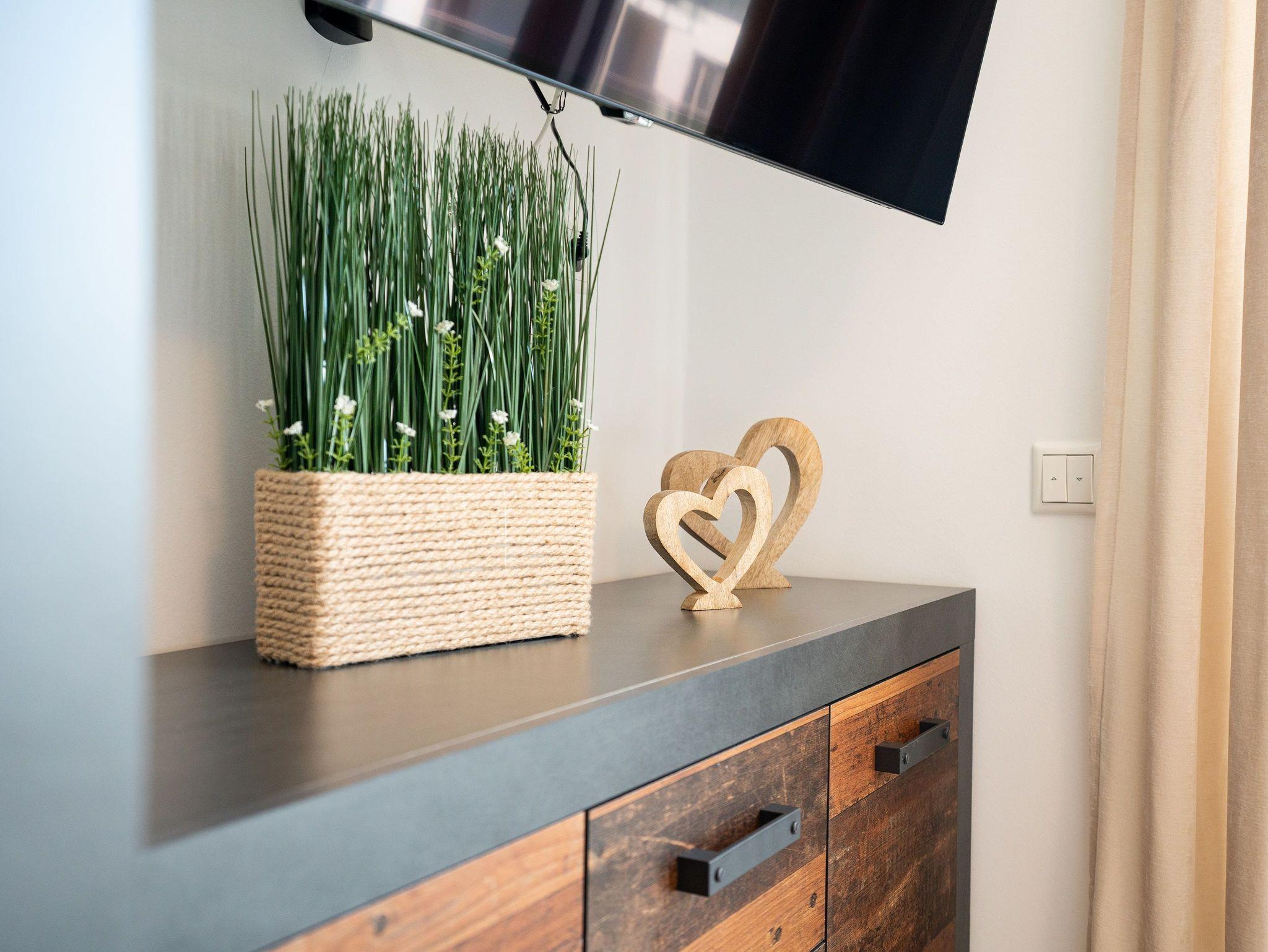 Auf einer Wohnfläche von 61 m² finden drei Erwachsene und ein Kleinkind bis zwei Jahre (im Babybett) in dieser modern eingerichteten Ferienwohnung ausreichend Platz für einen entspannten Urlaub am Stettiner Haff auf Usedom.