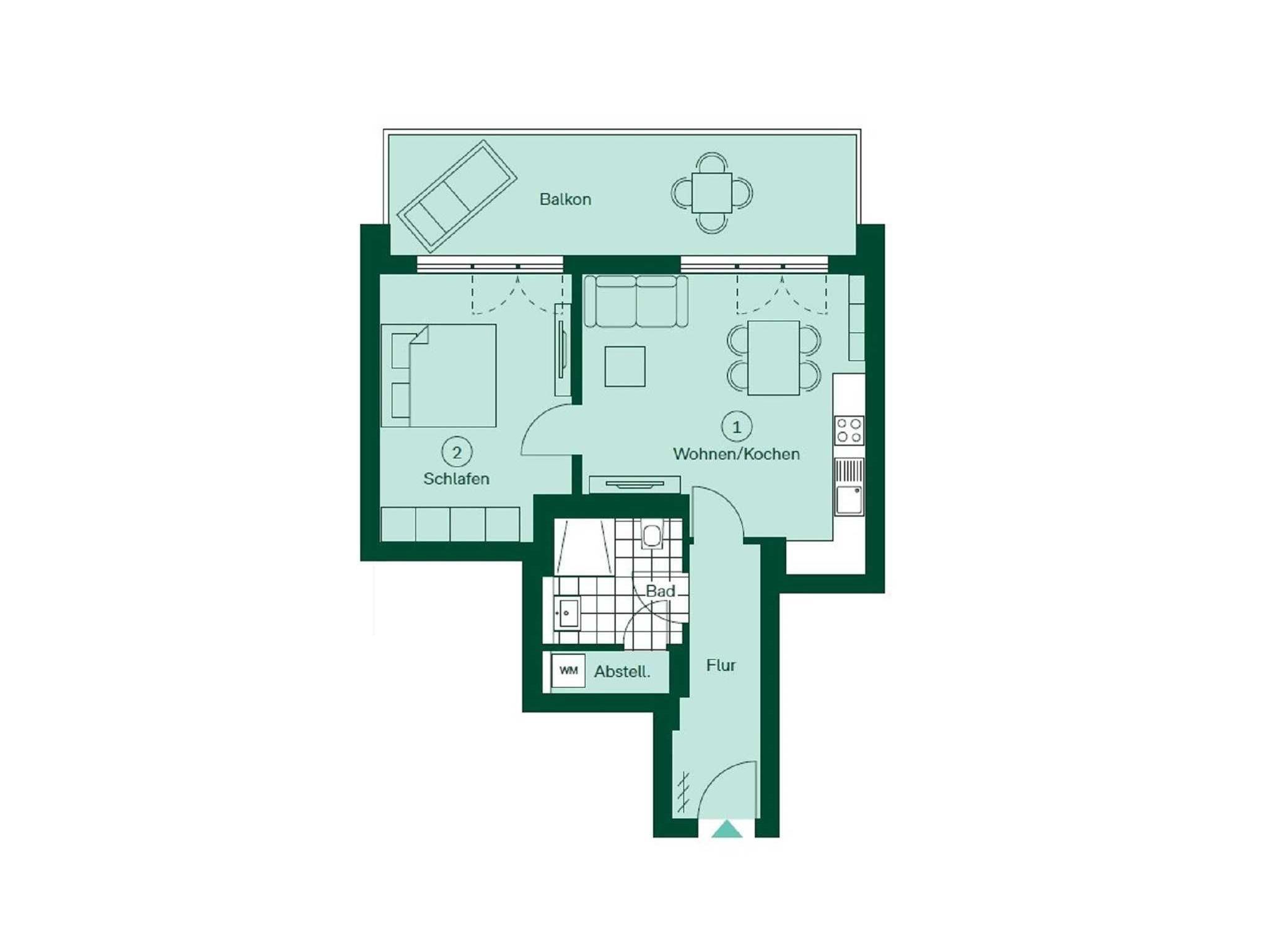 Der offen gestaltete Wohnbereich ist mit einem Ecksofa, Musikanlage sowie einem Smart-TV ausgestattet. Sie haben vom Wohnzimmer aus Zugang zum Südwest-Balkon. Sie haben vom Wohnzimmer aus Zugang zum Südbalkon. Der mit Sitzgelegenheiten und einer Sonnenliege ausgestattete Balkon bietet mit traumhaften Ausblicken in die Parkanlage einen wunderschönen Ort, um Ihre Mahlzeiten zu genießen und die Aussicht zu bewundern.