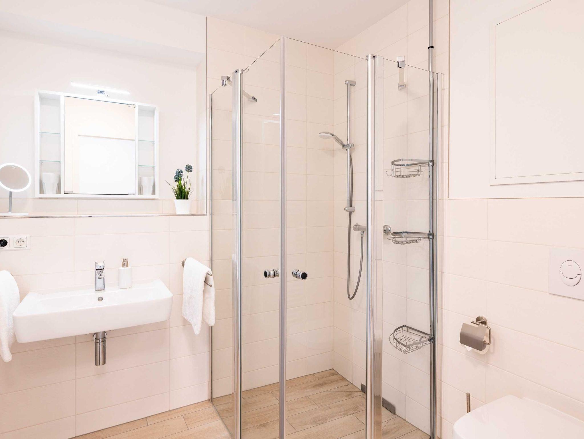 Das vollausgestattete Badezimmer verfügt über eine ebenerdige Dusche, WC, Waschtischanlage sowie Fön. Ein Marken-Waschtrockner zur kostenfreien Nutzung komplettiert die Ferienunterkunft.