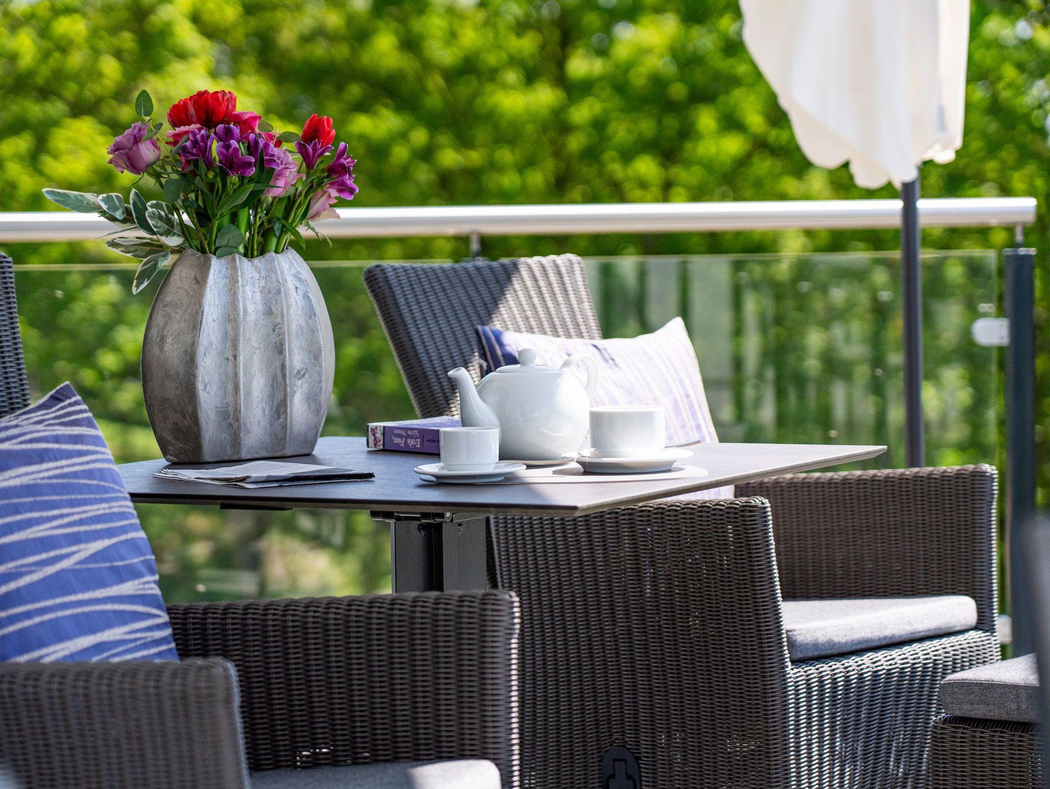 Der 18 m² große, überdachte Sonnenbalkon bietet reichlich Platz für Entspannung und Geselligkeit. Ein großer Esstisch mit sechs Stühlen lädt zu gemeinsamen Mahlzeiten ein, während die gemütliche Sitzgruppe mit Bistrotisch und zwei verstellbaren Relaxsesseln samt Fußhockern perfekte Plätze für entspannte Stunden bieten.