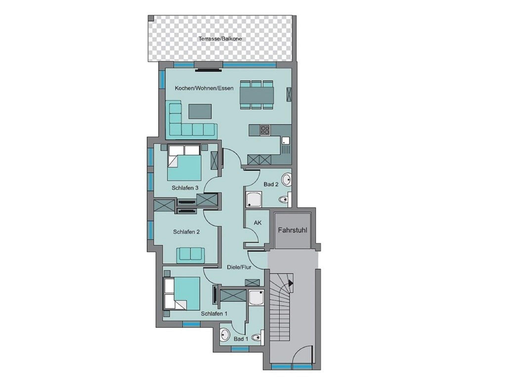 Die barrierefreie und sonnendurchflutete 4-Zimmer-Ferienwohnung liegt im obersten Geschoss des 8-Parteienhauses. Ein Aufzug ist vorhanden, der jede Etage anfährt.