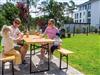 Der vordere, eingezäunte Grundstücksbereich bietet zahlreiche Spielmöglichkeiten für Kinder, darunter eine große Spielanlage mit Rutsche, ein Sandkasten sowie eine Sandbaustelle, ein Wipptier, eine Kinderschaukel und ein Drehkarussell. Zahlreiche Sitzgelegenheiten laden zum Verweilen und Sonne tanken ein.