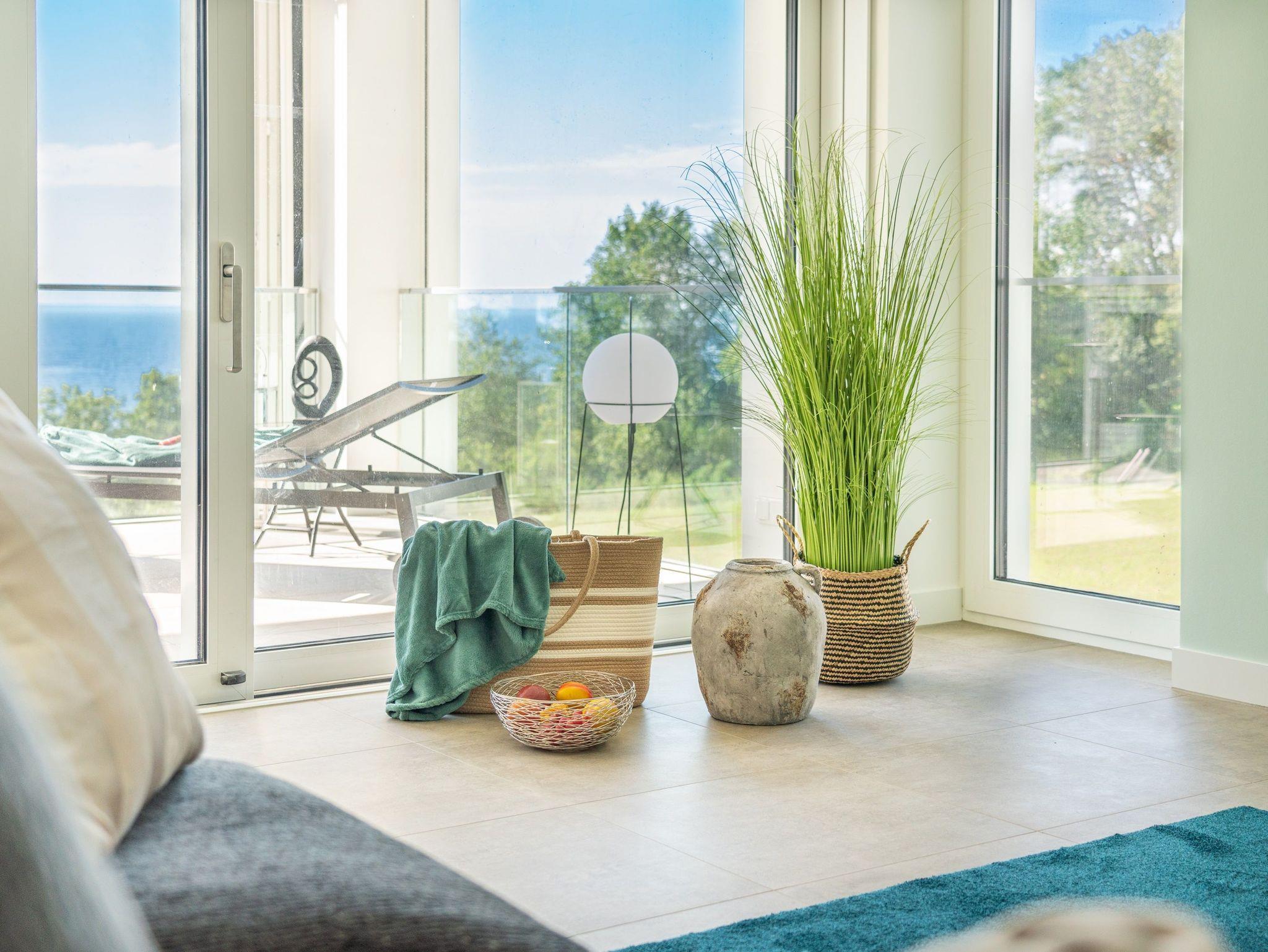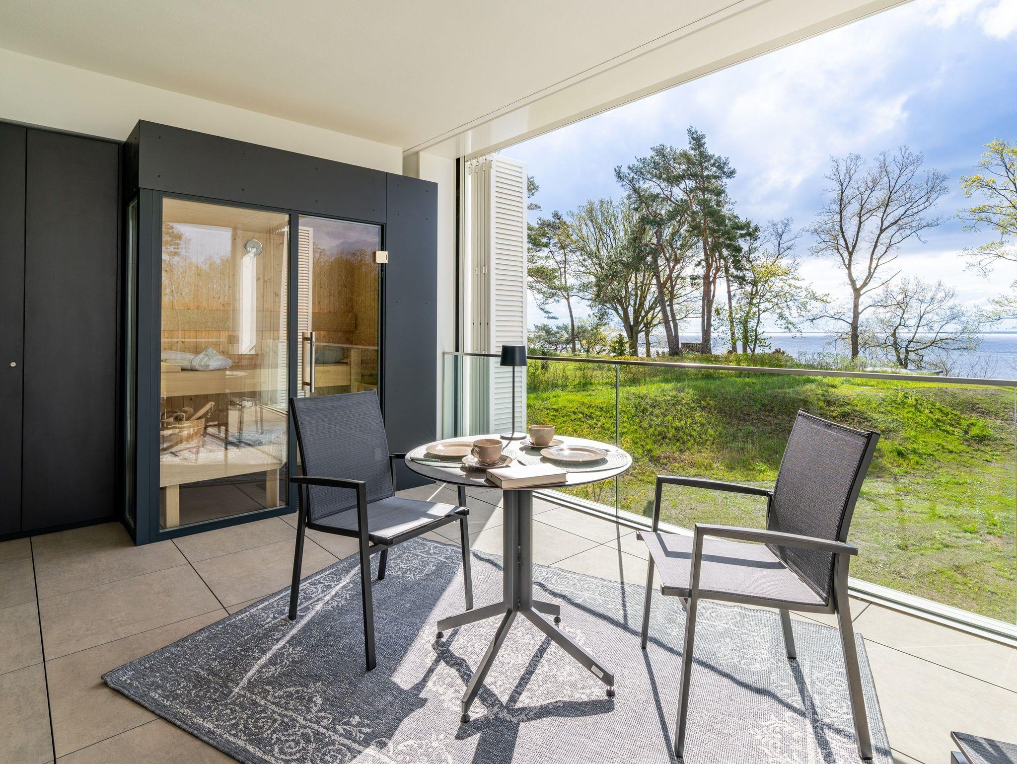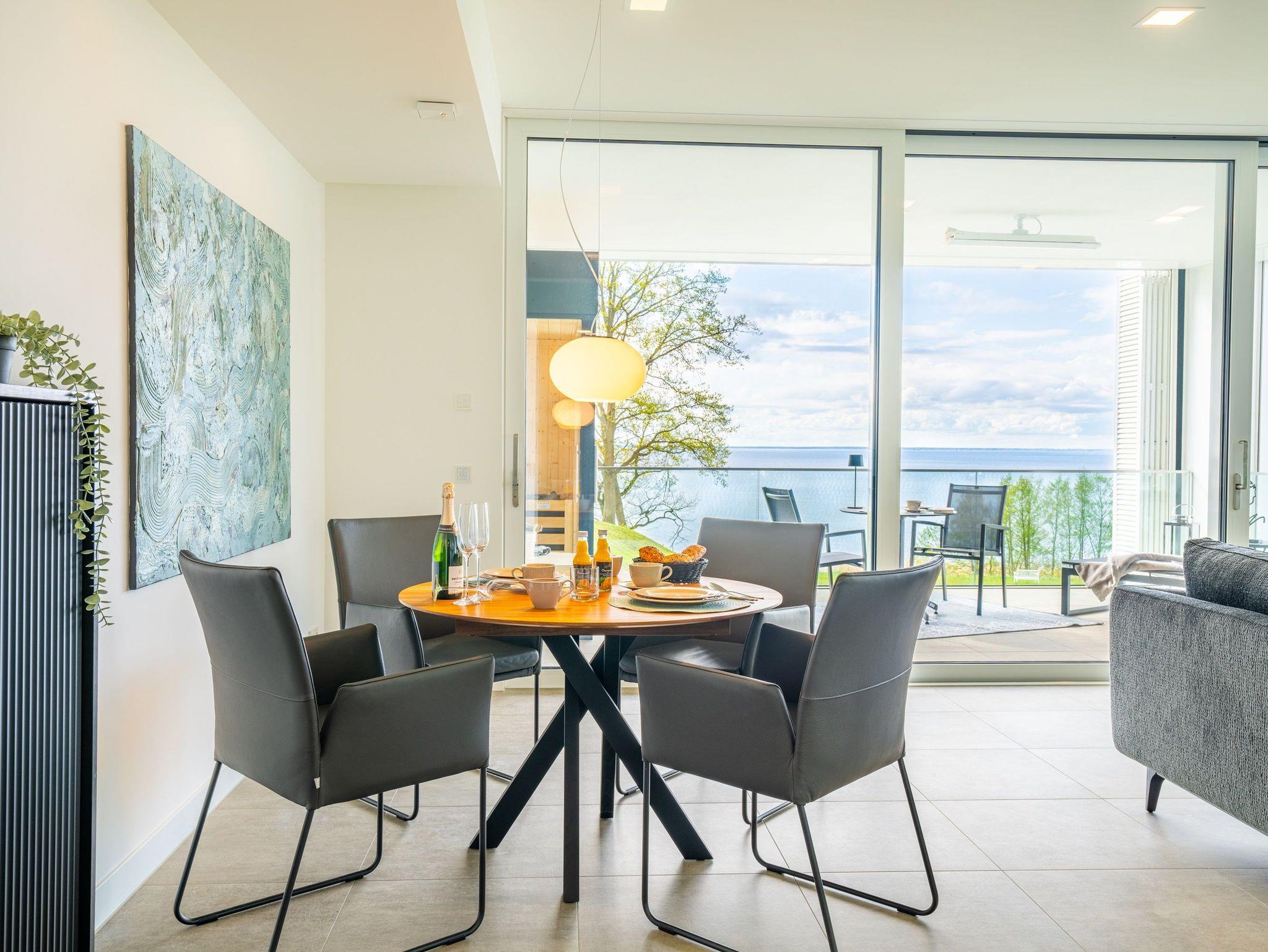 Das barrierefreie, in 2023/24 erbaute Apartment mit 109 qm mit Lanai und Haffblick im ersten Obergeschoss verfügt über kostenfreies WLAN, zwei Schlafzimmer (Platz für vier Personen plus Kleinkind im Babybett), ein Wohnzimmer, drei internetfähige Flachbild-TVs, eine voll-ausgestattete Küche mit Kühl- und Gefrierschrank, Backofen und Mikrowelle sowie Weinkühlschrank. Im Hauptschlafzimmer steht ein großes Doppelbett (180 x 200 cm), während das andere Schlafzimmer ein Schlafsofa mit einer vollwertigen Federkernmatratze (160 x 200 cm) bietet. Die beiden Badezimmer sind mit einer ebenerdigen Dusche ausgestattet, ein Badezimmer ist im en Suite-Style. Zusätzlich befindet sich auf dem Balkon mit idealer Süd-Ausrichtung eine eigene private Sauna. Handtücher und Bettwäsche sind im Preis enthalten, ebenso die Nutzung einer wohnungseigenen Waschmaschine. Zudem wird ein Sauna-Set mit kuscheligem Bademantel sowie einem Saunahandtuch angeboten.