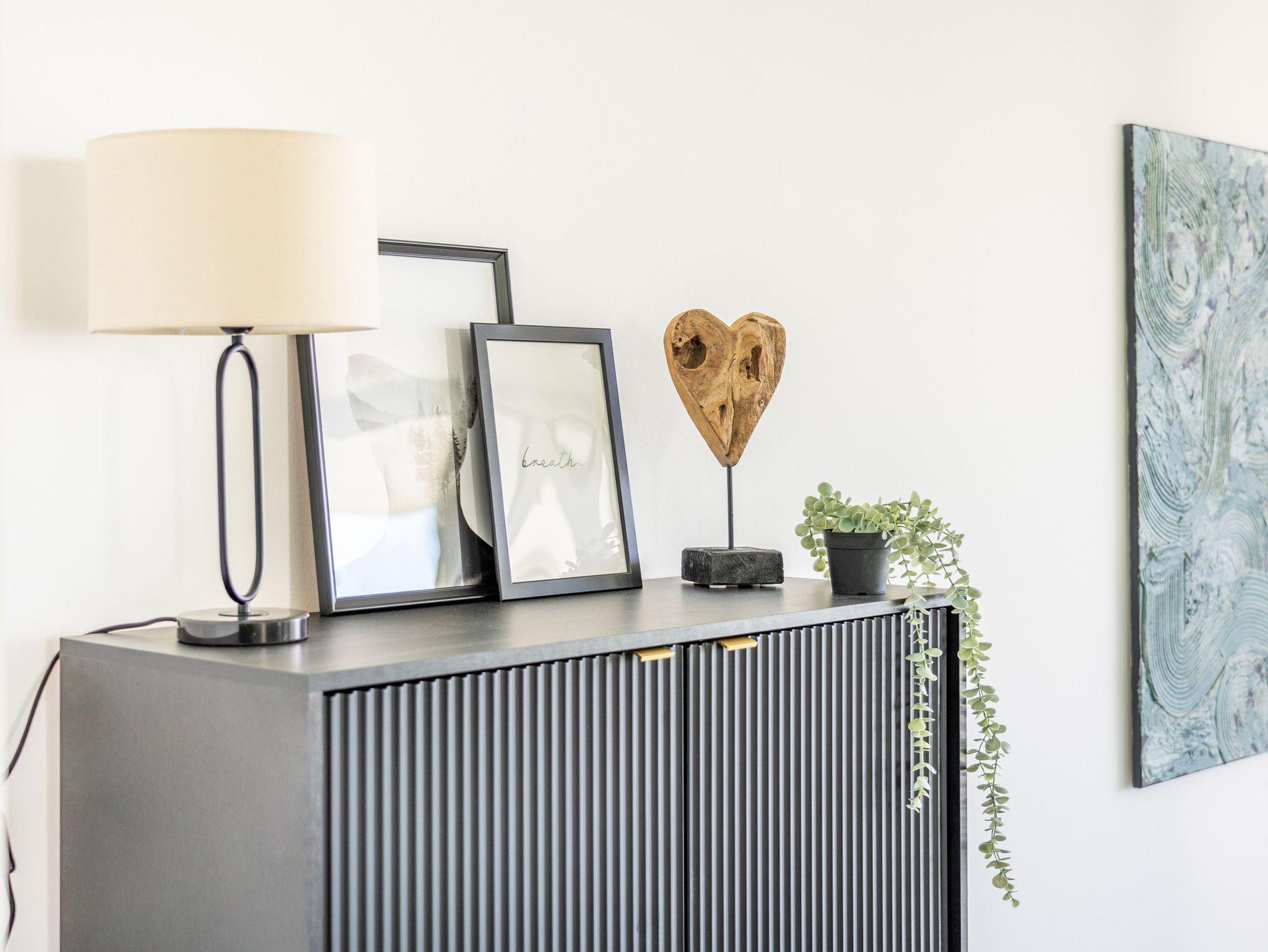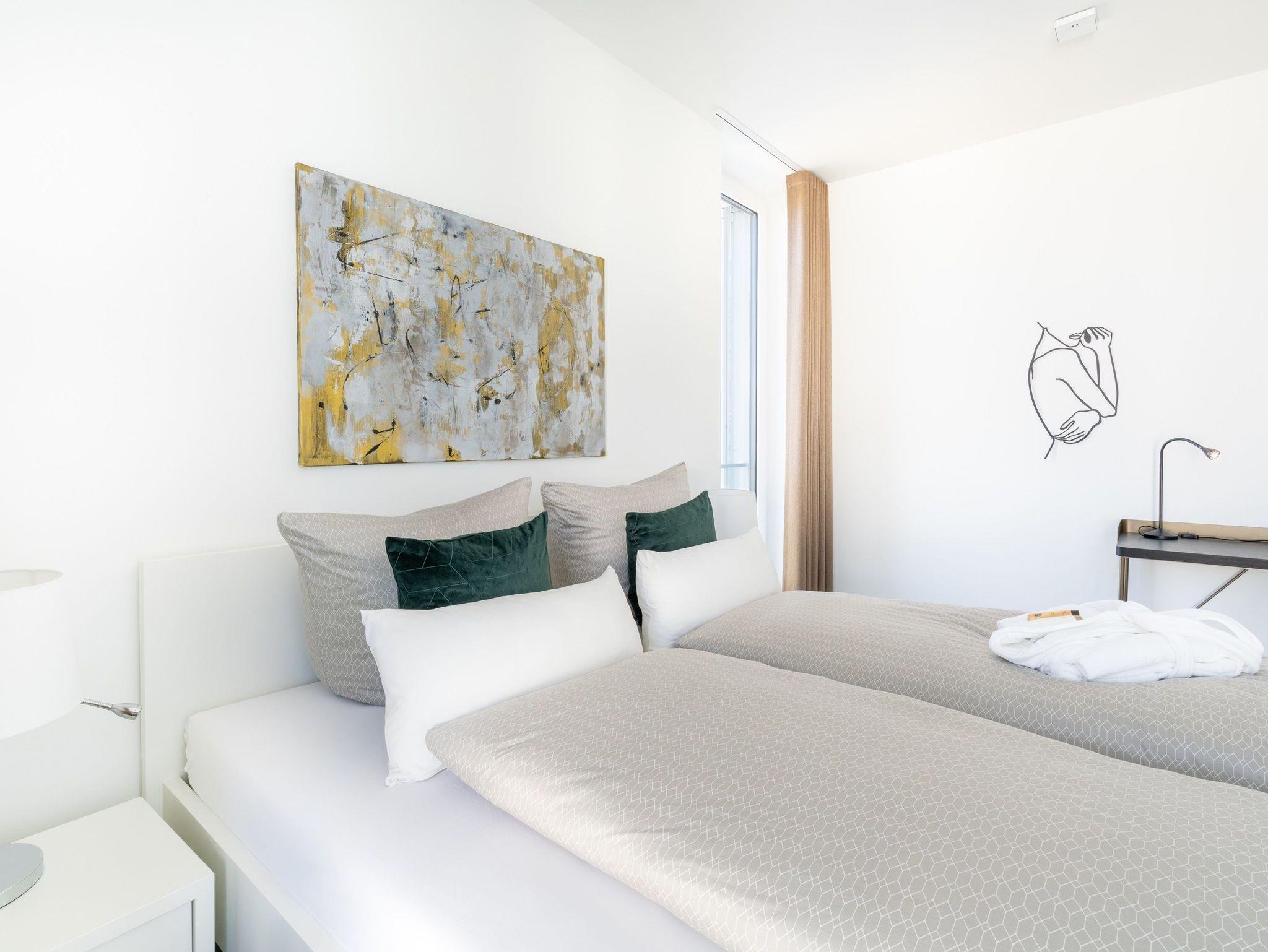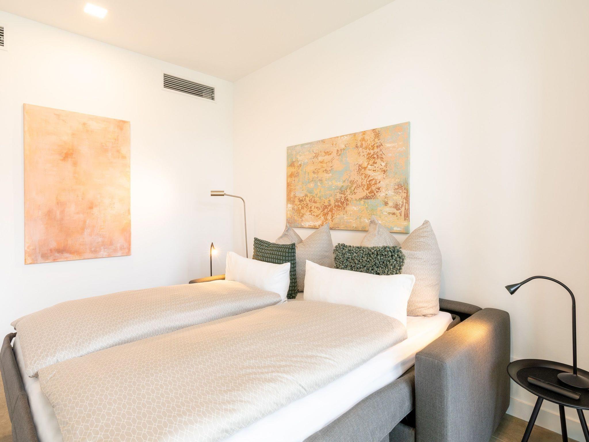 Das barrierefreie, in 2023/24 erbaute Apartment mit 109 qm mit Lanai und Haffblick im ersten Obergeschoss verfügt über kostenfreies WLAN, zwei Schlafzimmer (Platz für vier Personen plus Kleinkind im Babybett), ein Wohnzimmer, drei internetfähige Flachbild-TVs, eine voll-ausgestattete Küche mit Kühl- und Gefrierschrank, Backofen und Mikrowelle sowie Weinkühlschrank. Im Hauptschlafzimmer steht ein großes Doppelbett (180 x 200 cm), während das andere Schlafzimmer ein Schlafsofa mit einer vollwertigen Federkernmatratze (160 x 200 cm) bietet. Die beiden Badezimmer sind mit einer ebenerdigen Dusche ausgestattet, ein Badezimmer ist im en Suite-Style. Zusätzlich befindet sich auf dem Balkon mit idealer Süd-Ausrichtung eine eigene private Sauna. Handtücher und Bettwäsche sind im Preis enthalten, ebenso die Nutzung einer wohnungseigenen Waschmaschine. Zudem wird ein Sauna-Set mit kuscheligem Bademantel sowie einem Saunahandtuch angeboten.