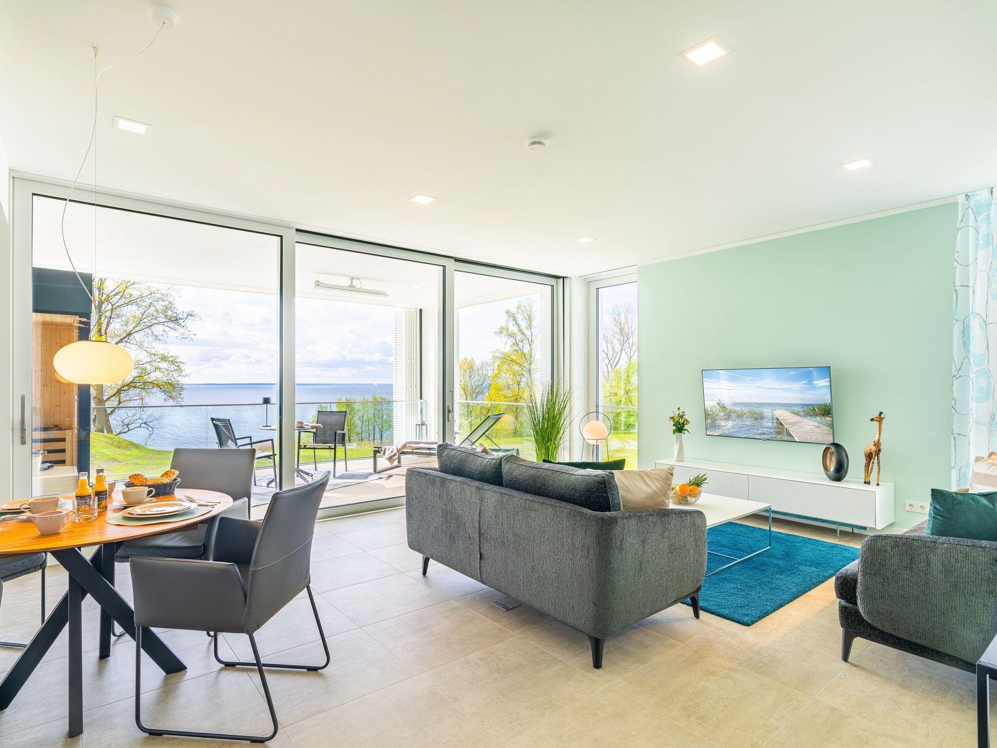 Das sehr luxuriöse Apartment ist erlesen und mit viel Liebe individuell eingerichtet mit eigens für diese Wohnung gestalteten Kunstwerken. Auf dem großzügigen, lichtdurchfluteten Lanai können Sie die Tage und die Ruhe dieser einzigartigen Oase der Natur genießen. Auf der bequemen Sonnenliege kann man jederzeit entspannt sonnenbaden oder einfach nur den Ausblick genießen. Während Sie die Seele baumeln lassen, genießen Sie nach Bedarf ein perfekt gekühltes Glas Wein aus dem Weinkühlschrank. Darüberhinaus bietet diese einzigartige Ferienwohnung eine auf dem Lanai befindliche Sauna für zwei Personen mit direktem Blick auf das Haff. Der zu der kleinen Anlage gehörende private Badesteg mit kleinem Anleger (z.B. für ein Schlauchboot) bietet die Möglichkeit zum Verweilen, Schwimmen oder Boot fahren. Lernen Sie die Einzigartigkeit und Exklusivität dieses Apartments durch einen eigenen Besuch kennen ? Sie werden begeistert sein!