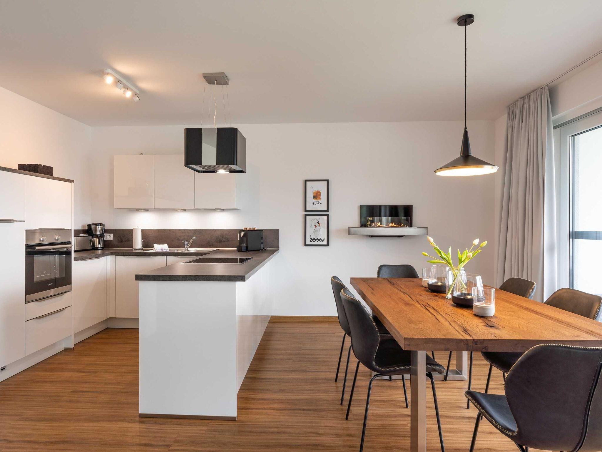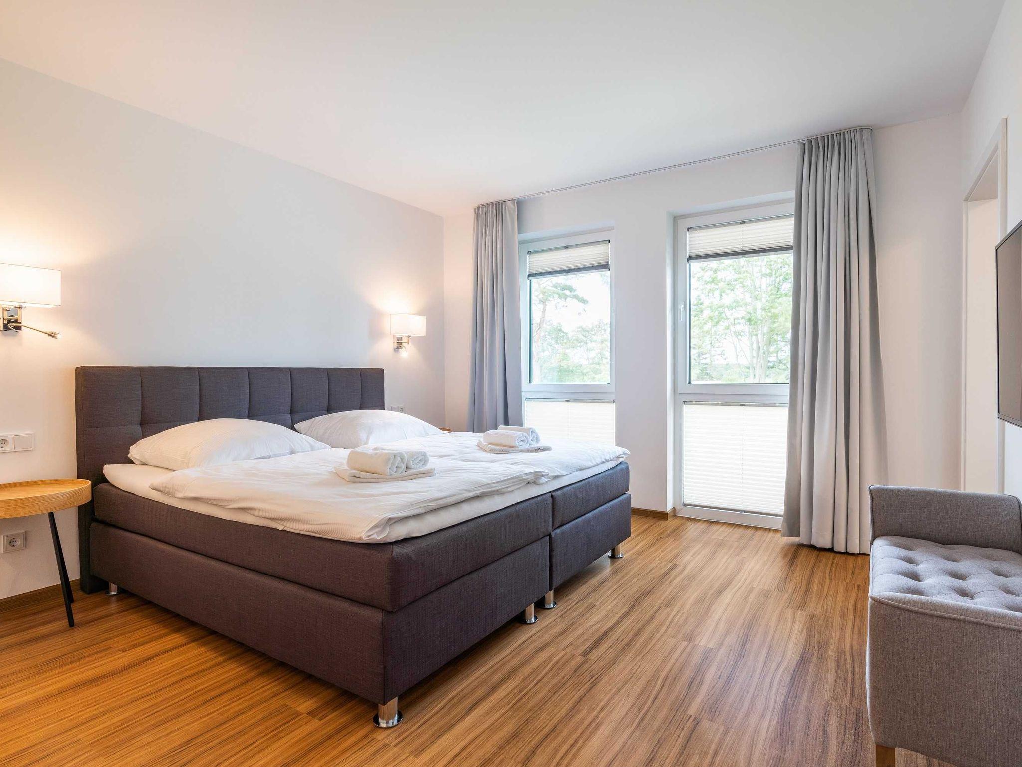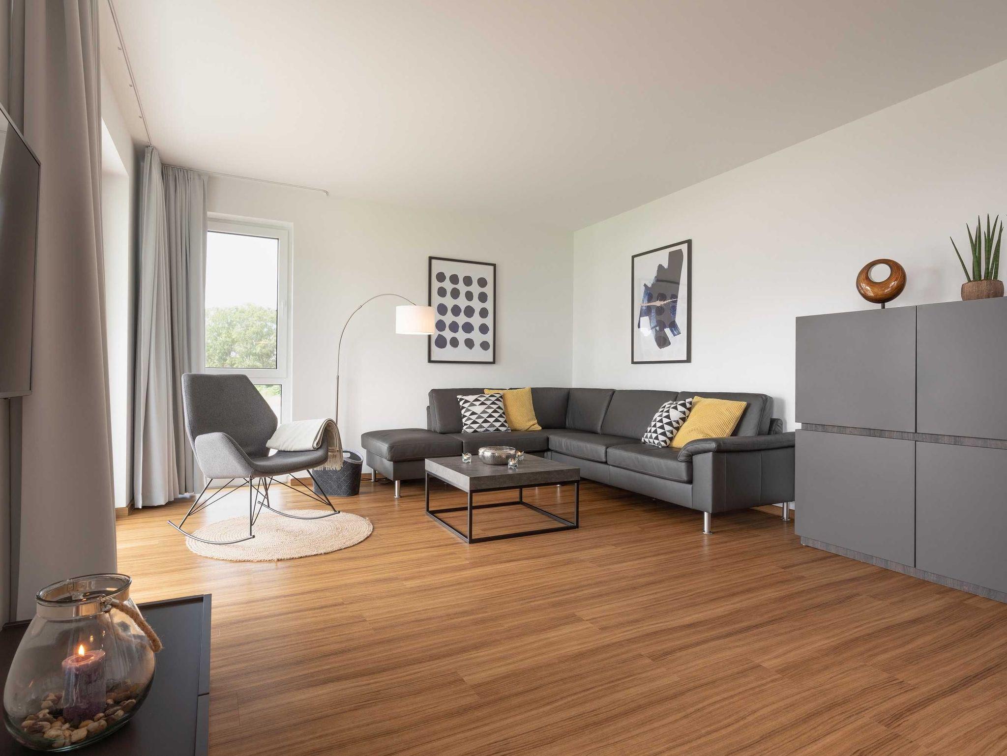 Diese luxuriöse 4-Zimmer-Wohnung im ersten Obergeschoss von Haus 4 (Aufzug vorhanden) mit Platz für maximal 6 Personen sowie einem Kleinkind bis 2 Jahre im Babybett verfügt über eine Wohnfläche von 119 m² und hat 3 Schlafzimmer sowie 2 voll ausgestattete Duschbäder. Die große Sonnenterrasse mit 17 m² liegt in idealer Süd-Ausrichtung. Die Wohnung ist modern eingerichtet mit offenem Wohn-Essbereich, großem Esstisch, Ledersofa sowie Smart-TV (inkl. Sky-Abo). Die hochwertig ausgestattete Küche, offen zum Wohnbereich, lässt keine Wünsche offen. Erholsamer Schlaf in den beiden Schlafzimmern mit Boxspringbetten und Smart-TV ist garantiert. Im dritten Schlafzimmer befindet sich ein bequemes Schlafsofa (Liegefläche: 1,80 x 2,00 m) und ein Smart-TV. Das Badezimmer en Suite ist mit einer begehbaren Dusche ausgestattet. Auf dem großen, überdachten Sonnenbalkon mit Essgruppe und zwei Relax-Sesseln, Fußhockern sowie einem Sonnenschirm können Sie die Seele baumeln lassen.