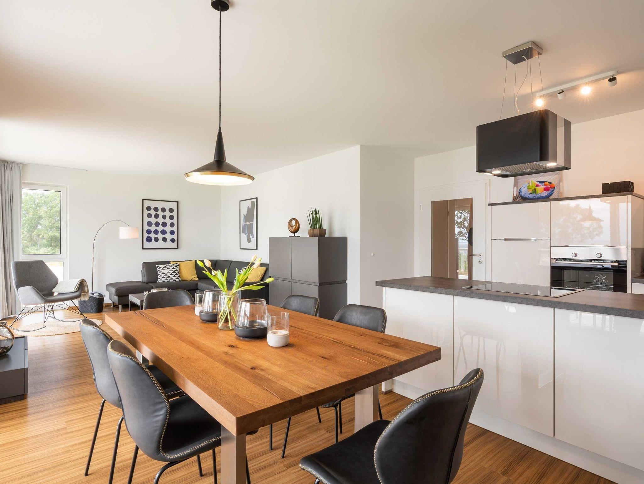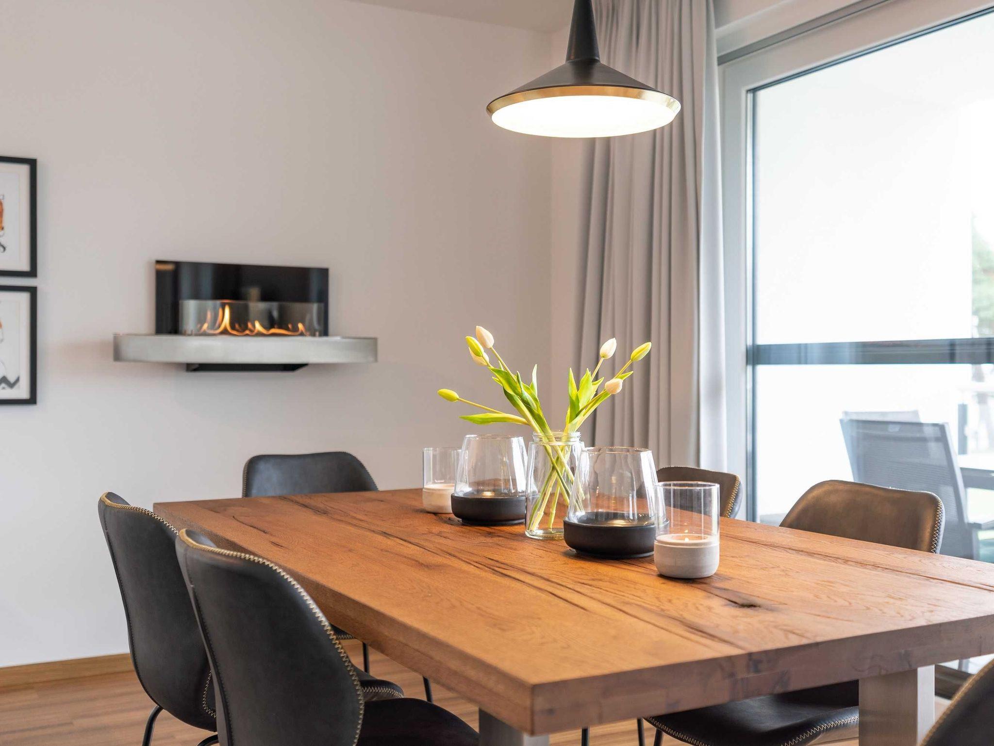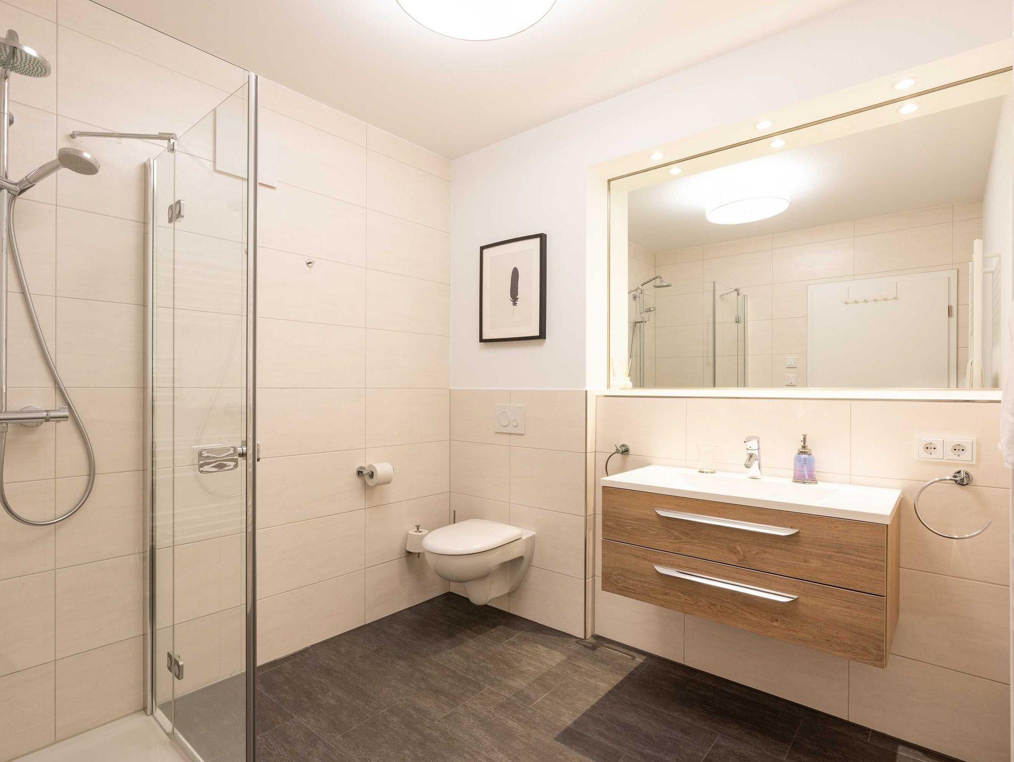 Diese luxuriöse 4-Zimmer-Wohnung im ersten Obergeschoss von Haus 4 (Aufzug vorhanden) mit Platz für maximal 6 Personen sowie einem Kleinkind bis 2 Jahre im Babybett verfügt über eine Wohnfläche von 119 m² und hat 3 Schlafzimmer sowie 2 voll ausgestattete Duschbäder. Die große Sonnenterrasse mit 17 m² liegt in idealer Süd-Ausrichtung. Die Wohnung ist modern eingerichtet mit offenem Wohn-Essbereich, großem Esstisch, Ledersofa sowie Smart-TV (inkl. Sky-Abo). Die hochwertig ausgestattete Küche, offen zum Wohnbereich, lässt keine Wünsche offen. Erholsamer Schlaf in den beiden Schlafzimmern mit Boxspringbetten und Smart-TV ist garantiert. Im dritten Schlafzimmer befindet sich ein bequemes Schlafsofa (Liegefläche: 1,80 x 2,00 m) und ein Smart-TV. Das Badezimmer en Suite ist mit einer begehbaren Dusche ausgestattet. Auf dem großen, überdachten Sonnenbalkon mit Essgruppe und zwei Relax-Sesseln, Fußhockern sowie einem Sonnenschirm können Sie die Seele baumeln lassen.