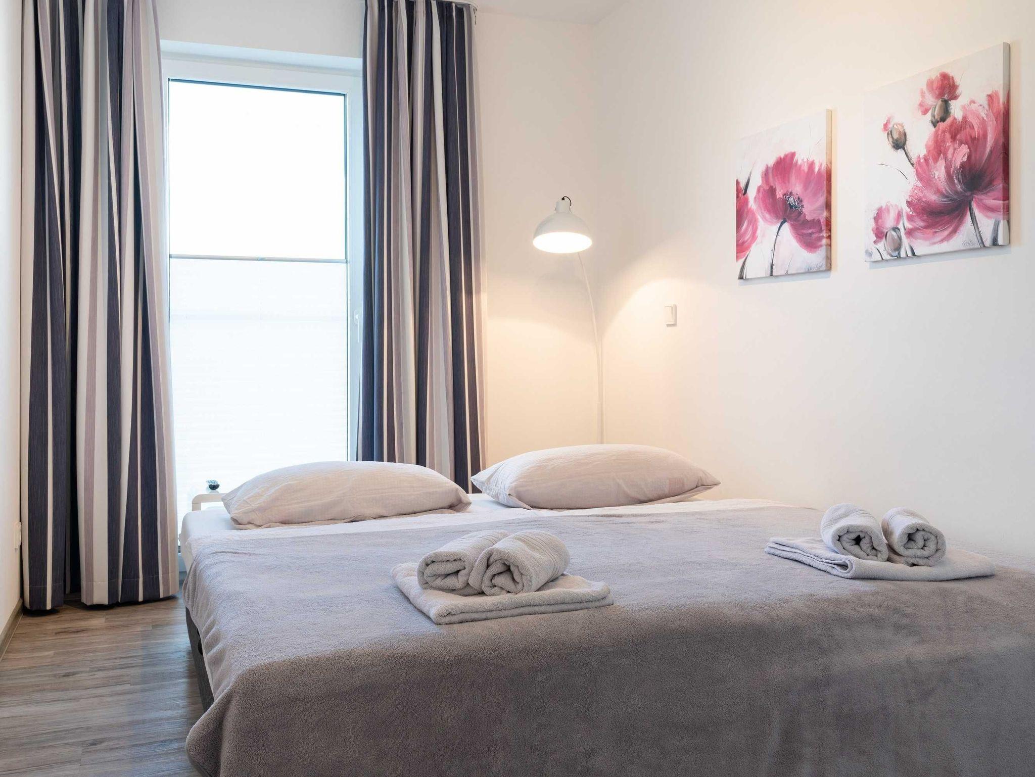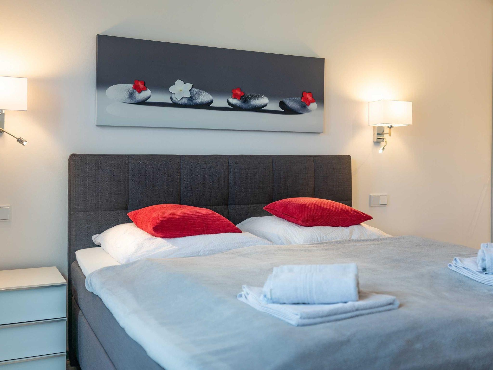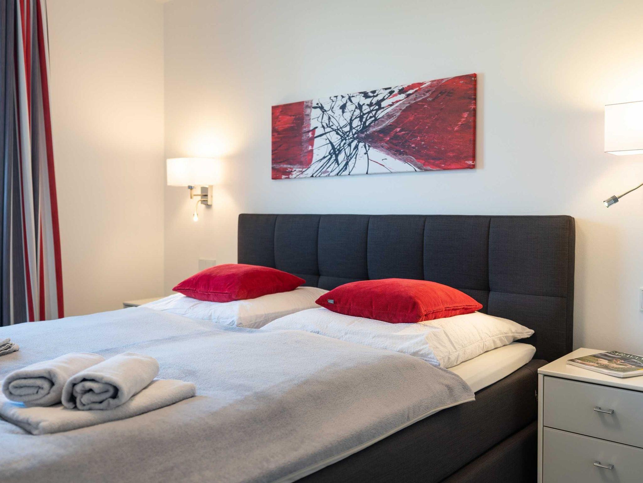 Diese luxuriöse 4-Zimmer-Wohnung im Erdgeschoss von Haus 1 mit Platz für maximal 6 Personen sowie einem Kleinkind bis 2 Jahre im Babybett verfügt über eine Wohnfläche von 119 m² und hat 3 Schlafzimmer sowie 2 voll ausgestattete Duschbäder. Die große Sonnenterrasse mit 21 m² liegt in idealer Süd-Ausrichtung. Die Wohnung ist modern eingerichtet mit offenem Wohn-Essbereich, großem Esstisch, Ledersofa sowie Flat-TV (inkl. Sky-Abo). Die hochwertig ausgestattete Küche, offen zum Wohnbereich, lässt keine Wünsche offen. Erholsamer Schlaf in den beiden Schlafzimmern mit Boxspringbetten und Flat-TV ist garantiert. Im dritten Schlafzimmer befindet sich ein bequemes Schlafsofa (Liegefläche: 1,80 x 2,00 m) und ein Flat-TV. Das Badezimmer en Suite ist mit einer begehbaren Dusche ausgestattet. Auf der großen, überdachten Sonnenterrasse mit Essgruppe und jeweils zwei Relax-Sesseln mit Fußhockern sowie einem Sonnenschirm können Sie die Seele baumeln lassen.