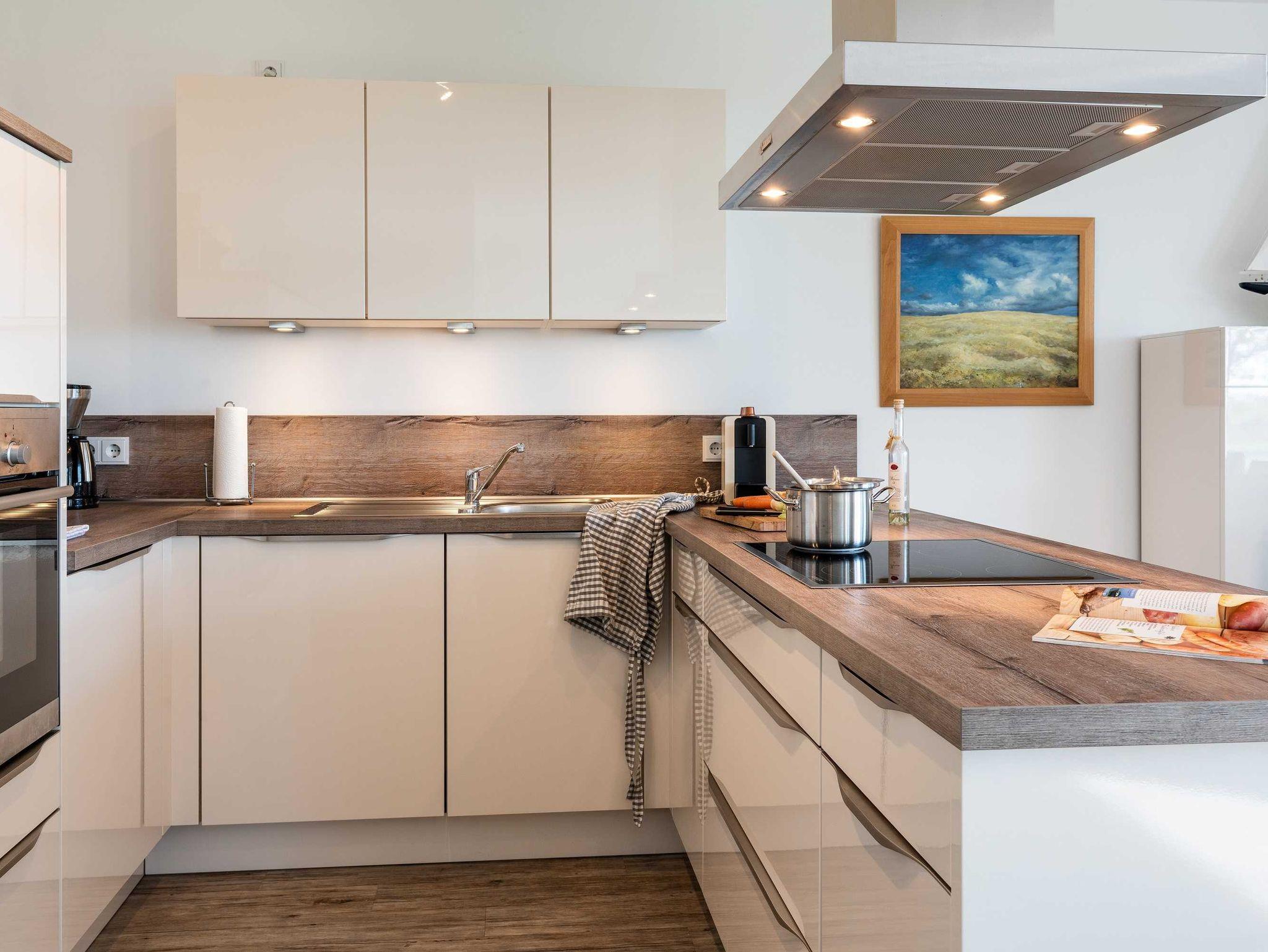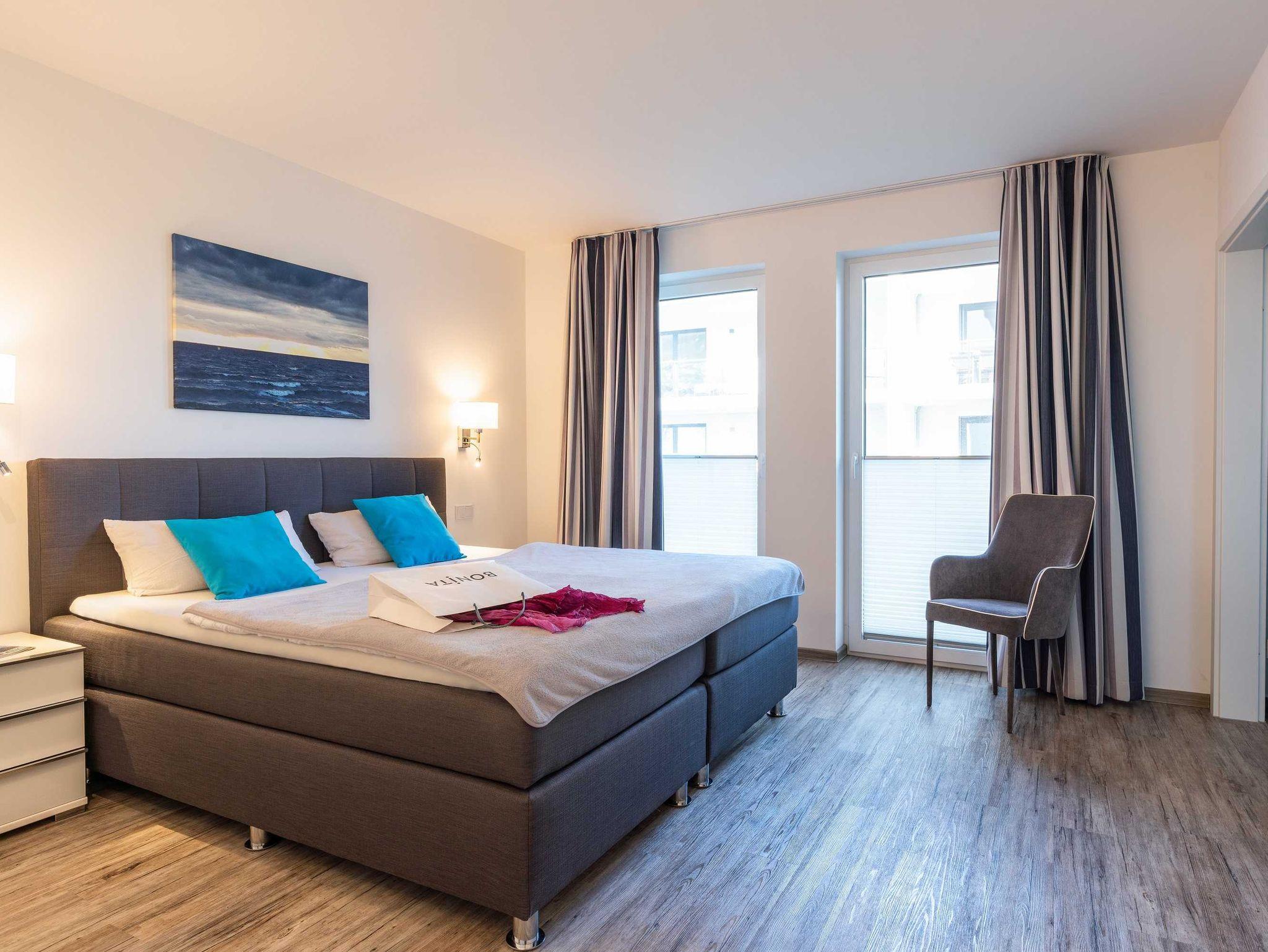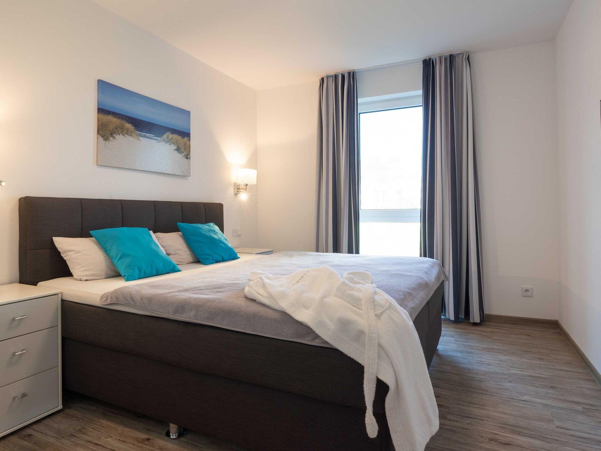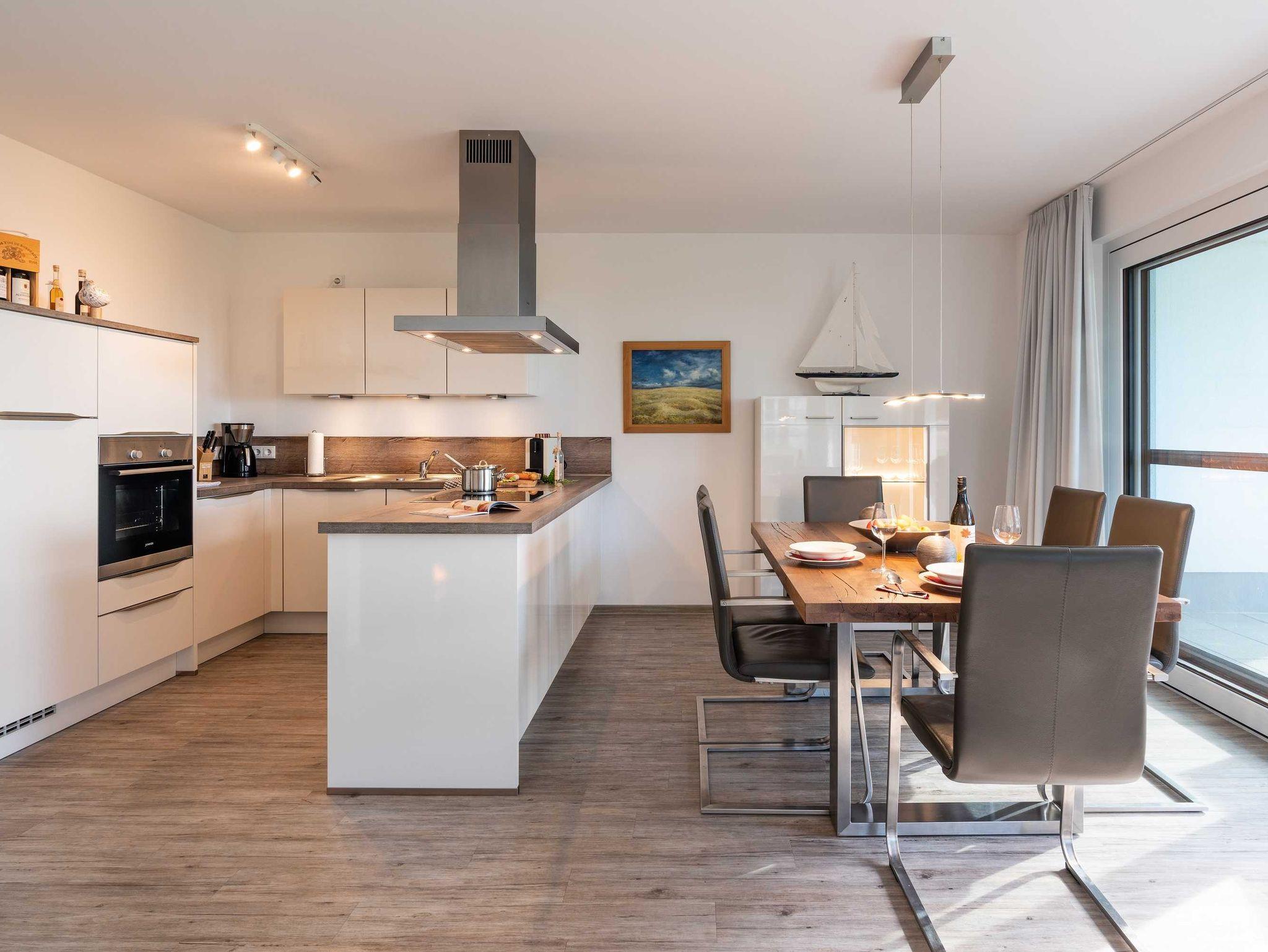 Diese luxuriöse 4-Zimmer-Wohnung im Erdgeschoss von Haus 2 mit Platz für maximal 6 Personen sowie einem Kleinkind bis 2 Jahre im Babybett verfügt über eine Wohnfläche von 119 m² und hat 3 Schlafzimmer sowie 2 voll ausgestattete Duschbäder. Die große Sonnenterrasse mit 21 m² liegt in idealer Süd-Ausrichtung. Die Wohnung ist modern eingerichtet mit offenem Wohn-Essbereich, großem Esstisch, Ledersofa sowie Flat-TV (inkl. Sky-Abo). Die hochwertig ausgestattete Küche, offen zum Wohnbereich, lässt keine Wünsche offen. Erholsamer Schlaf in den beiden Schlafzimmern mit Boxspringbetten und Flat-TV ist garantiert. Im dritten Schlafzimmer befindet sich ein bequemes Schlafsofa (Liegefläche: 1,80 x 2,00 m) und ein Flat-TV. Das Badezimmer en Suite ist mit einer begehbaren Dusche ausgestattet. Auf der großen, überdachten Sonnenterrasse mit Essgruppe und jeweils zwei Relax-Sesseln, Fußhockern, Sonnenschirm und Sonnenliegen können Sie die Seele baumeln lassen.