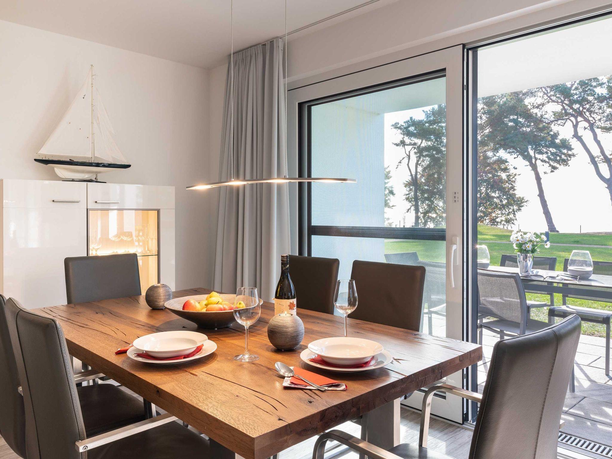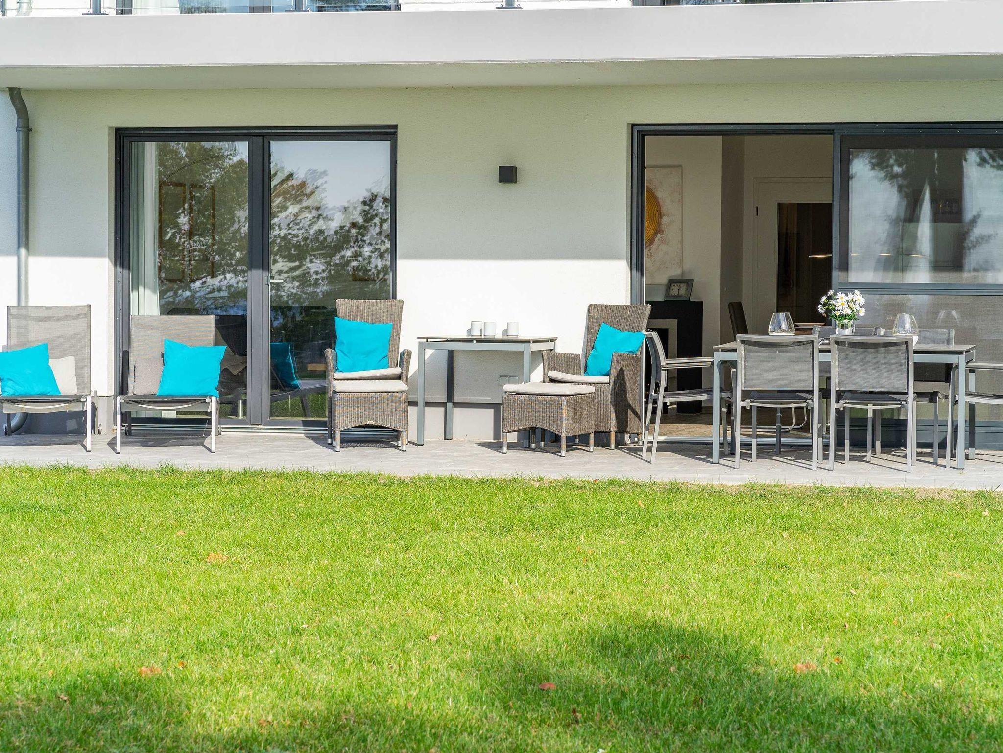 Alle Terrassenwohnungen und Appartements sind in hochwertiger Ausstattung eingerichtet. Von großen Rasenflächen und ebenen Gehwegen umgeben, stehen unsere sieben Ferienhäuser auf die Haffküste ausgerichtet auf einer weitflächigen Außenanlage zueinander. Unsere Haffterrassen laden mit Sitzgelegenheiten an der Steilküste zum Entspannen ein.