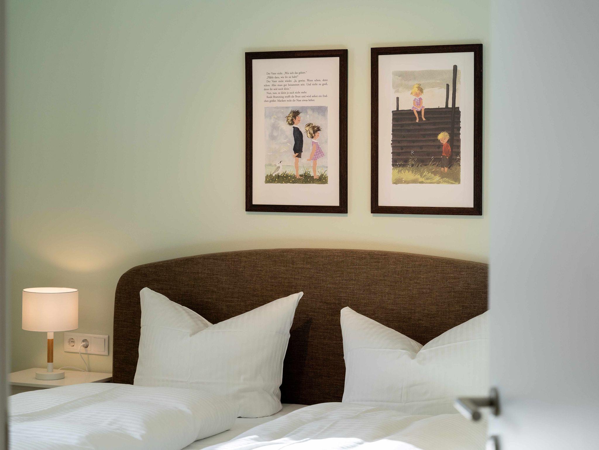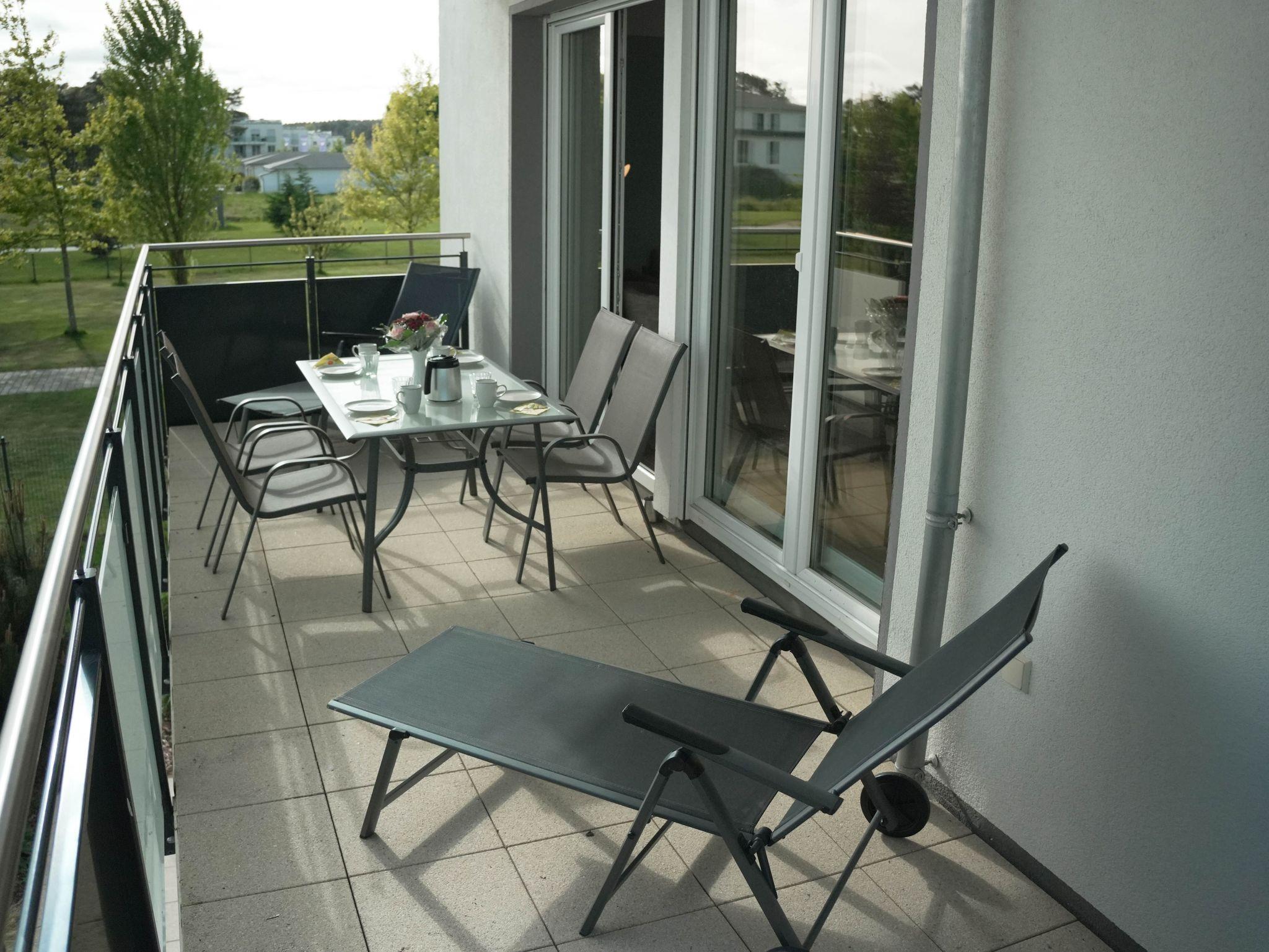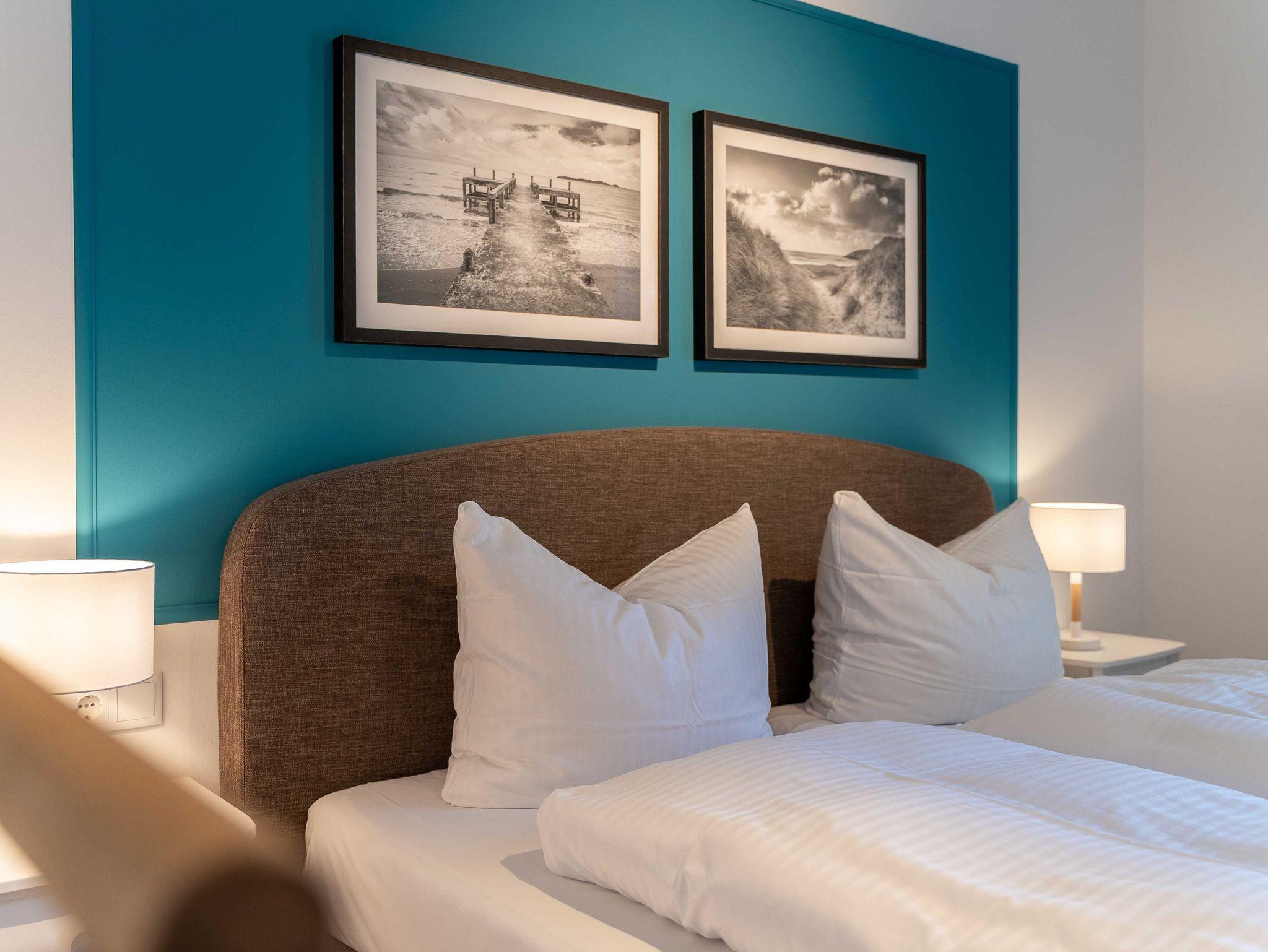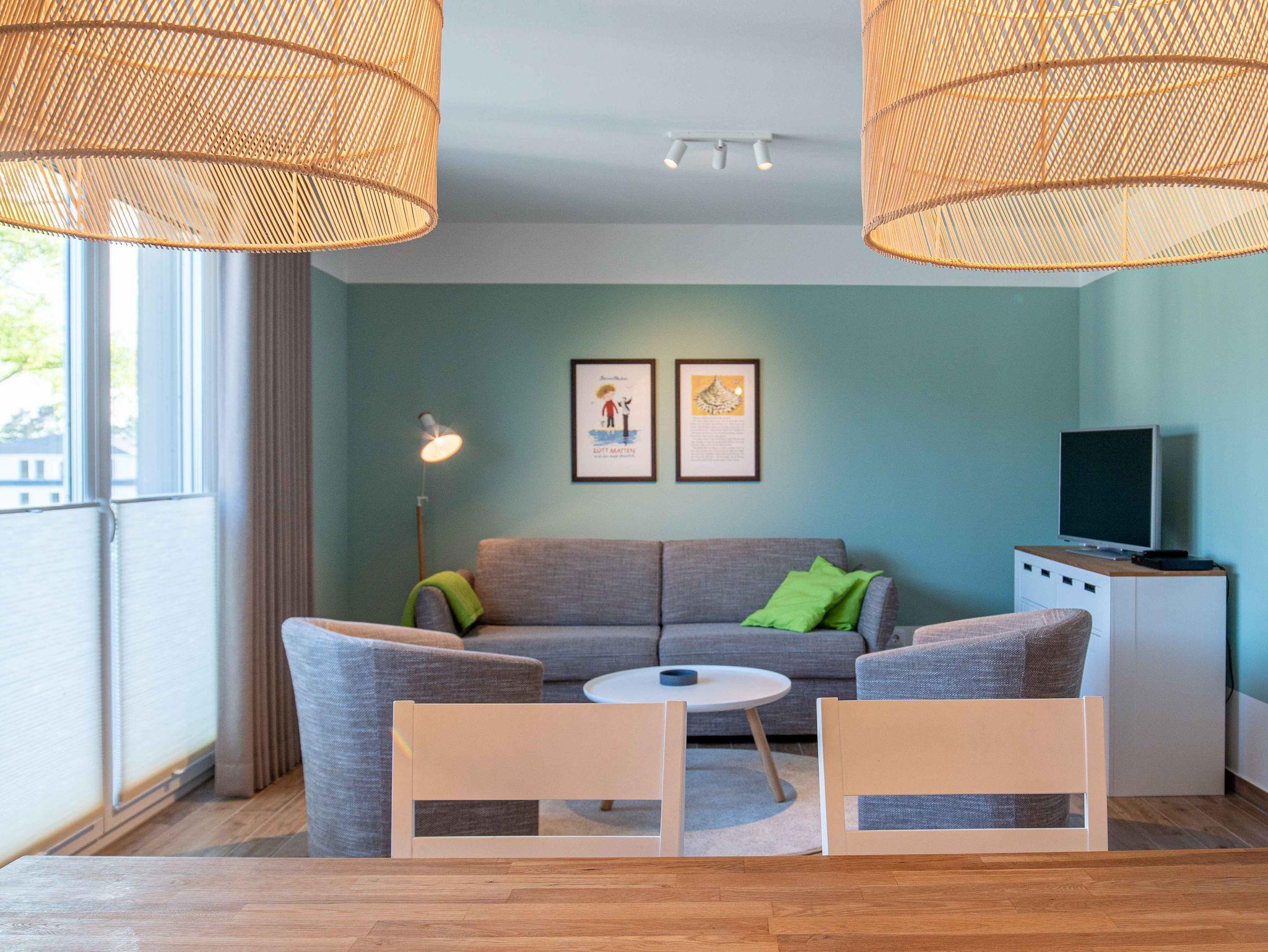 Unsere Ferienwohnung ist großzügig geschnitten und für bis zu 6 Personen geeignet, 2. OG, 90 qm, 2 Schlafzimmer zzgl. Schlafcoach im Wohnzimmer, 2 Balkone, 2 Bäder, Küche