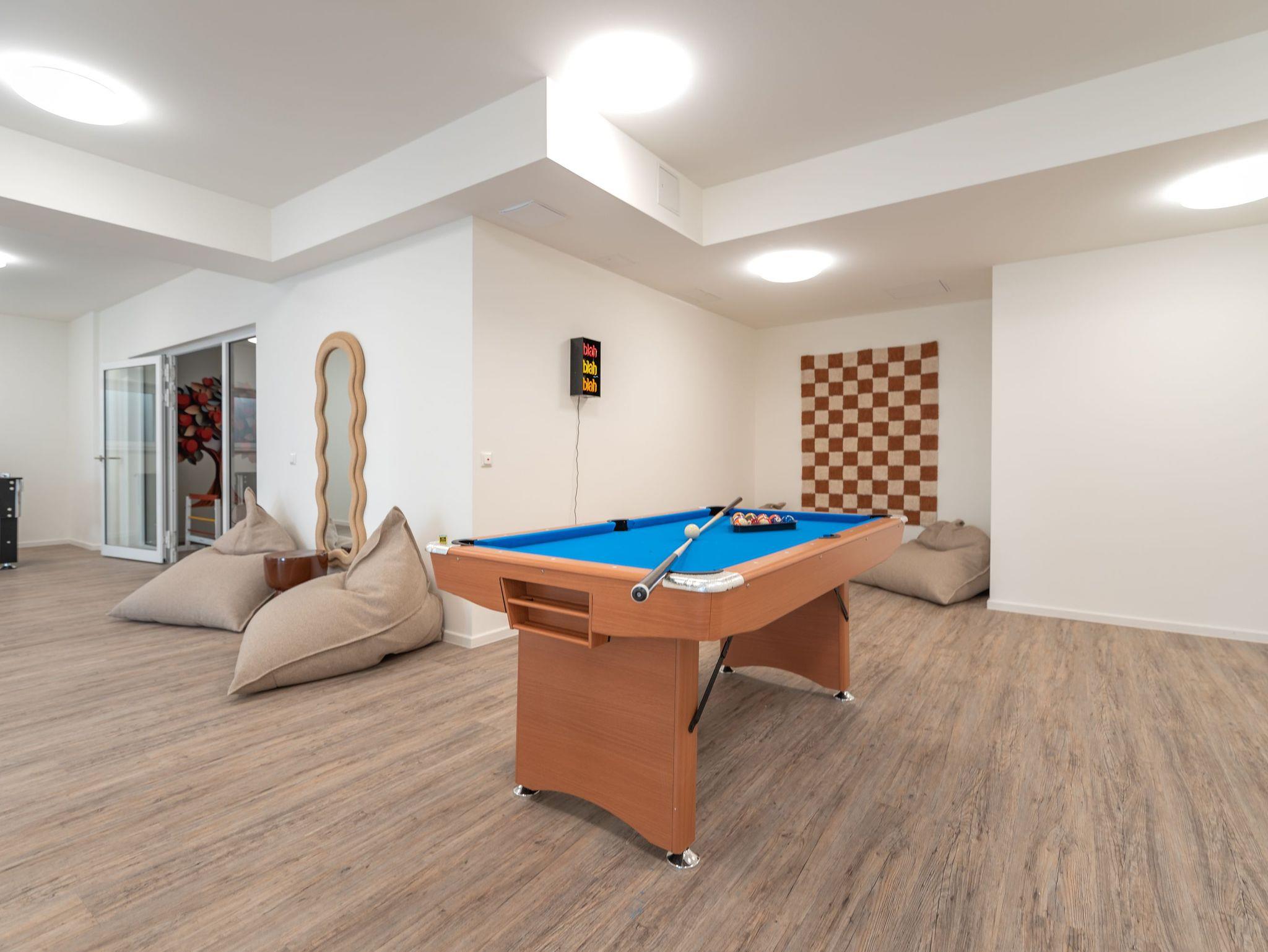 Im Dachgeschoss erwartet Sie der hauseigene Wellnessbereich mit zwei Saunen, einem stilvollen Ruheraum und einer Dachterrasse mit herrlichem Ausblick. Ein großzügiger Fitnessraum mit Kardio- und Kraftgeräten sowie Freihanteln steht ebenfalls im Untergeschoss zur Verfügung. Für wetterunabhängige Unterhaltung für Groß und Klein sorgt der sehr große Gemeinschaftsbereich im Keller mit Billard, Kicker, Tischtennis und einer Kinderspielraum alles kostenfrei nutzbar.