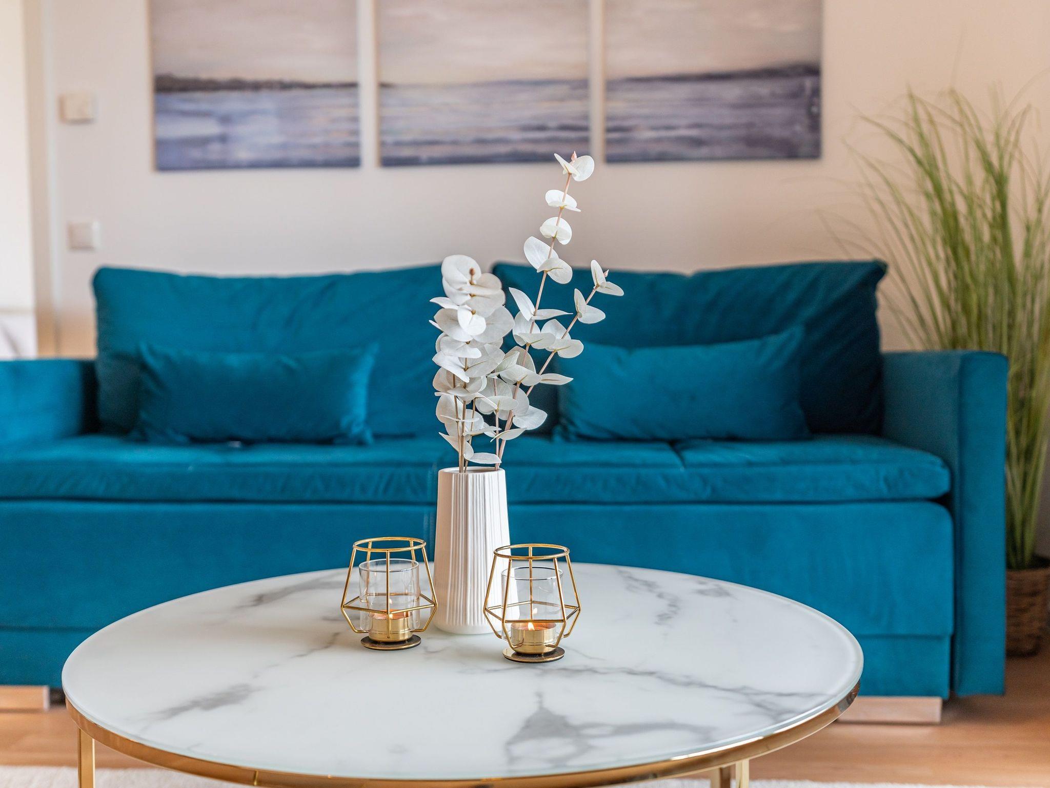 Der offene Wohnbereich ist ausgestattet mit einem gemütlichen Sofa und Smart-TV. Sie haben vom Wohn- und Schlafzimmer aus Zugang zum großen Süd-Balkon. Der möblierte Balkon mit traumhaften Ausblicken auf das Stettiner Haff bietet auch aus der zweiten Reihe einen wunderschönen Ort, um Ihre Mahlzeiten zu genießen und die Aussicht zu bewundern.