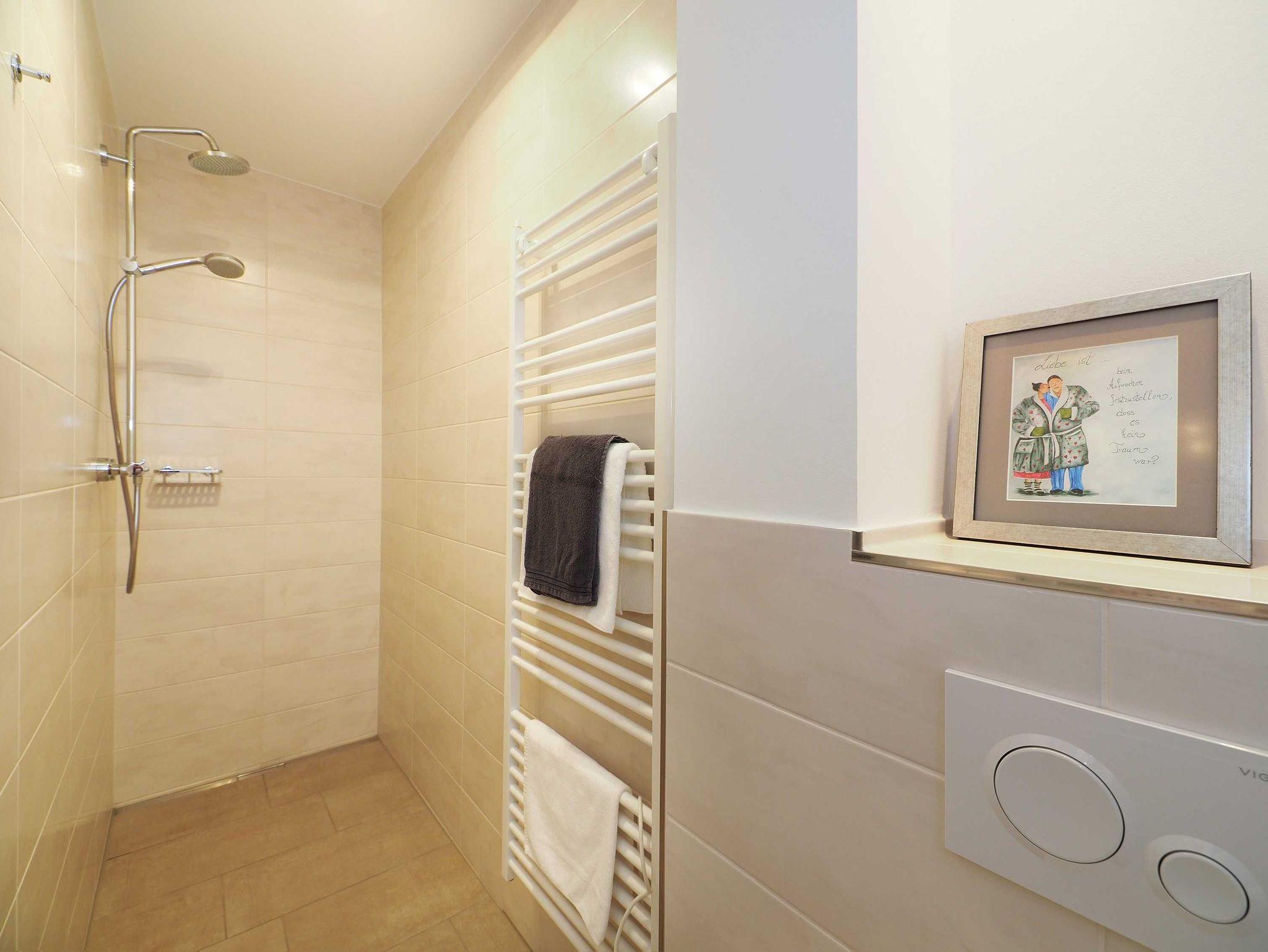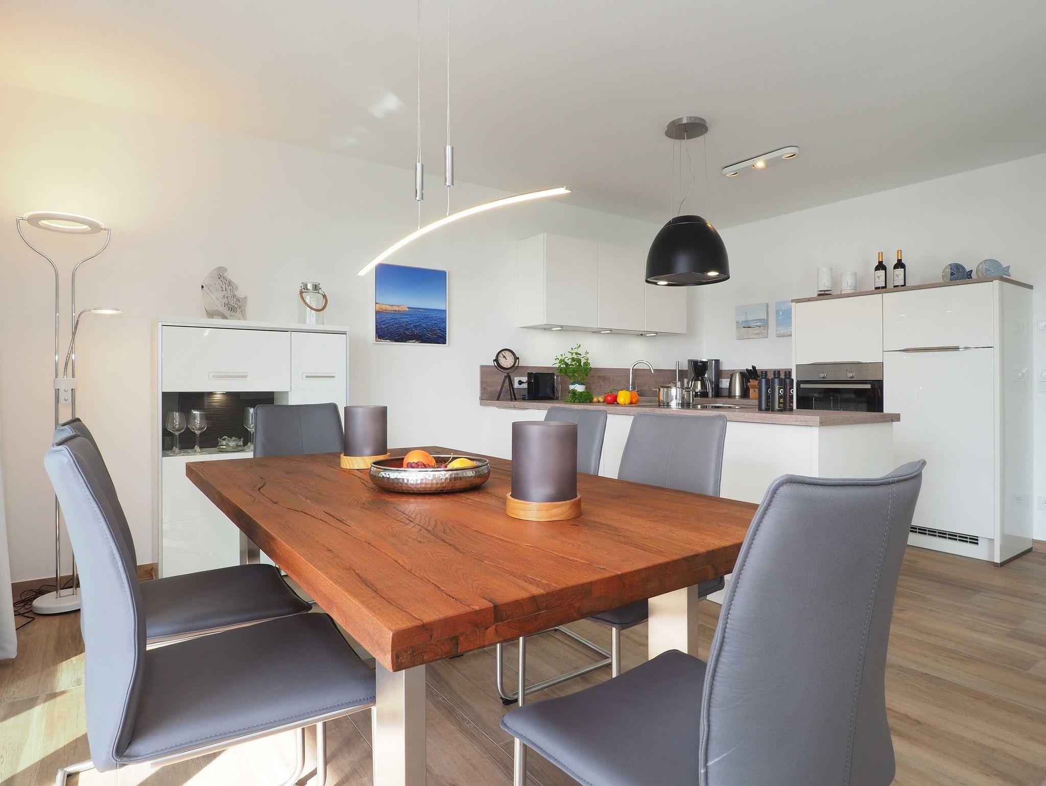 Diese lichtdurchflutete, helle 4-Zimmer-Wohnung im obersten Geschoss von Haus 5 (Aufzug vorhanden) mit Platz für maximal 6 Personen verfügt über eine Wohnfläche von 100 m² und hat 3 Schlafzimmer sowie 2 voll ausgestattete Duschbäder. Die große Sonnenterrasse mit 17 m² liegt in idealer Süd-Ausrichtung. Die Wohnung ist modern eingerichtet mit offenem Wohn-Essbereich, großem Esstisch, Ledersofa sowie Smart-TV (inkl. Sky-Abo). Die hochwertig ausgestattete Küche, offen zum Wohnbereich, lässt keine Wünsche offen. Erholsamer Schlaf in den beiden Schlafzimmern mit Boxspringbetten und Smart-TV ist garantiert. Im dritten Schlafzimmer befindet sich ein bequemes Schlafsofa (Liegefläche: 1,60 x 2,00 m), Schreibtisch und Smart-TV. Das Badezimmer en Suite ist mit einer begehbaren Dusche ausgestattet. Auf dem großen, überdachten Sonnenbalkon mit Essgruppe und zwei Relax-Sesseln, Fußhockern sowie einem Sonnenschirm können Sie die Seele baumeln lassen.