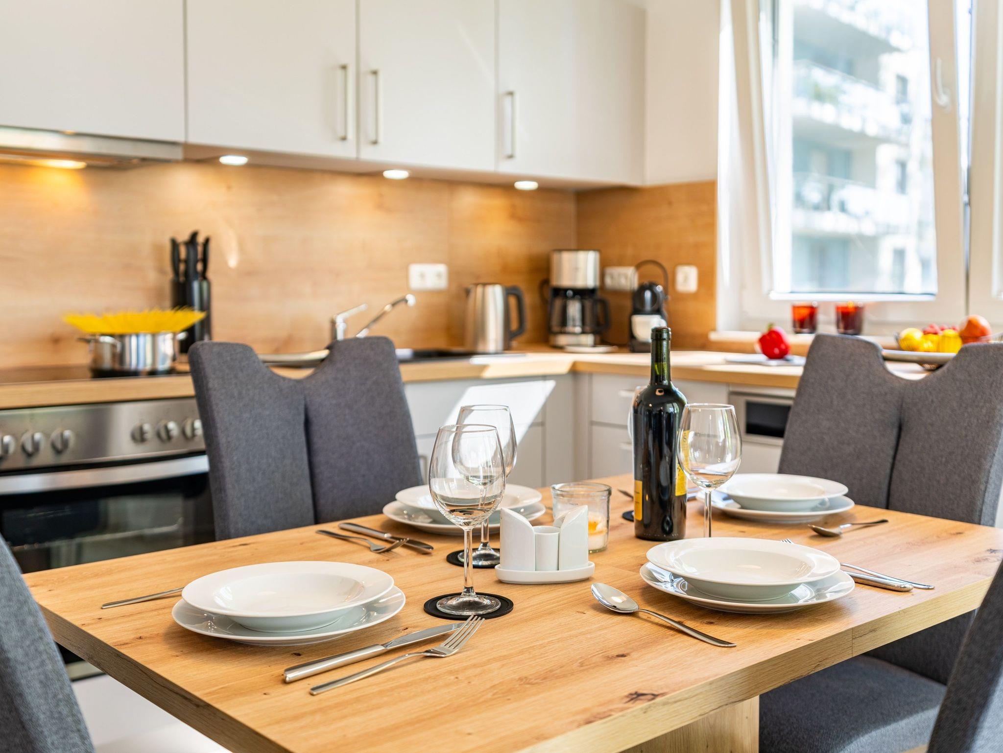 Die Küchenzeile verfügt über hochwertige Geräte wie Herd, Kaffeefiltermaschine, Nespresso-Maschine, Handmixer, Milchaufschäumer, Backofen, Kühlschrank mit Gefrierfach sowie Spülmaschine. Ausreichend Geschirr, Besteck sowie Töpfe und Pfannen befinden sich in den Schränken. Am Esstisch finden Sie vor einem erholsamen Urlaubstag zu einem gemeinsamen Frühstück zusammen.