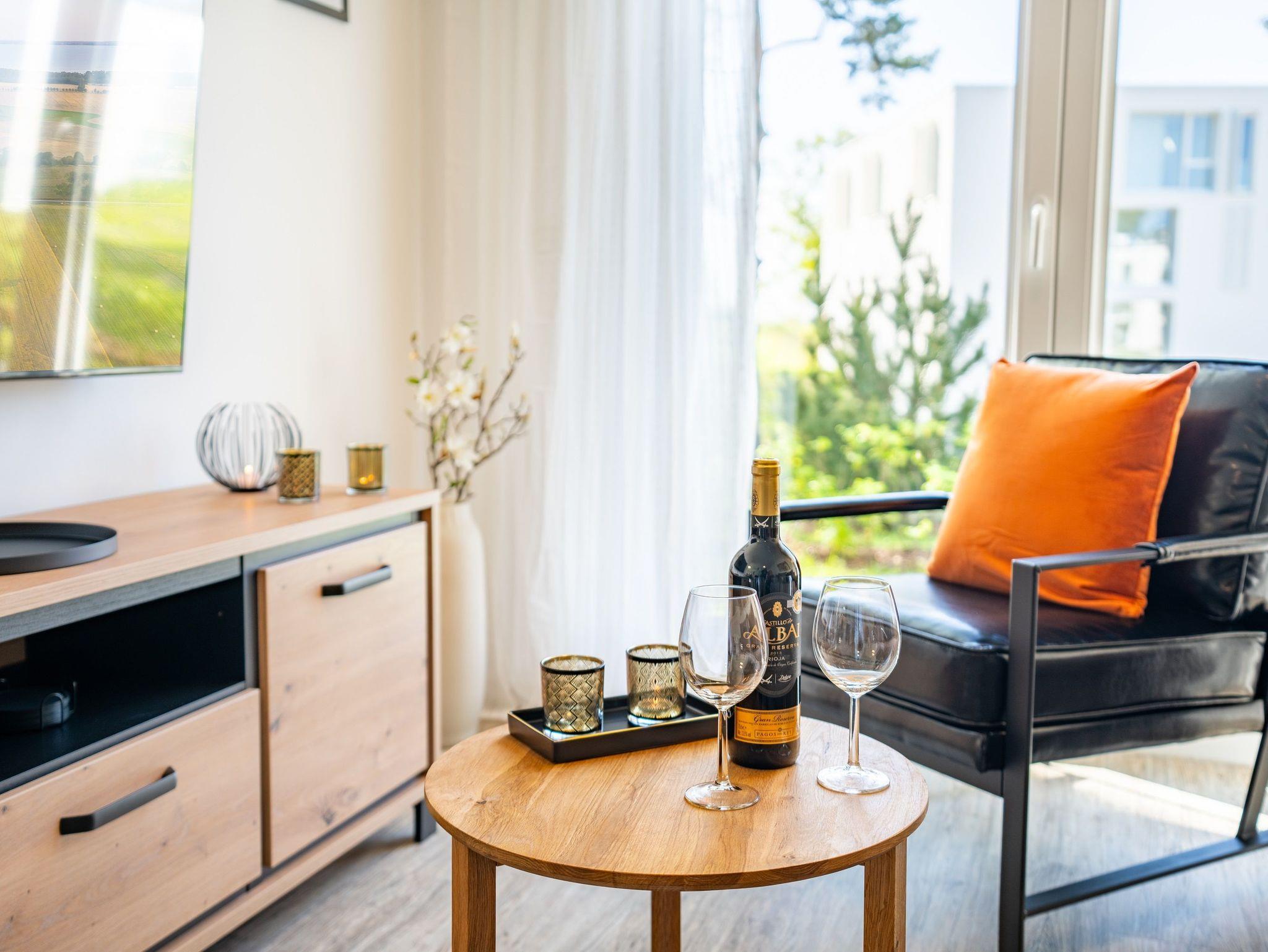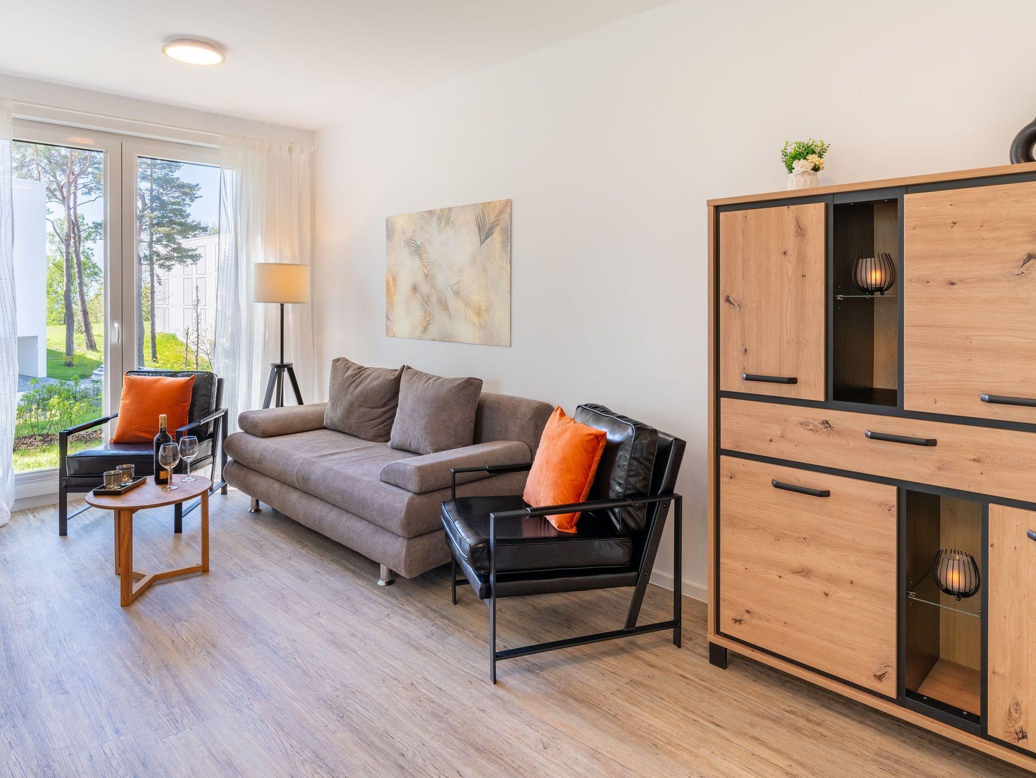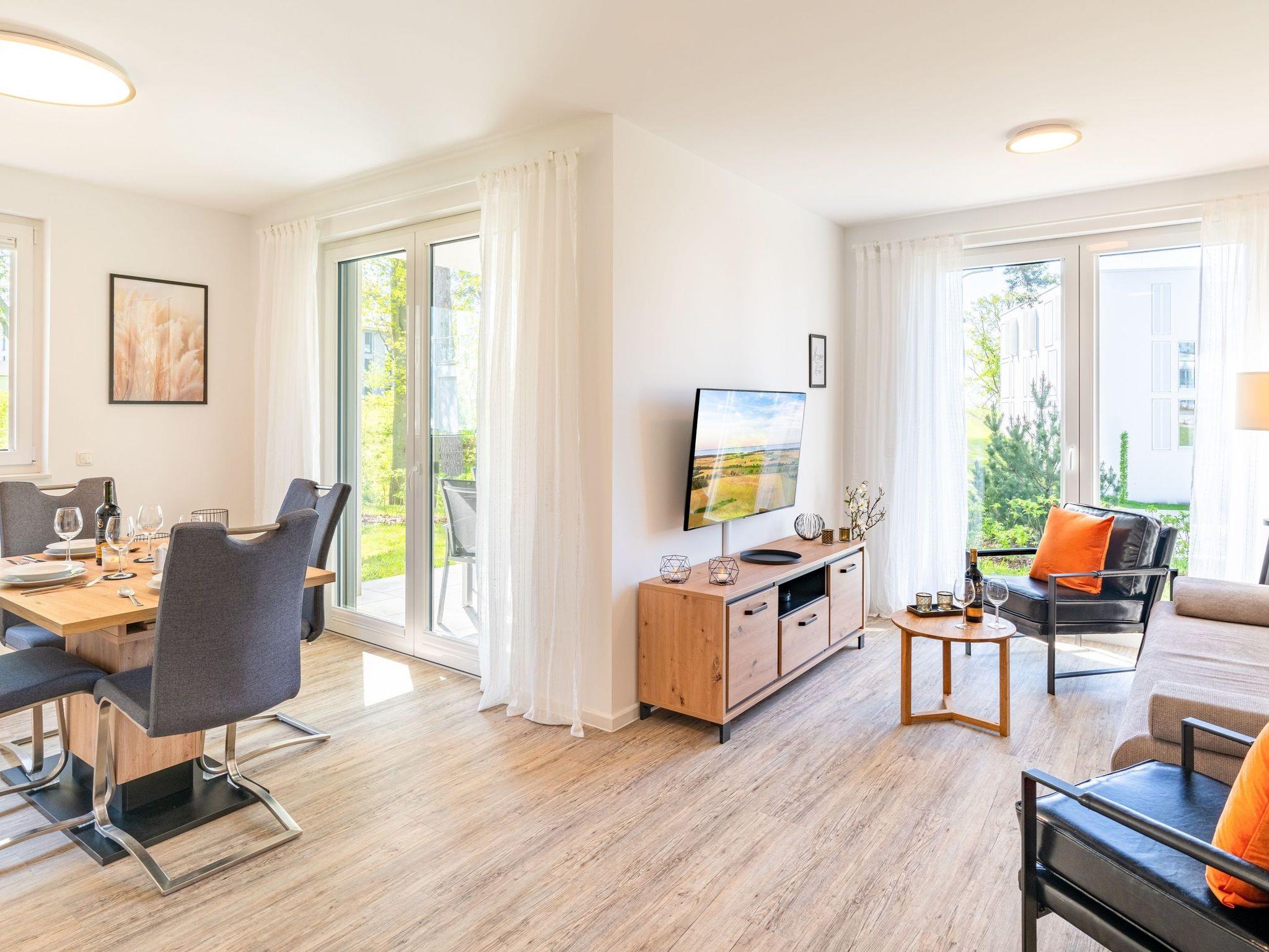Der offen gestaltete Wohnbereich ist mit einem Sofa, zwei Sesseln und Smart-TV ausgestattet. Sie haben vom Wohnzimmer aus Zugang zur Südost-Terrasse. Genießen Sie Ihre Speisen auf der möblierten Terrasse mit traumhaften Ausblicken in die Gartenanlage.