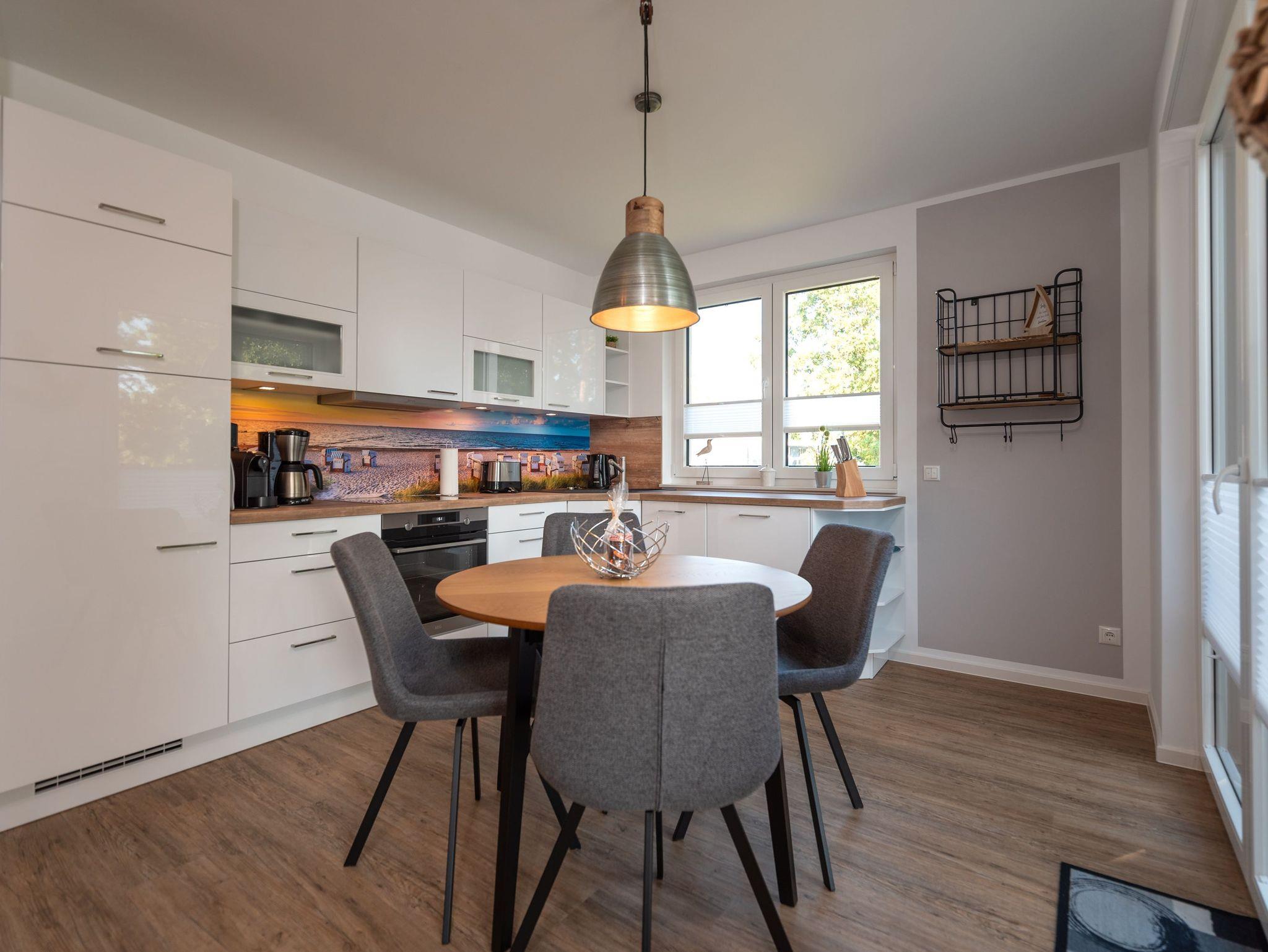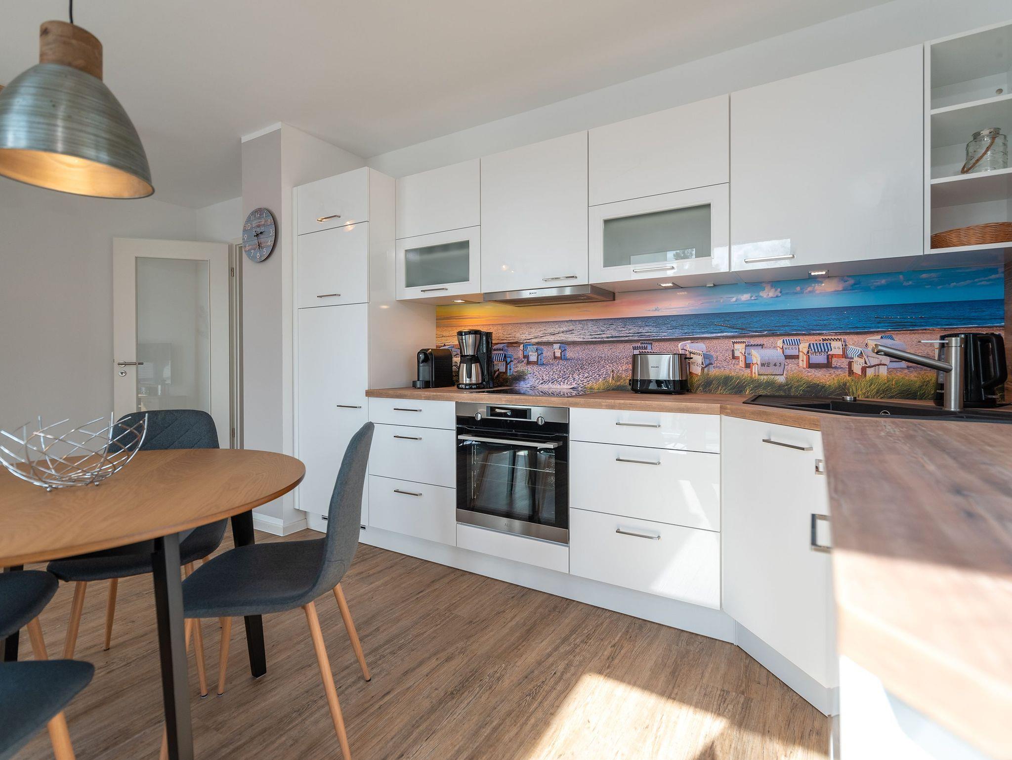 Die vollausgestattete Küchenzeile ist mit hochwertigen Geräten wie Herd, Backofen, Mikrowelle, Kühlschrank mit Gefrierfach sowie einer Spülmaschine ausgestattet. Ausreichend Geschirr und diverse Küchenhelfer befinden sich in den Schränken. Eine Kaffeefiltermaschine und eine Kapselmaschine versorgen Sie am frühen Morgen oder zum Nachmittag mit duftendem Kaffee. Ausreichend Stauraum für eigene Utensilien ist ebenfalls vorhanden.