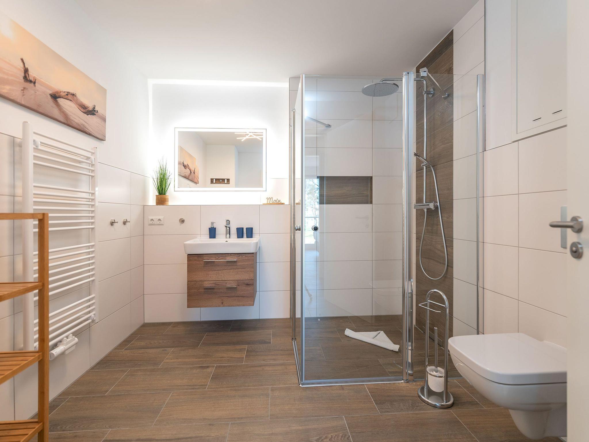 Das Badezimmer ist mit einer extragroßen, ebenerdigen Dusche (120x120cm mit Regendusche und Handbrause), Waschtisch und einem Fön ausgestattet. Im Abstellraum finden Sie im großzügigen Regal ausreichend Platz für Ihre Strandutensilien oder Vorräte. Reinigungsutensilien (Staubsauger, Besen und Bodenwischer) sind dort ebenso zu finden, wie Wäscheständer, Bügelbrett und Bügeleisen.