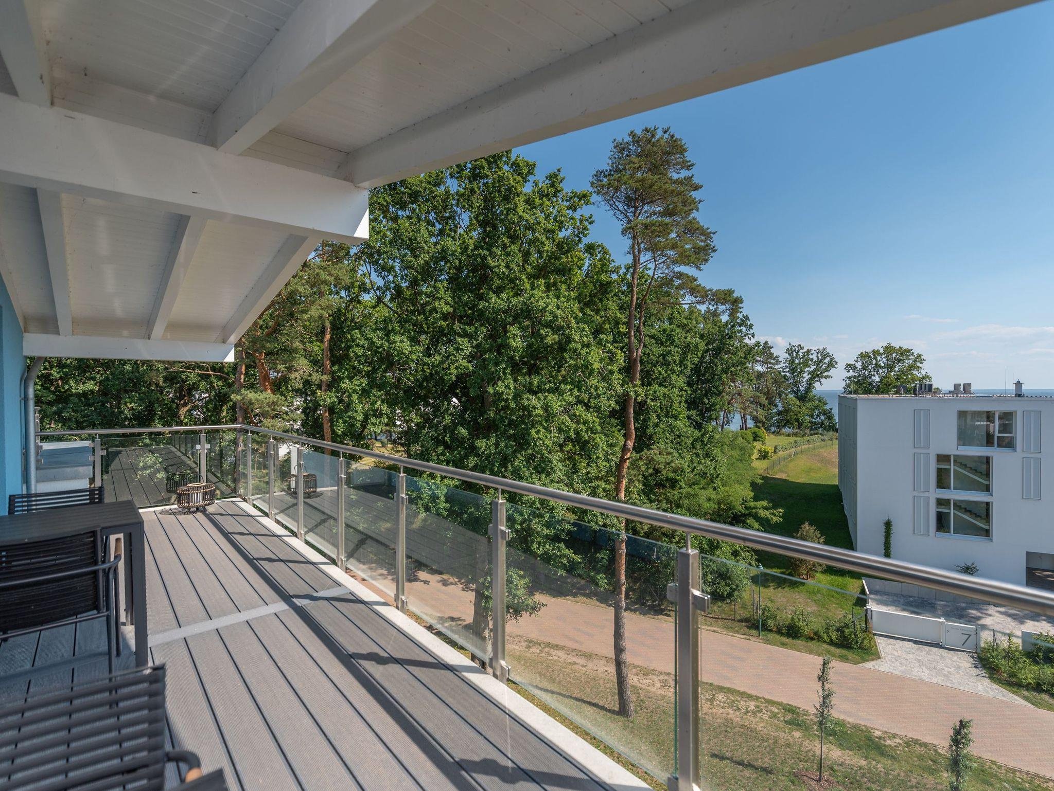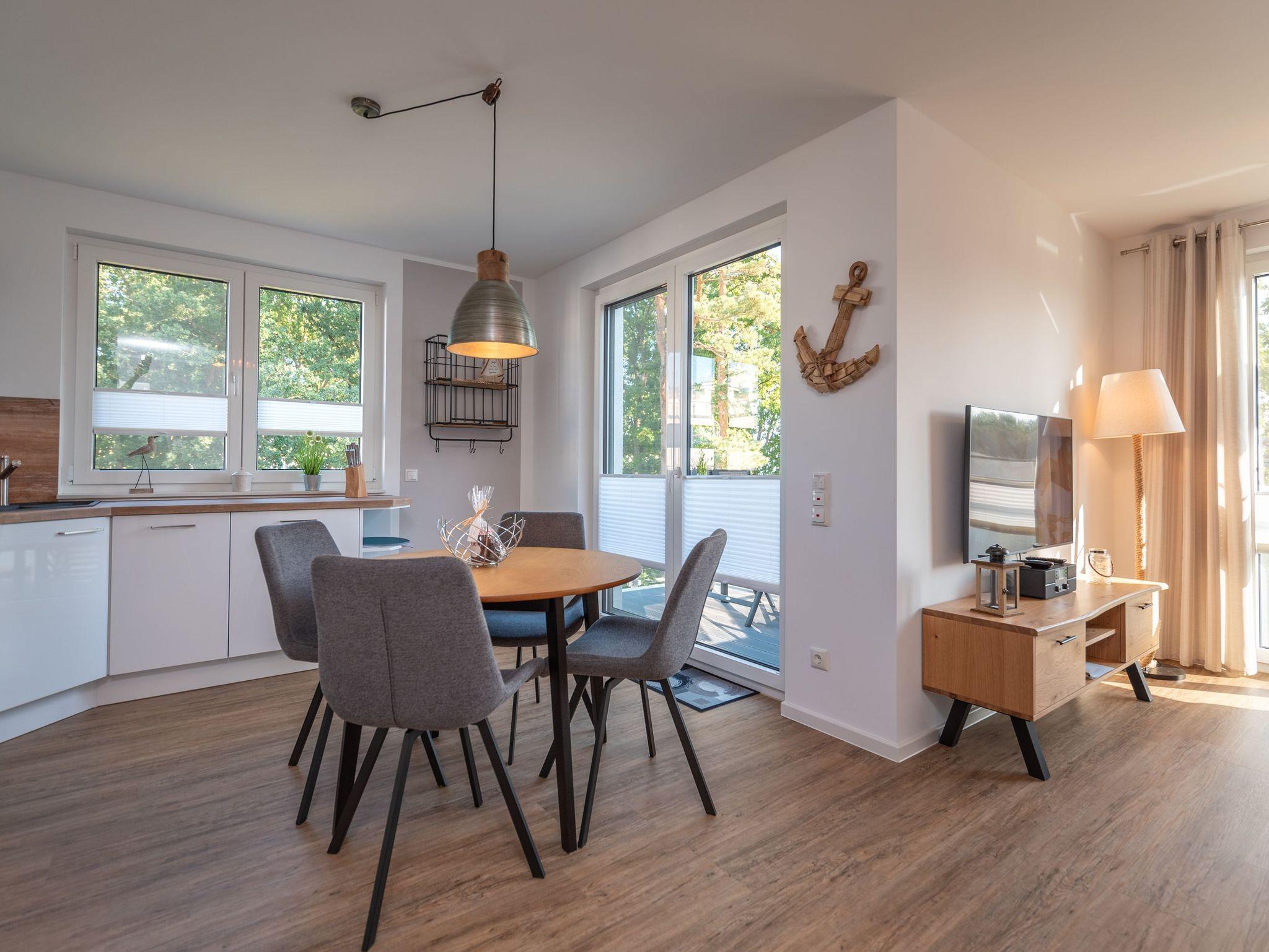 Der offene Wohnbereich ist mit einem gemütlichen Sofa und Smart-TV ausgestattet. Über das Internet-Radio, mit induktiver Ladefunktion für Mobiltelefone, lauschen Sie Ihrer Lieblingsmusik oder Podcasts. Über Bluetooth können Sie auch Ihren eigenen Musikstream abspielen. Genießen Sie ein entspanntes Buch auf dem gemütlichen Sofa mit Leselampe und wundervollem Blick in die Natur. Sie haben vom Wohnzimmer aus Zugang zum Süd-Balkon. Starten Sie Ihren Tag bei einem schönen Frühstück in der Morgensonne auf dem möblierten Balkon mit traumhaften Ausblicken auf das Stettiner Haff und die Natur aus der zweiten Reihe.