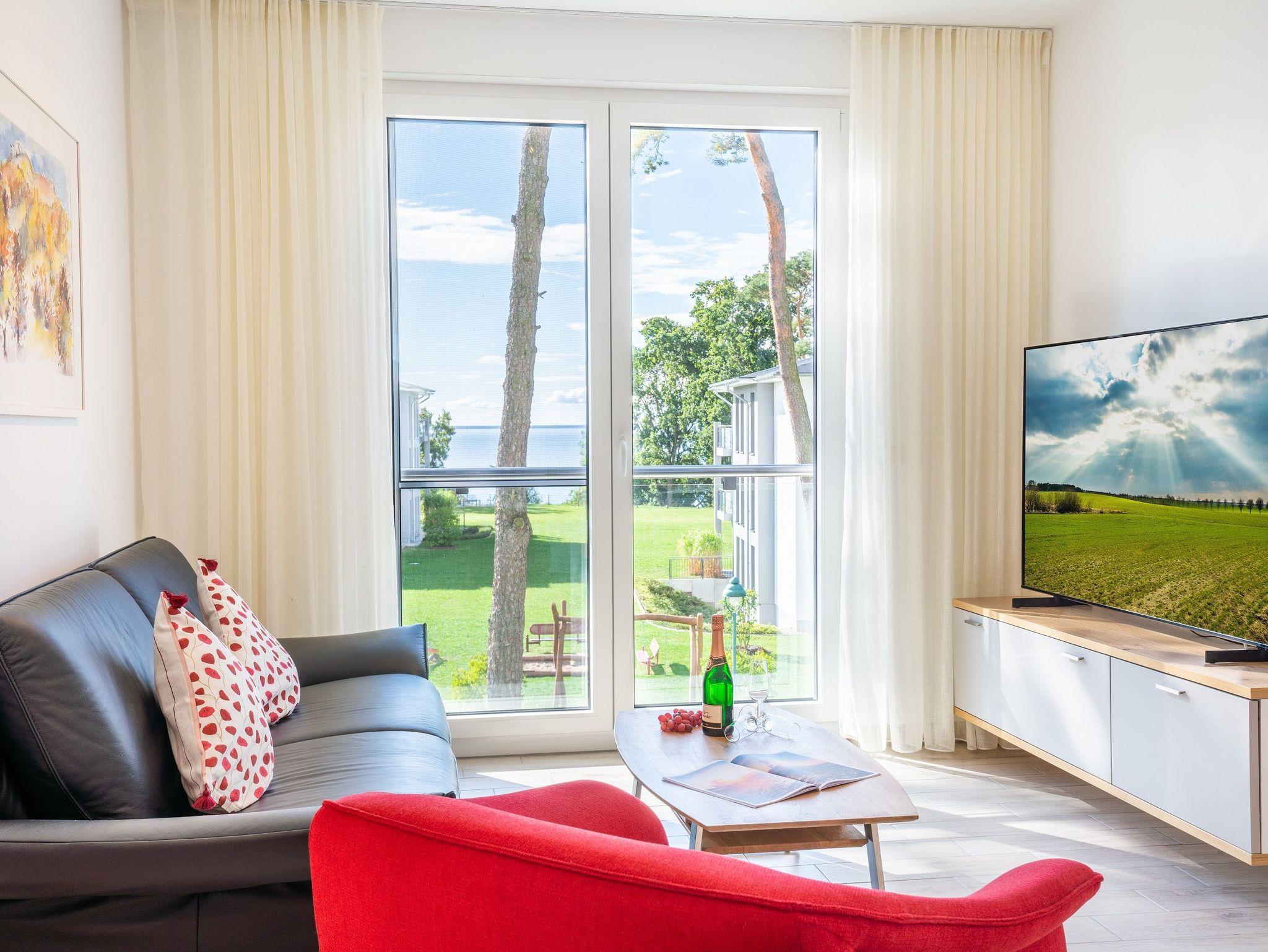 Der offen gestaltete Wohnbereich ist mit einem komfortablen Sofa und Sessel sowie Smart-TV ausgestattet. Sie haben vom Wohnzimmer aus Zugang zum Südwest-Balkon. Der möblierte Balkon mit traumhaften Ausblicken auf das Stettiner Haff bietet auch aus der zweiten Reihe einen wunderschönen Ort, um Ihre Mahlzeiten zu genießen und die Aussicht zu bewundern.