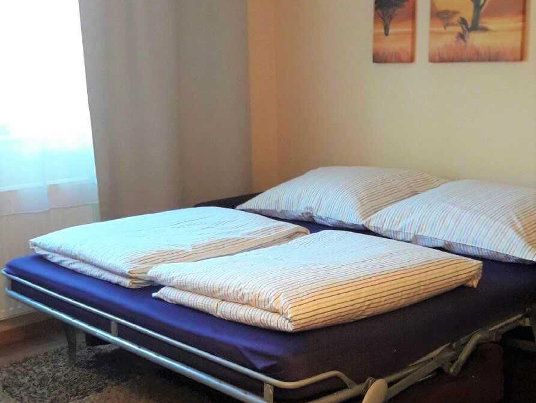 Im Wohnzimmer bietet ein hochwertiges Schlafsofa (Liegefläche 160 x 200 cm) mit vollwertiger Matratze eine Ausweichschlafmöglichkeit.