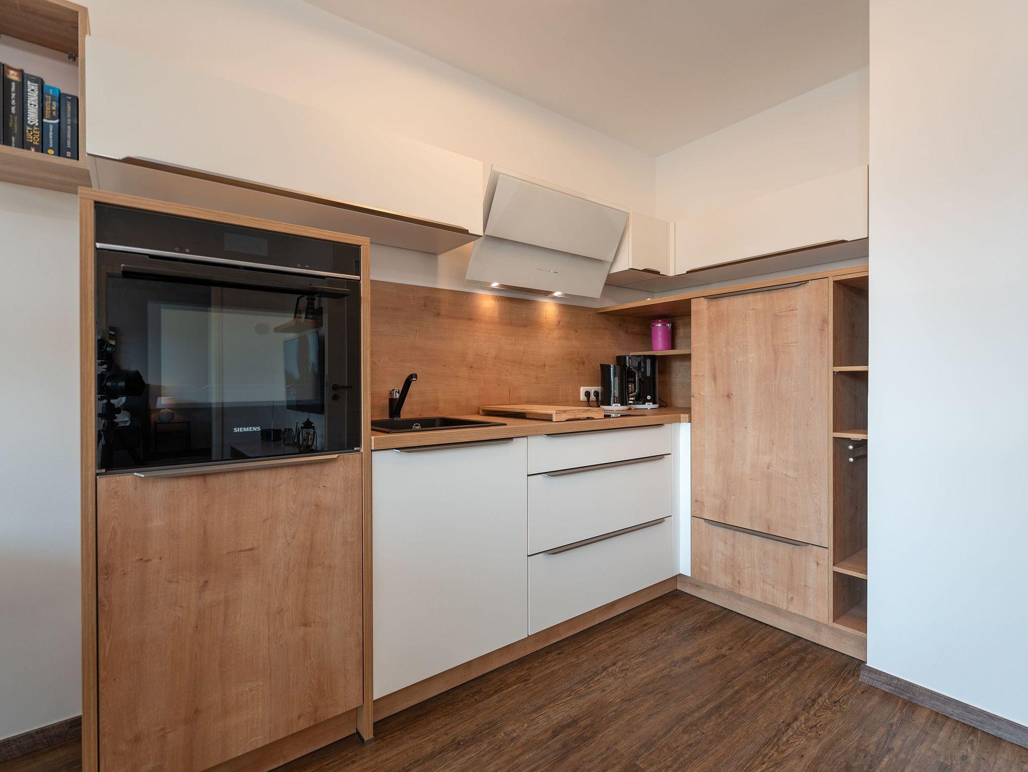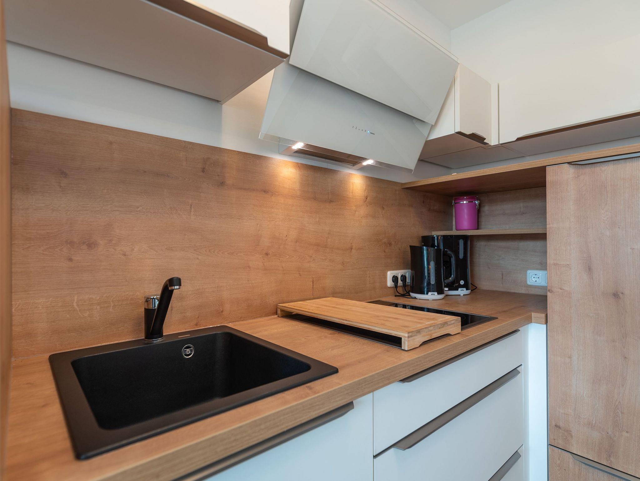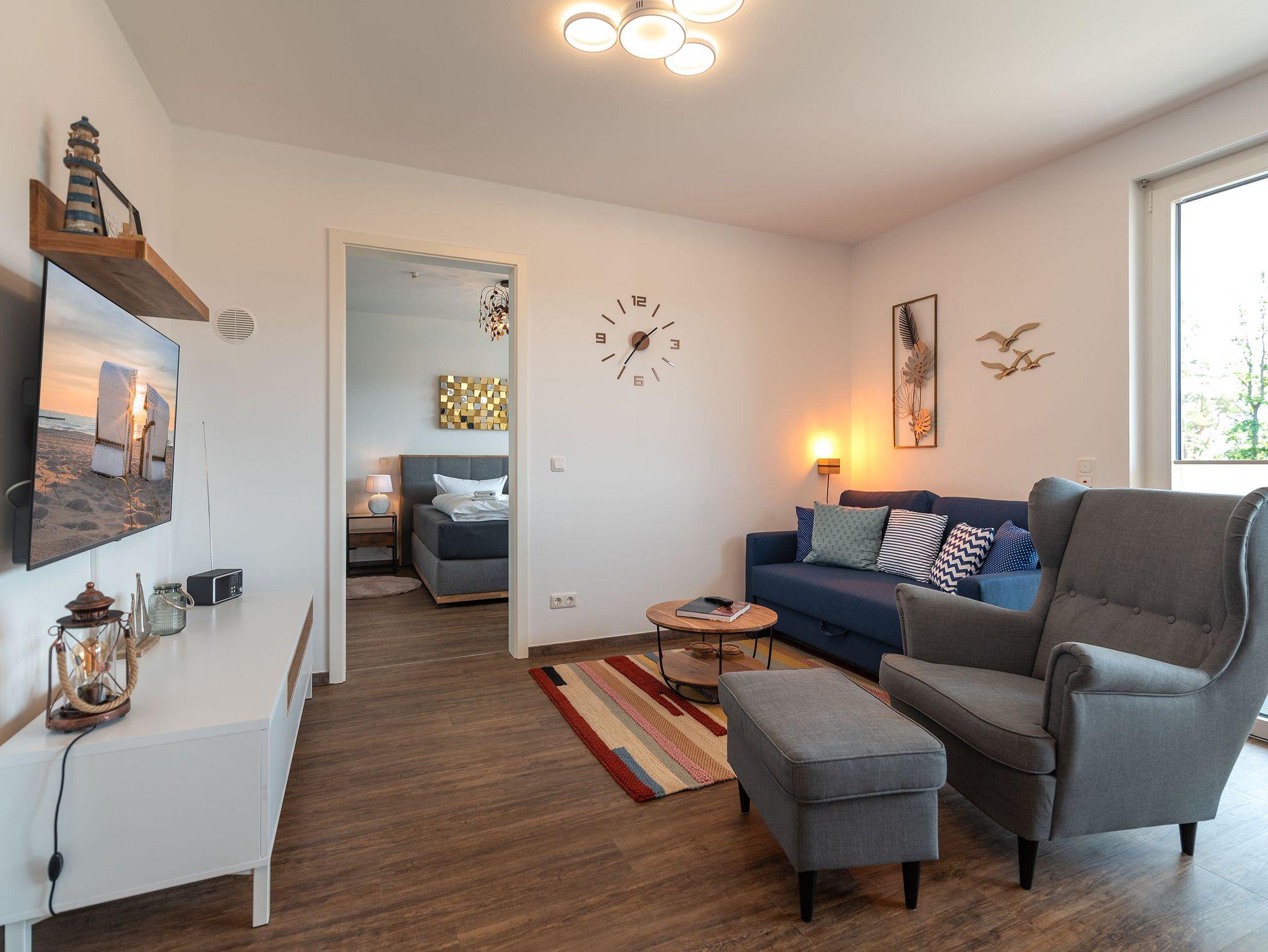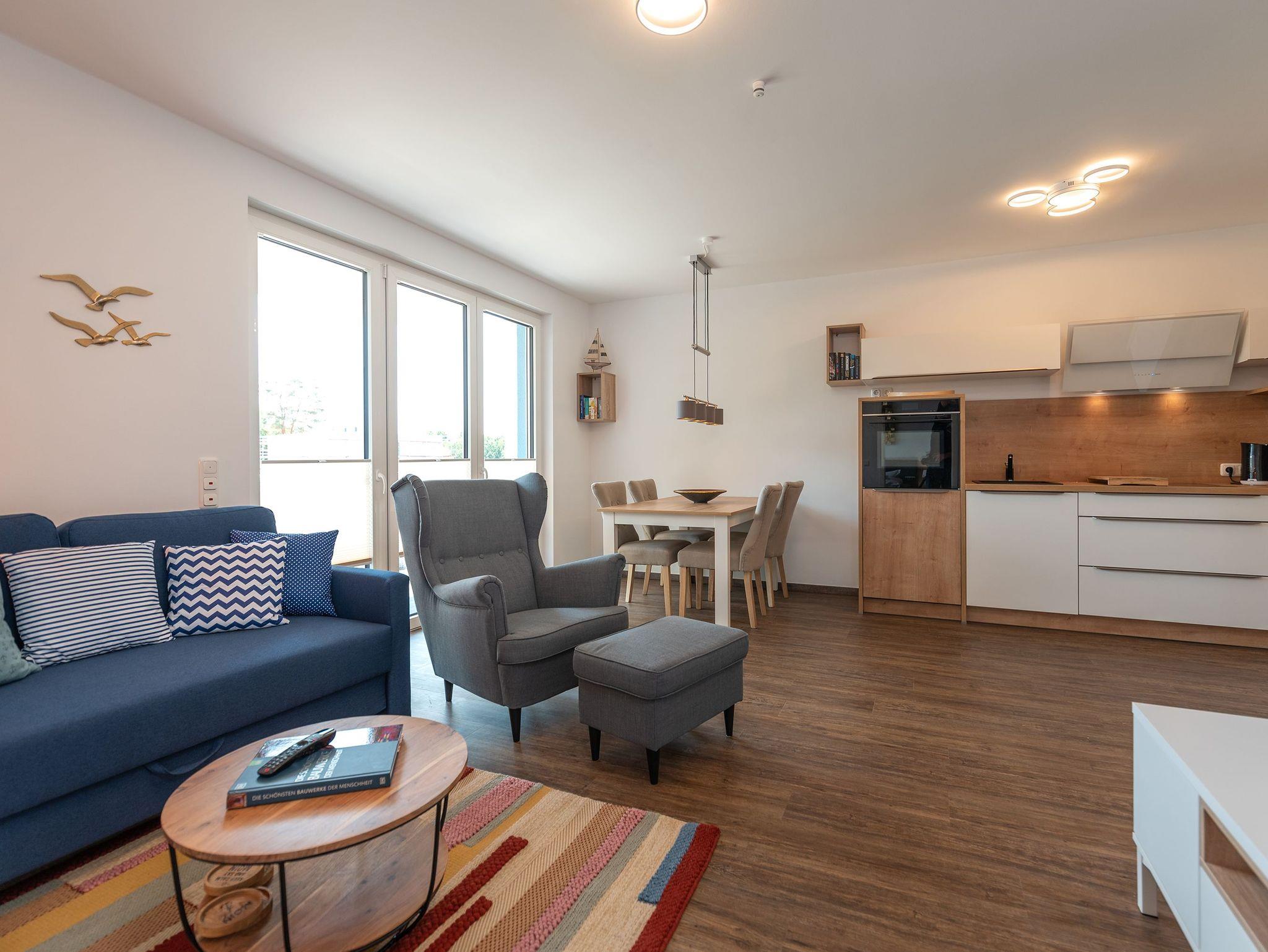 Das hell und modern eingerichtete Wohnzimmer verfügt über eine bequeme Couch, die sich zu einer Schlafcouch (140 cm x 200 cm) umwandeln lässt, und einen 55-Zoll Flatscreen Fernseher. Die offene Küche ist hochwertig ausgestattet mit einem Backofen mit Mikrowellenfunktion, Ceranfeld, Kühl-/Gefrierkombination, Geschirrspüler und bietet alles Nötige für den gedeckten Tisch am großen Esstisch.