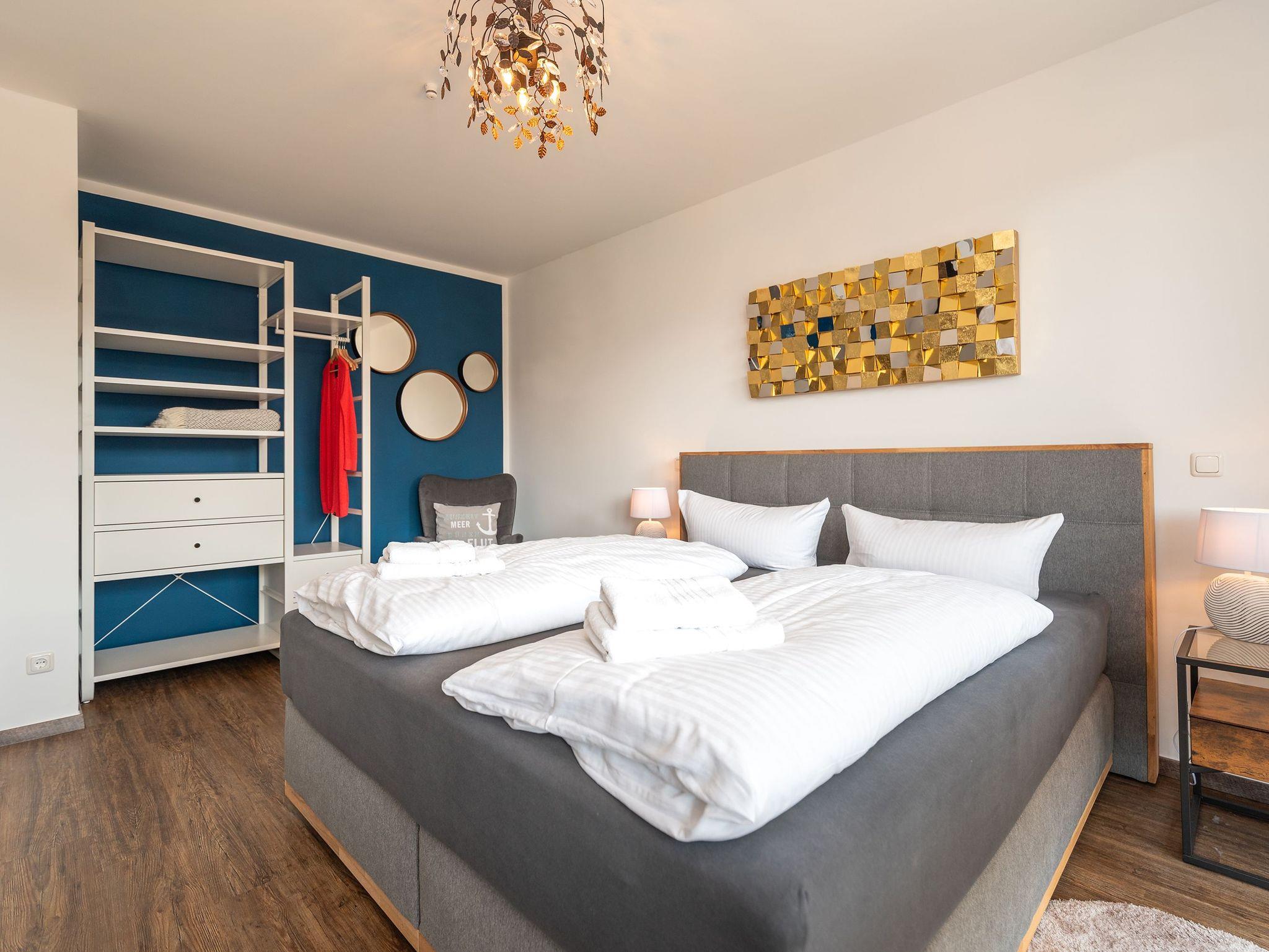 • Schlafzimmer mit Doppelbett und offenem Kleiderschrank