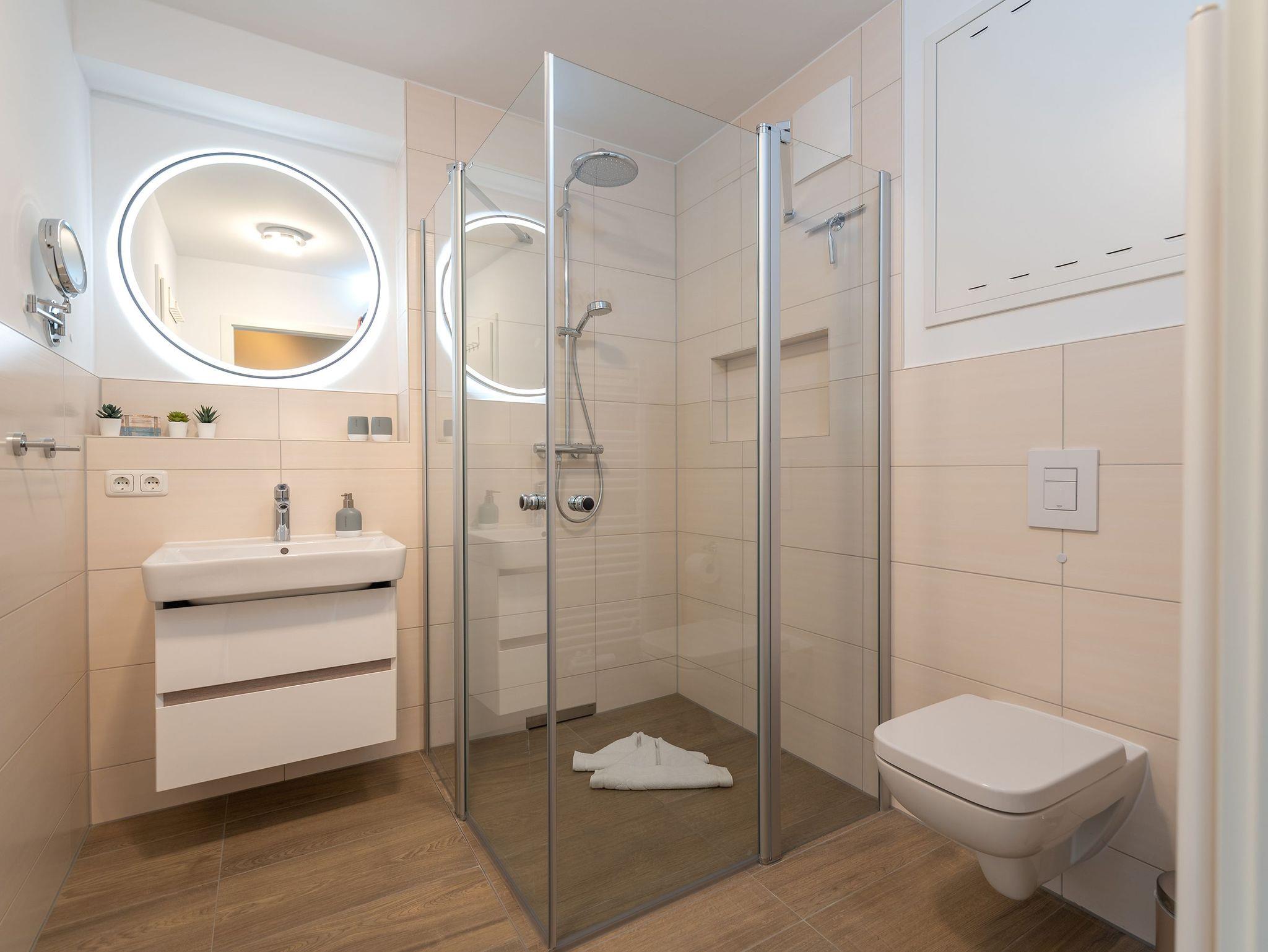 Im Schlafzimmer sorgt ein Boxspringbett (180 cm x 200 cm Liegefläche) für erholsamen Schlaf, und der offene Kleiderschrank bietet ausreichend Stauraum. Das Badezimmer ist mit einer großen ebenerdigen Dusche, WC, Föhn und Handtuchheizung ausgestattet. Fußbodenheizung in allen Räumen sorgt für Wärme und Komfort.