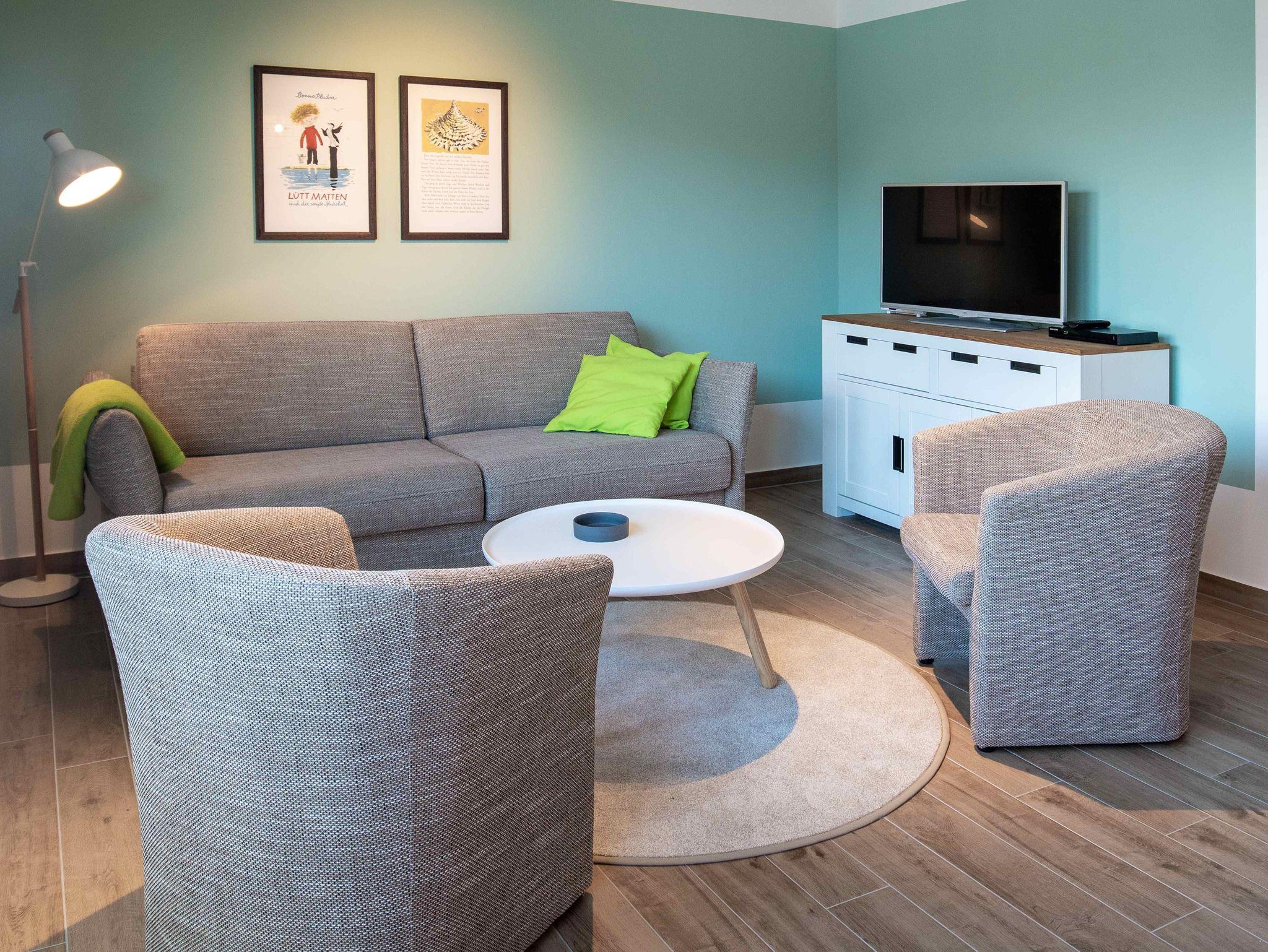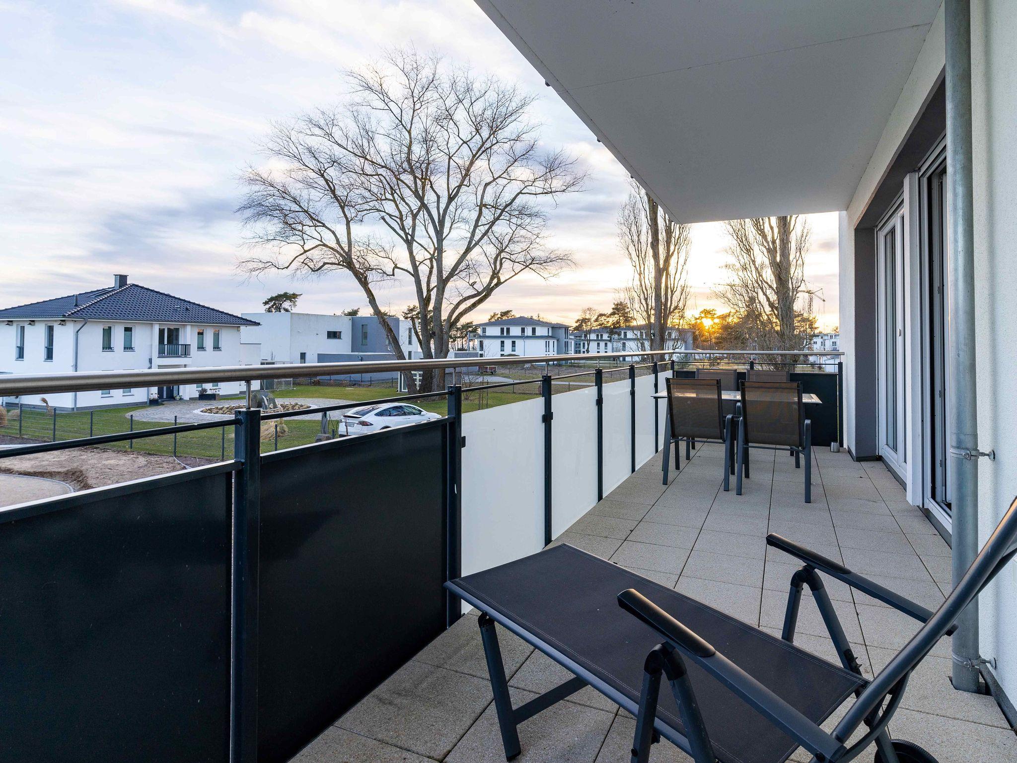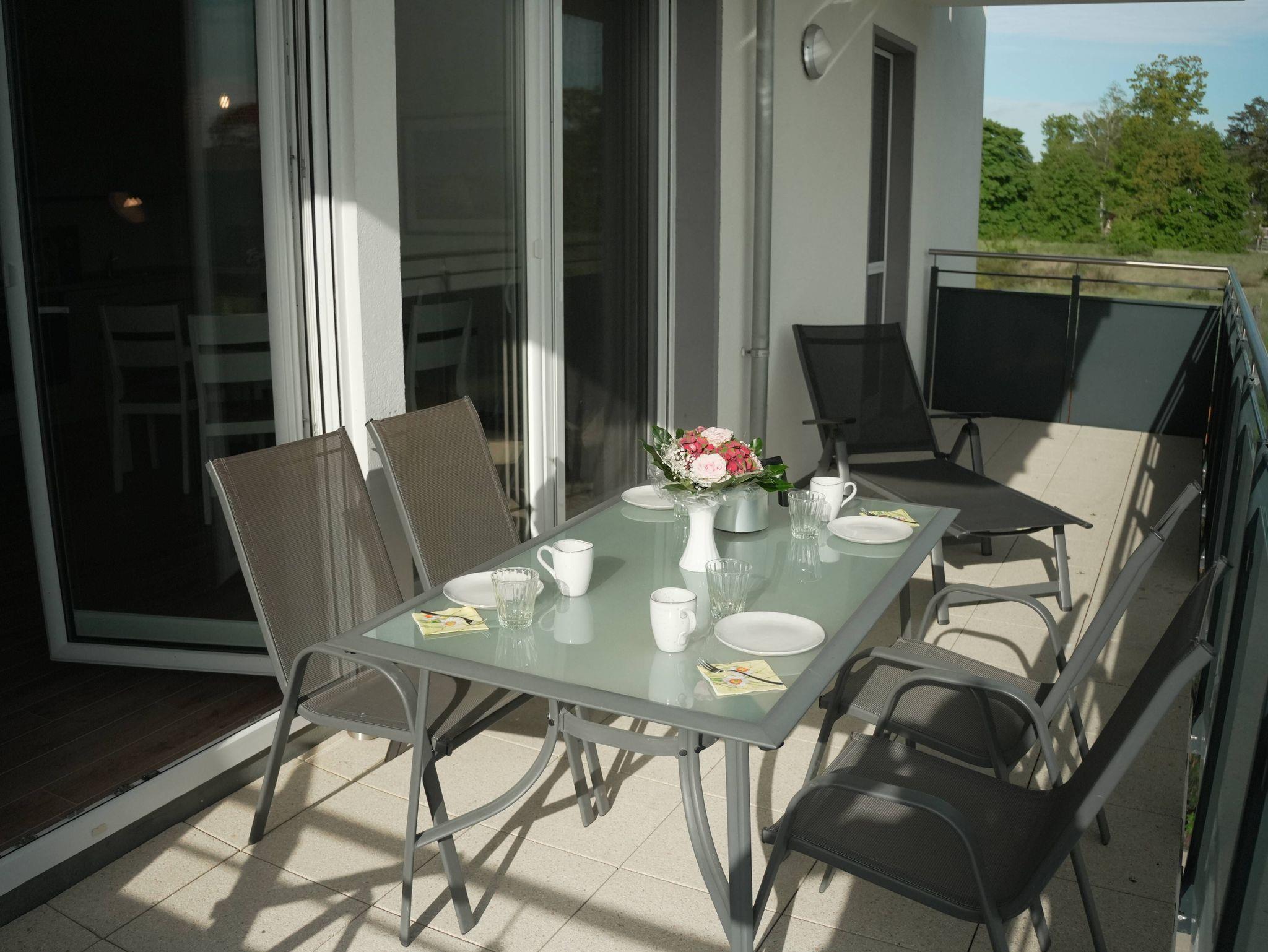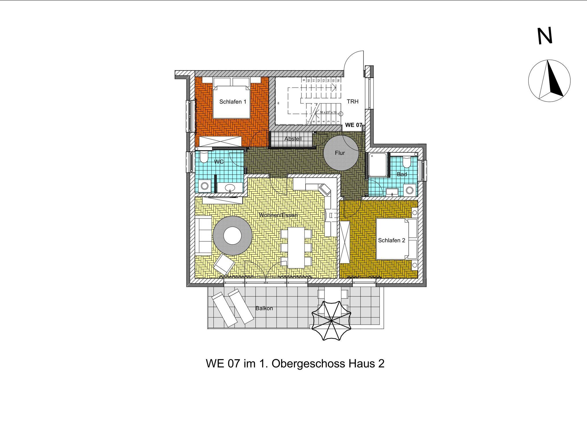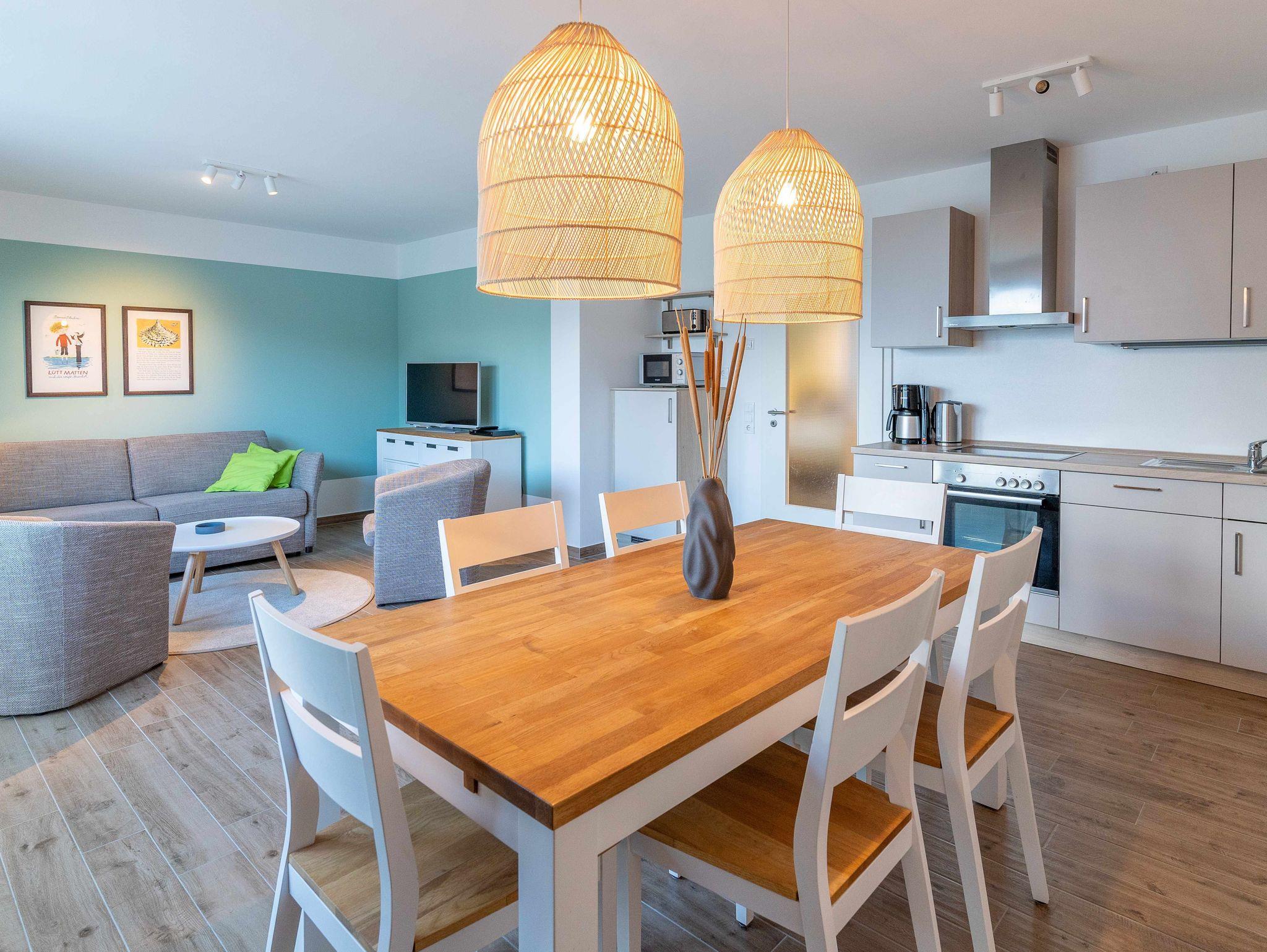 Unsere Ferienwohnung ist großzügig geschnitten und für bis zu 6 Personen geeignet, 1. OG, 83 qm, 2 Schlafzimmer zzgl. Schlafcoach im Wohnzimmer, 2 Balkone, 2 Bäder, Küche