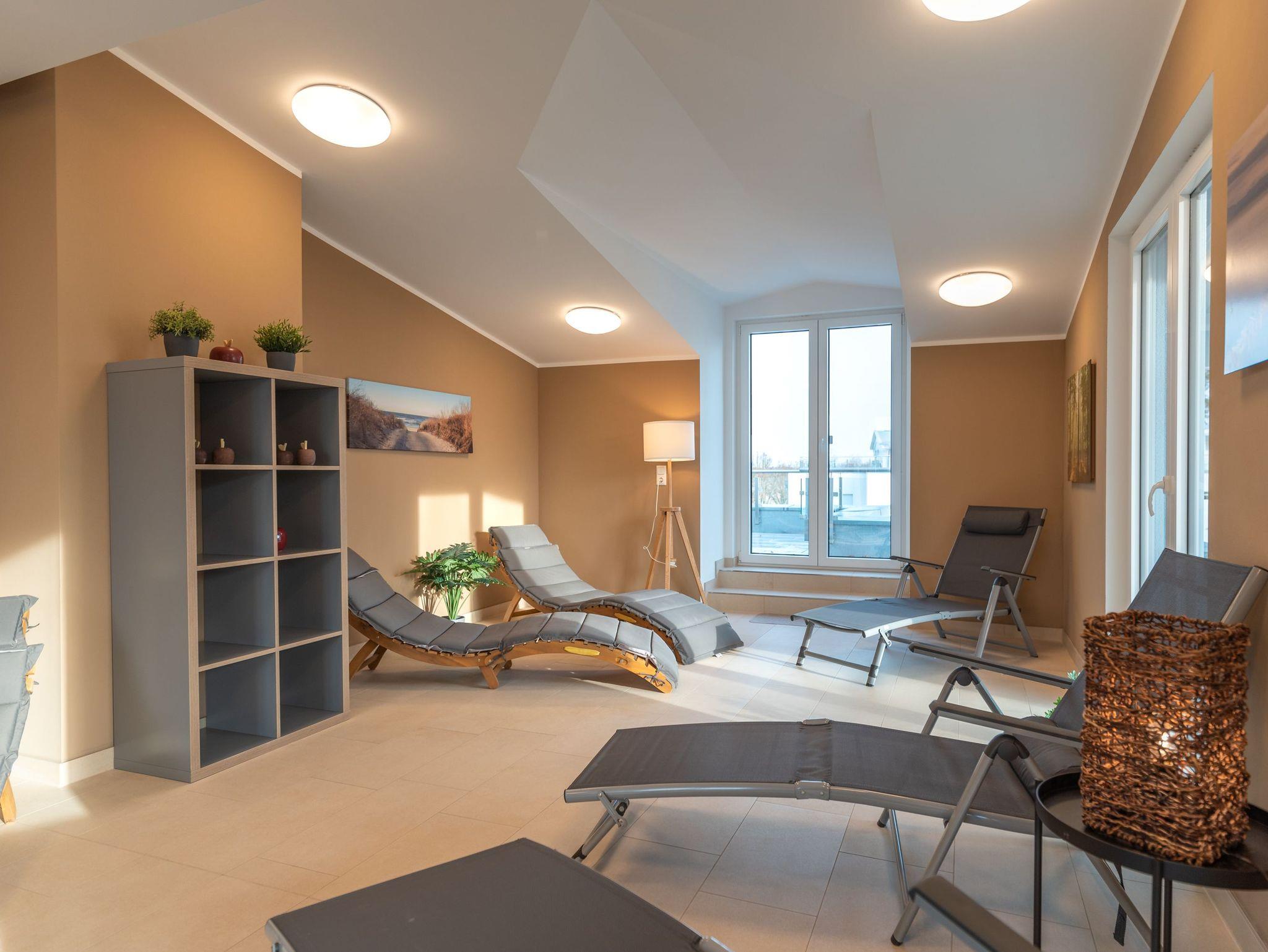 Im 3. Stockwerk des Hauses befindet sich ein Saunabereich, der allen Gästen zur Verfügung steht. Dieser umfasst drei verschiedene Saunen, mehrere Duschen, Sanitäranlagen und einen Ruheraum mit Liegen. Bei schönem Wetter können Sie von der Dachterrasse aus die wundervolle Aussicht auf die Umgebung und das Haff genießen. Im Untergeschoss des Nachbarhauses erwartet Sie ein Gemeinschaftsbereich mit Tischtennis, Airhockey, Kicker, Billard, einem kleinen Fitnessraum sowie einer Spielecke für Kinder. Die Nutzung der Saunen und des Freizeitbereiches sind im Preis inbegriffen.